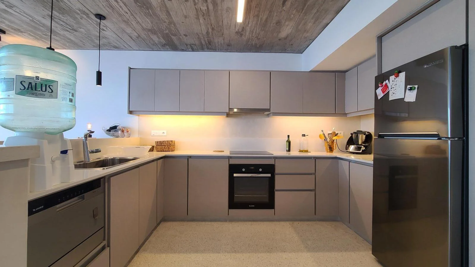 Cocina completa integrada al living comedor con salida directa a la terraza —¡todo con vista al mar!