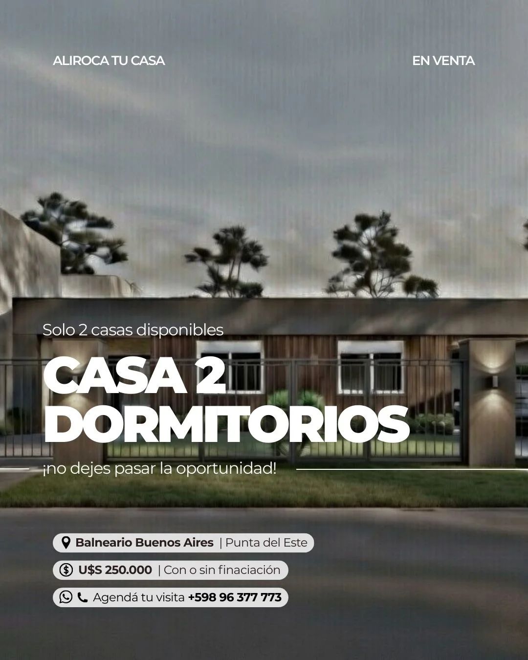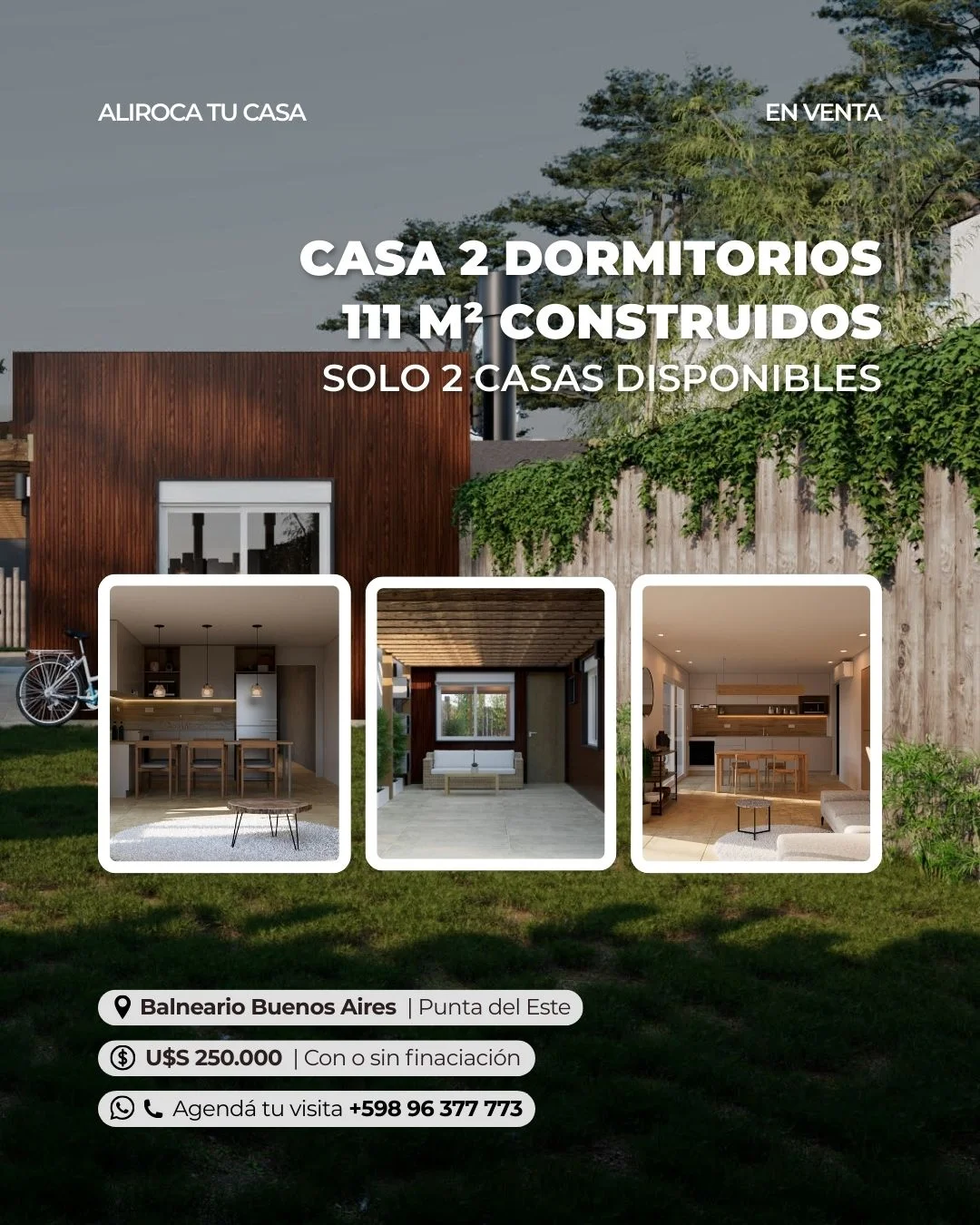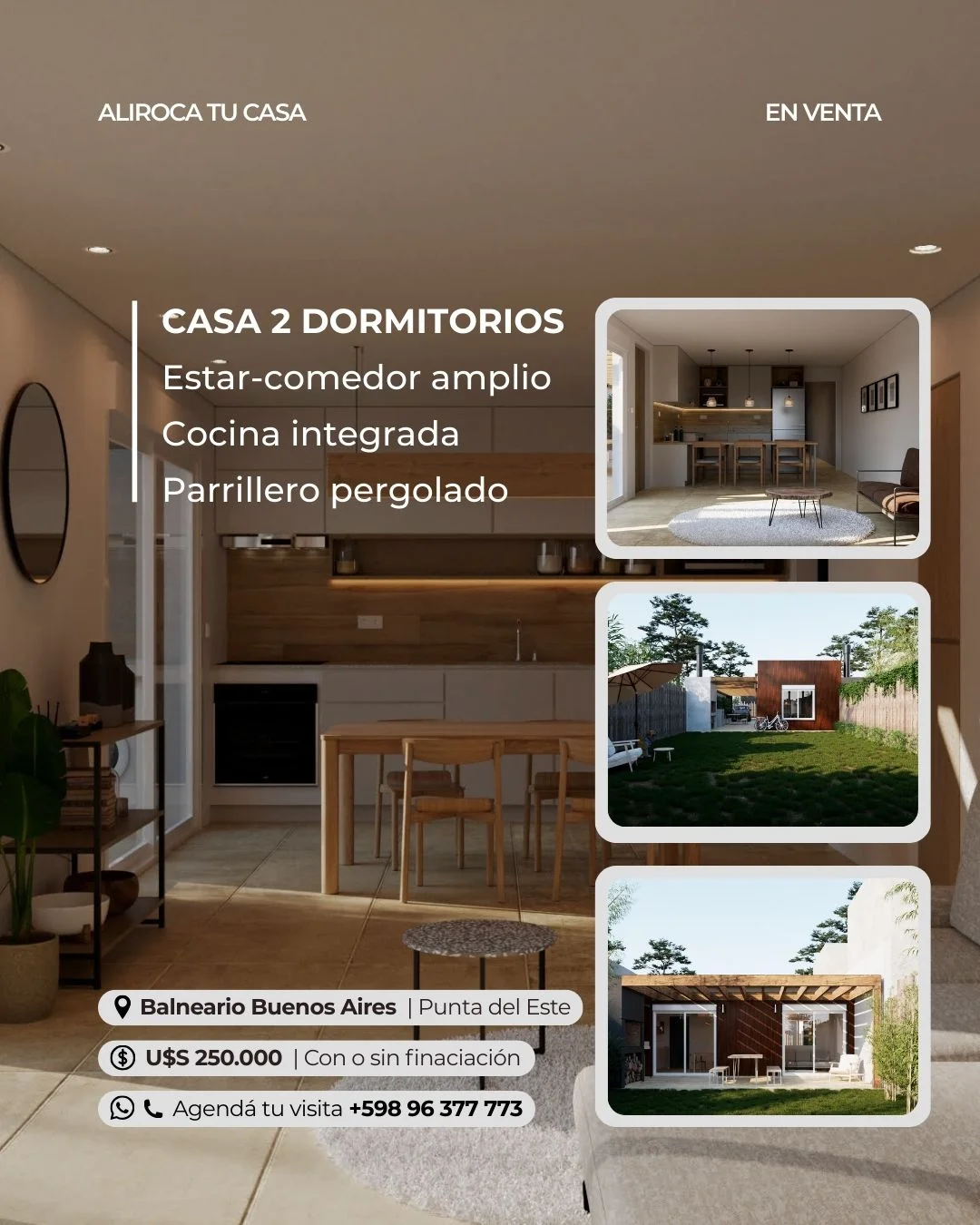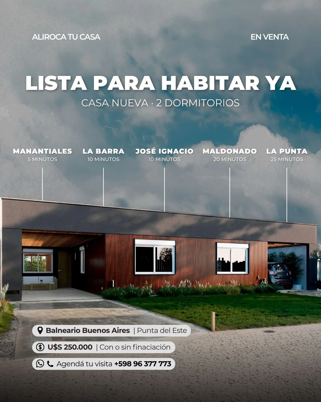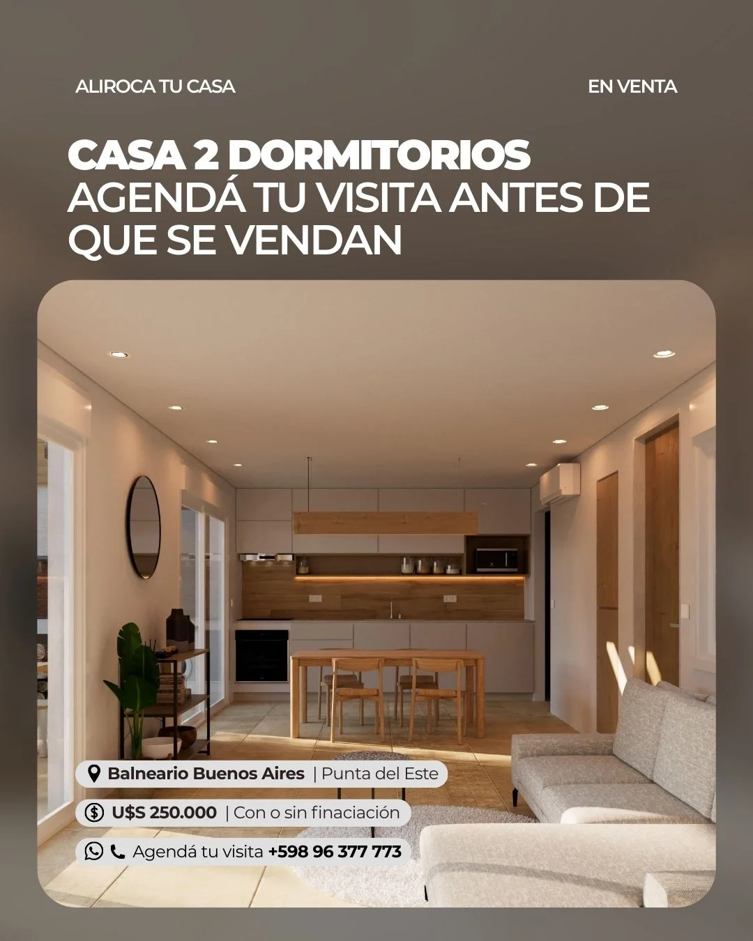 Esta cautivadora propiedad en venta se encuentra ubicada en Maldonado, en Balneario Buenos Aires, brindando un entorno tranquilo y cercano a todos los servicios. La casa de 2 dormitorios y 1 baño ofrece un diseño moderno y funcional, ideal para parejas o pequeñas familias que buscan comodidad y estilo. Con un total de 111 m2, esta vivienda a estrenar cuenta con amenidades que incluyen terraza, lavadero, aire acondicionado y piso de porcelanato, ofreciendo un ambiente acogedor y sofisticado.