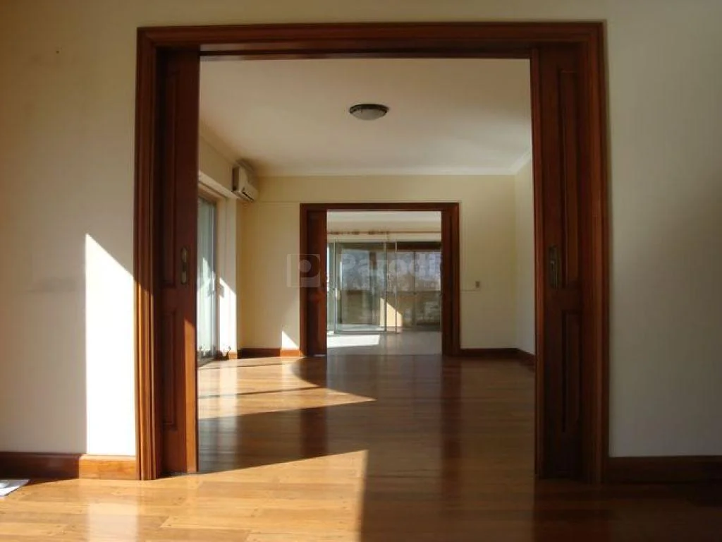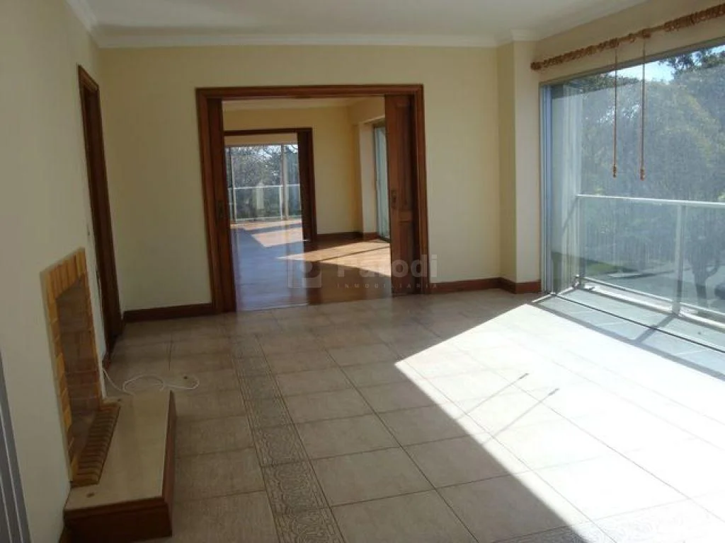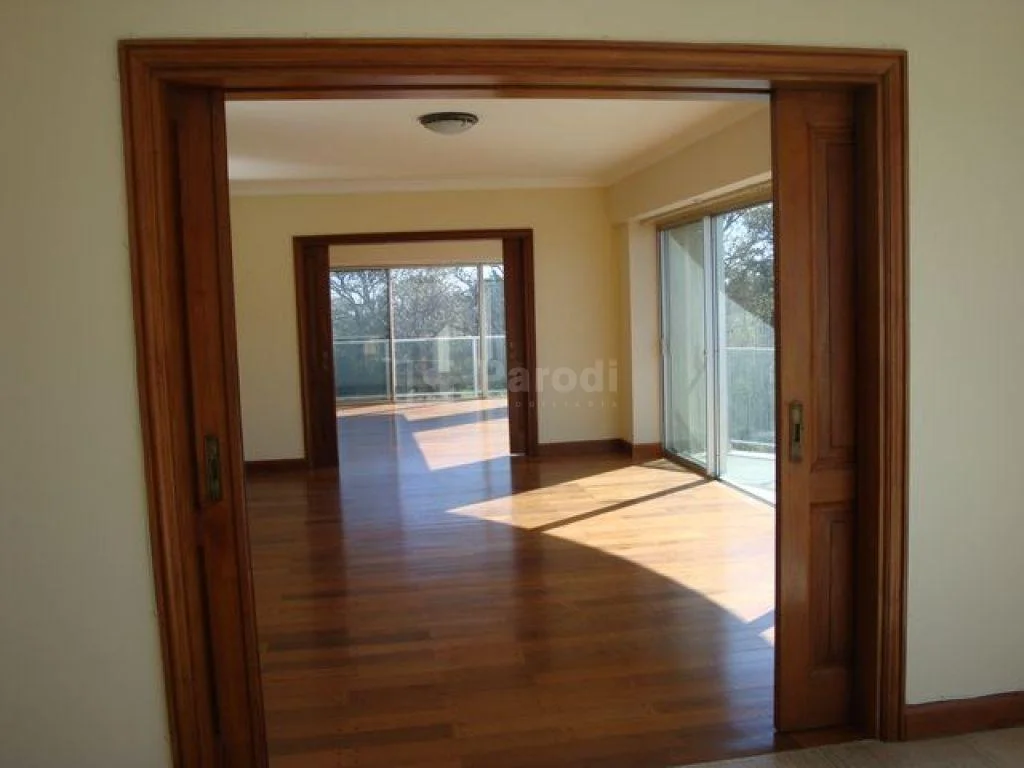 Amplia recepción separado por puertas corredizas en madera (living, comedor y estar). estar con hogar y salida a terraza con parrillero.