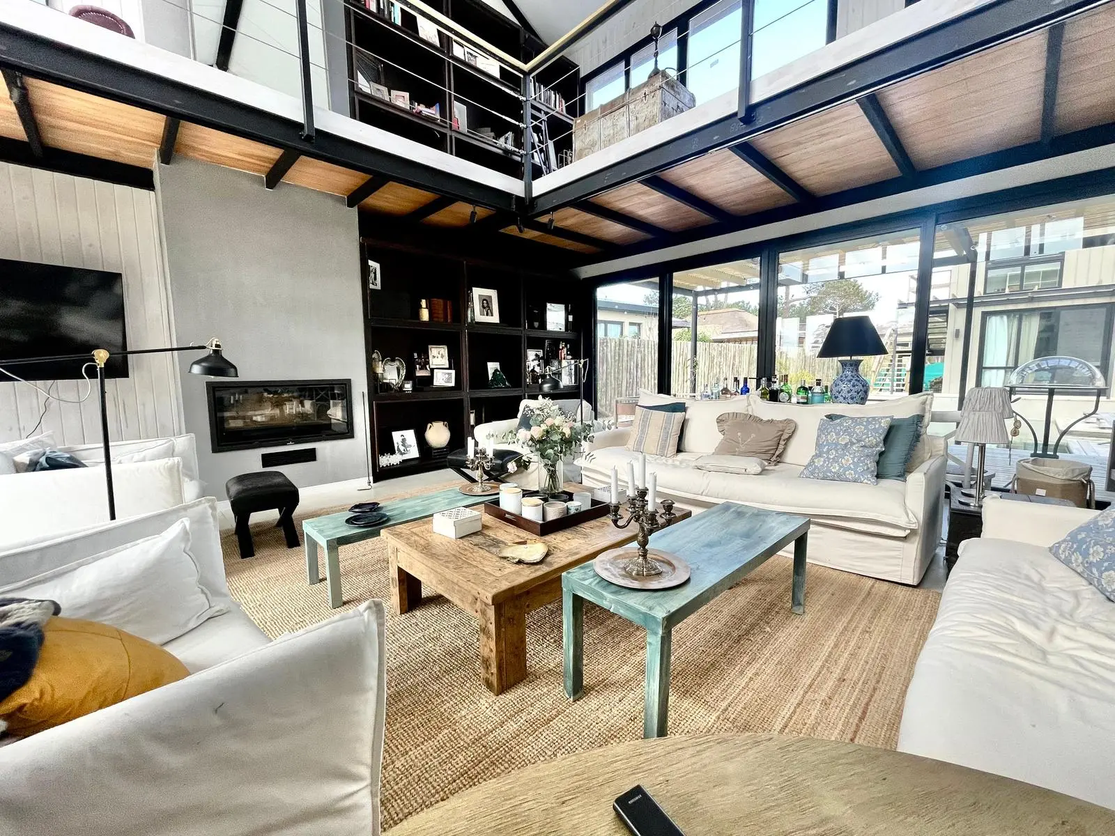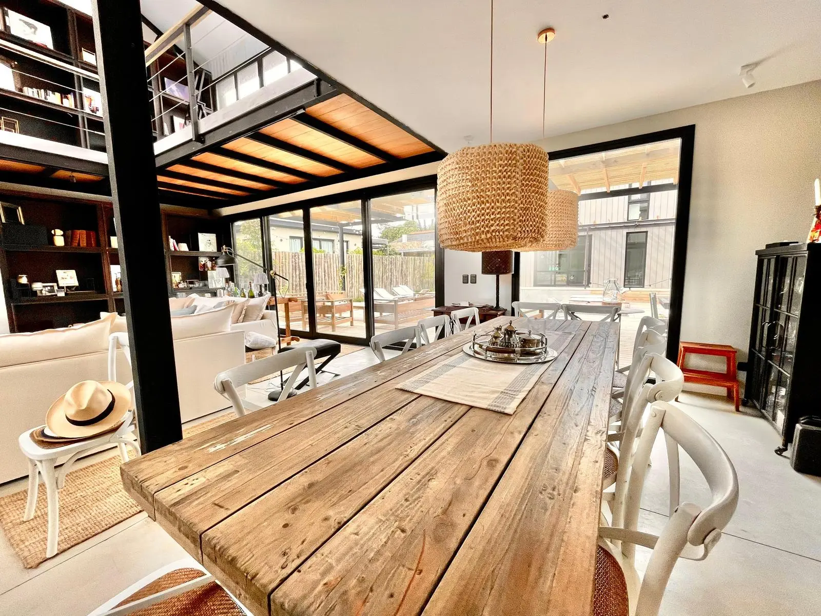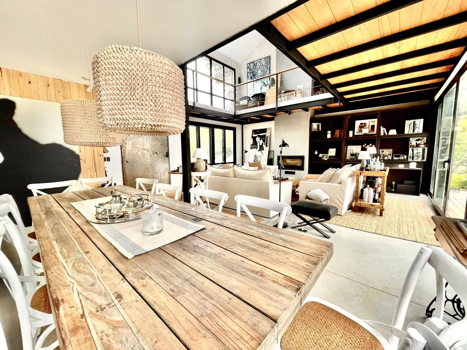 En el volumen principal, en planta baja, living comedor integrado, con comodos sofa y amplia mesa que se encuentra junto a la cocina, muy bien equipada. Toilette, lavadero y dependencia. En planta alta, hall de distribución donde hay dos sofa, escritorio, tv y la master suite.