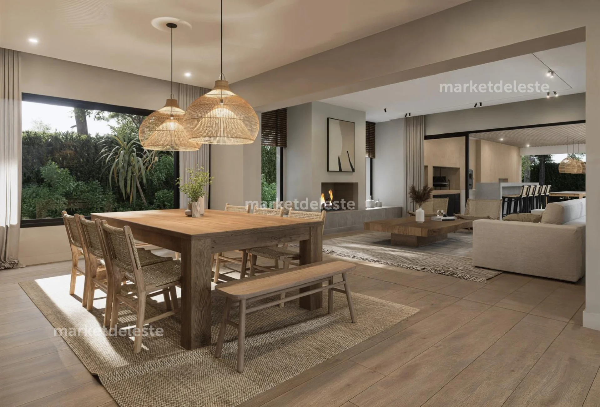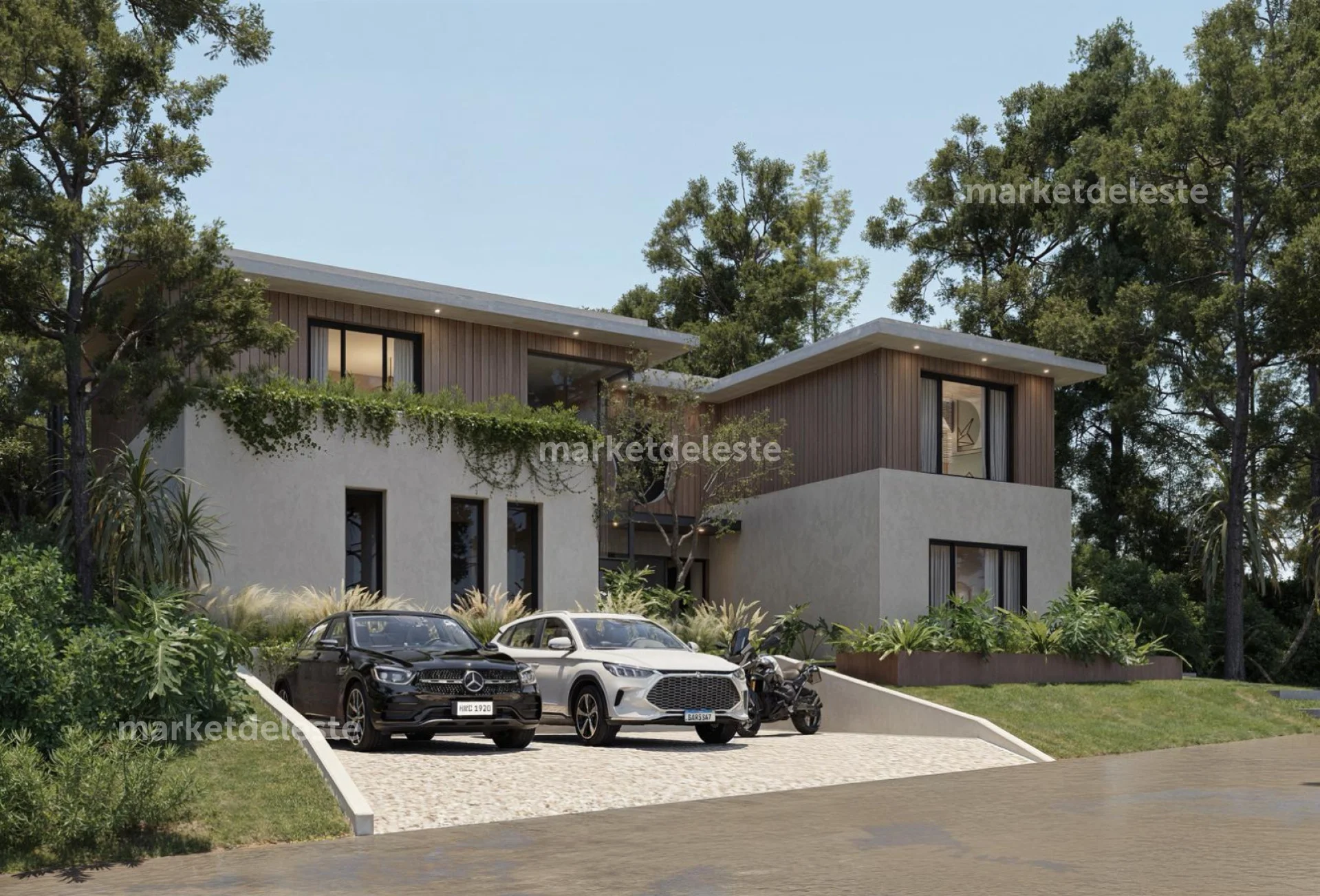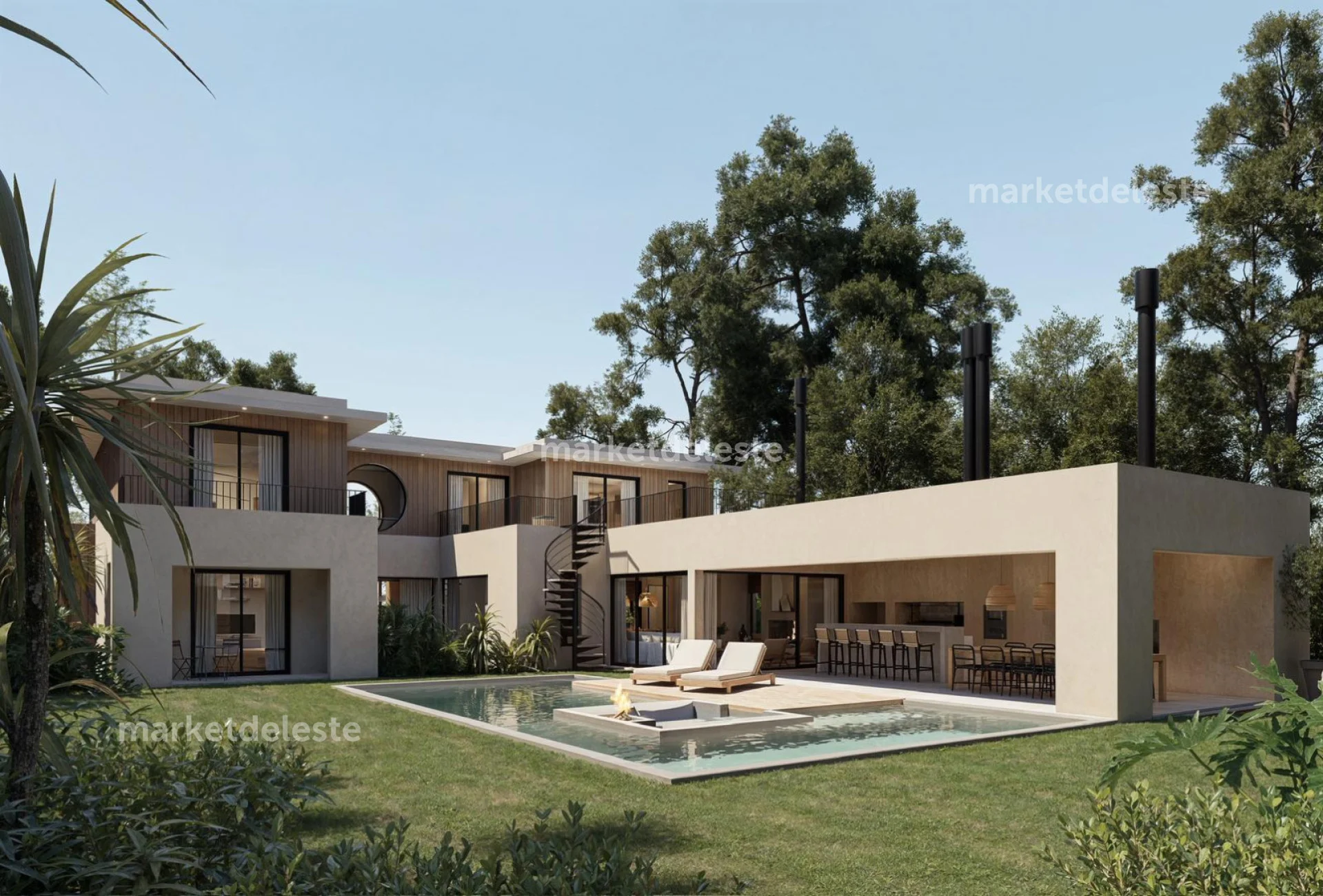 La casa se distribuye en dos niveles. En la planta alta se encuentra una gran suite principal, acompañada por dos suites adicionales, todas con muy buena luz natural y vistas abiertas. En la planta baja dispone de dos dormitorios con cuchetas, pensados especialmente para niños o invitados, además de cuarto y baño de servicio.