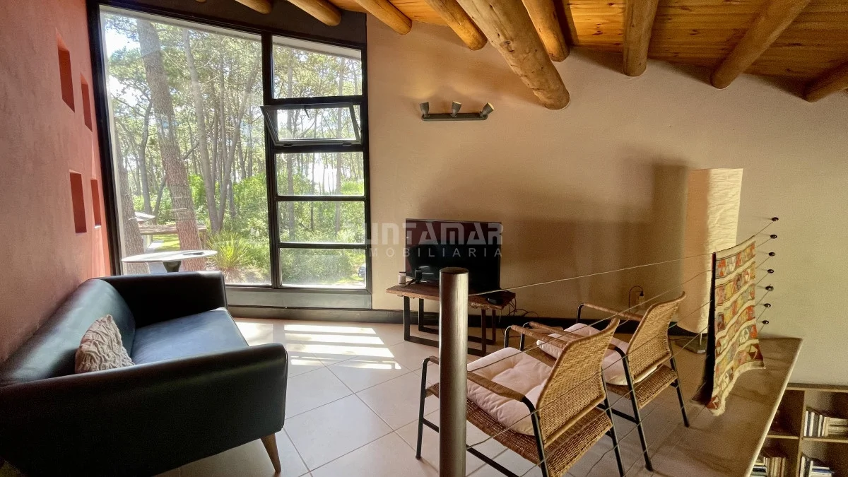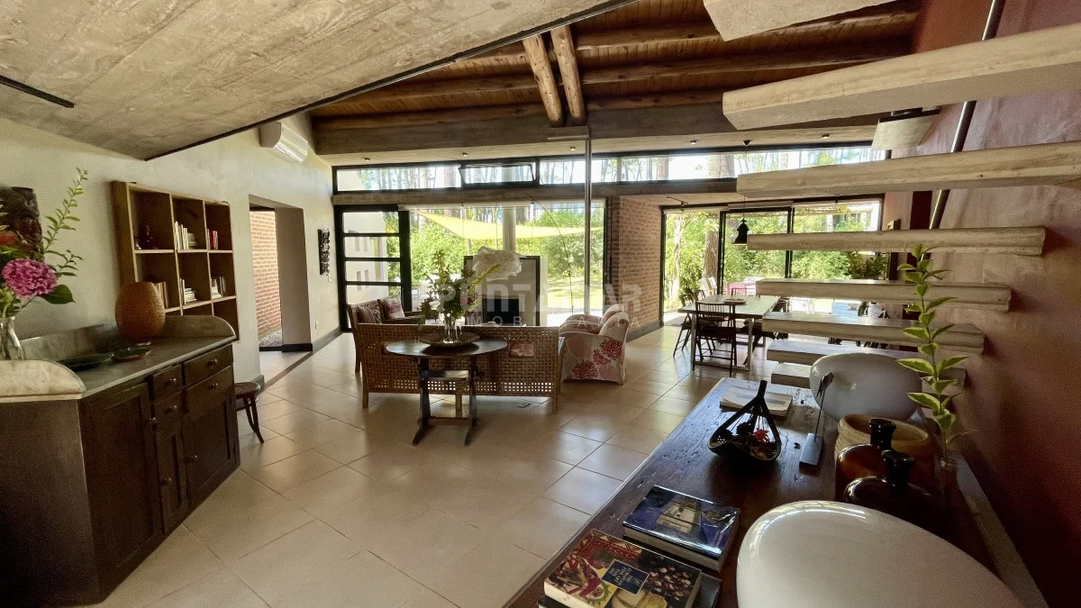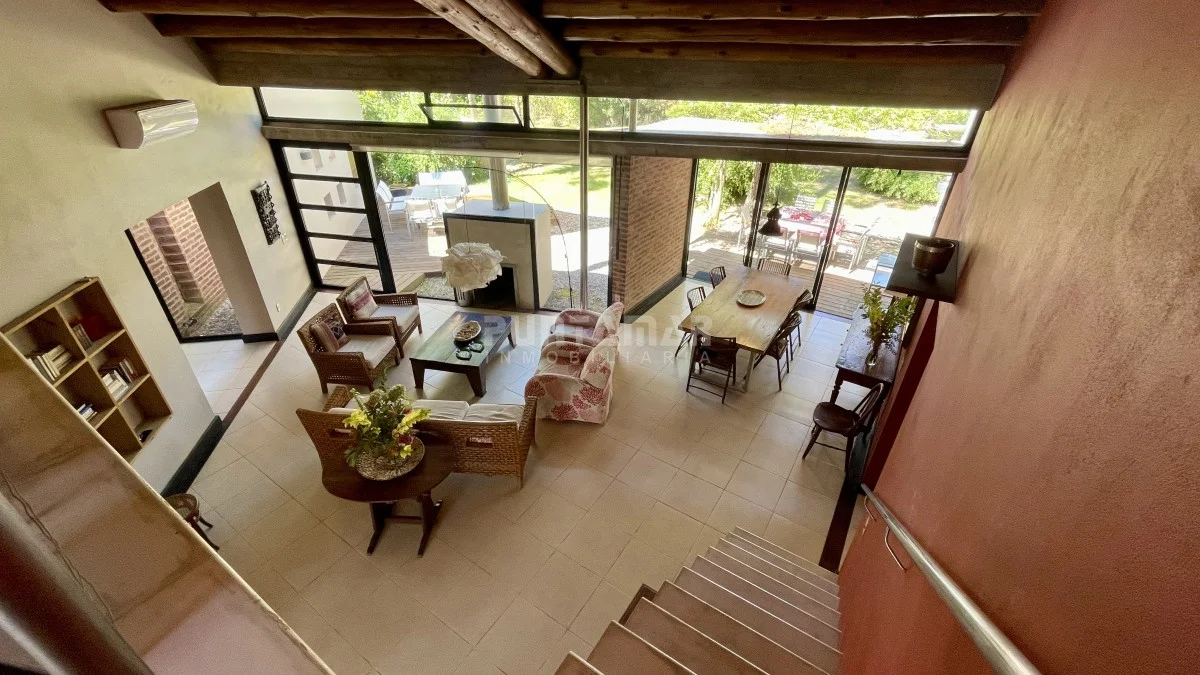 El corazón de la casa es el amplio living comedor con estufa a leña y un sector de lectura en un entrepiso abierto, de grandes ventanales con vistas al Bosque.