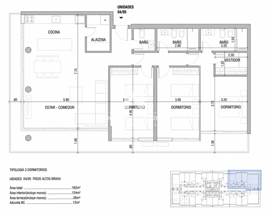 Unidad de 3 dormitorios con 2 baños (1 suite)
