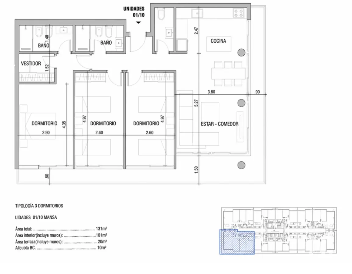 Unidad de 3 dormitorios con 2 baños (1 suite)