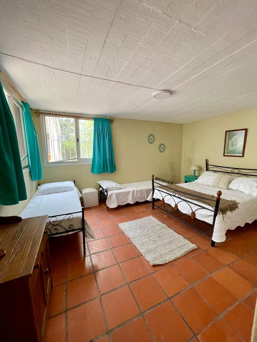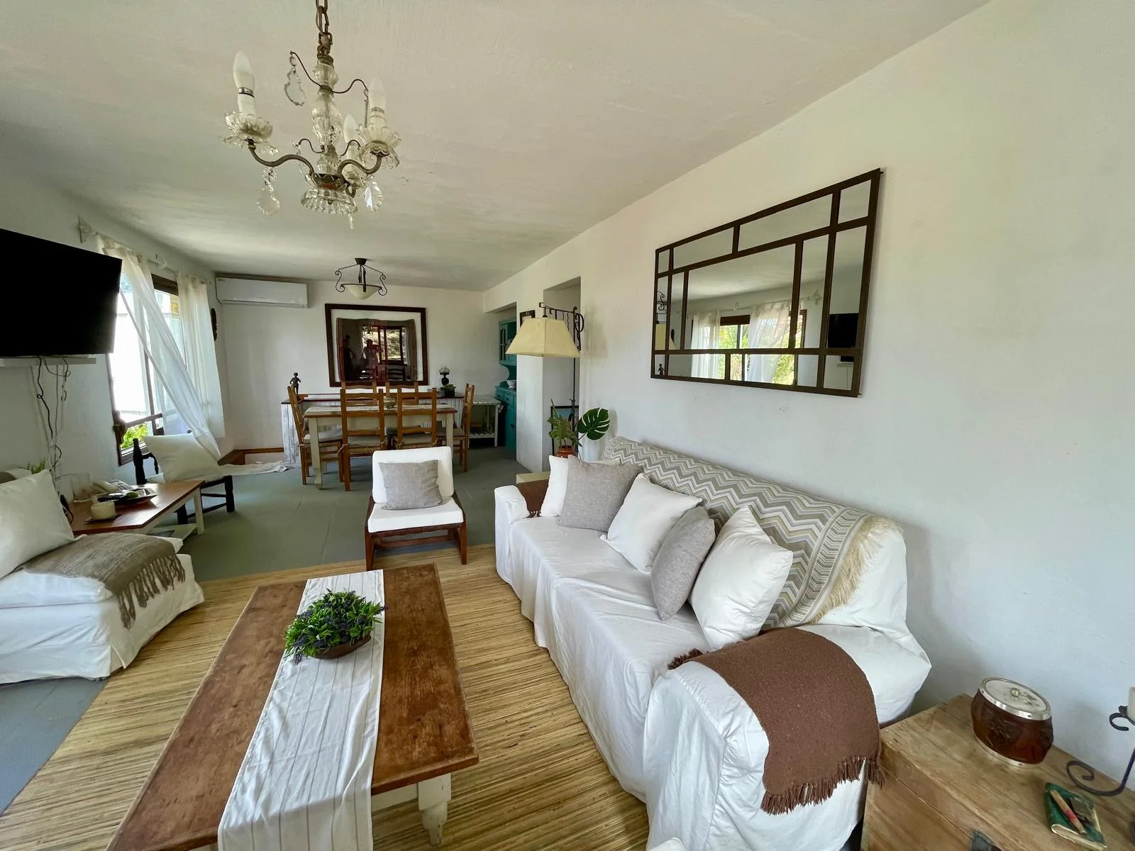 Upstairs: two bedrooms with one shared bathroom. One of the bedrooms has its own terrace with a sea view. The other overlooks the garden and swimming pool.
