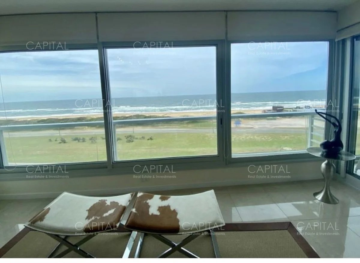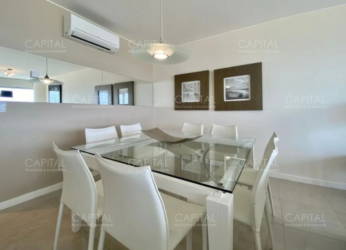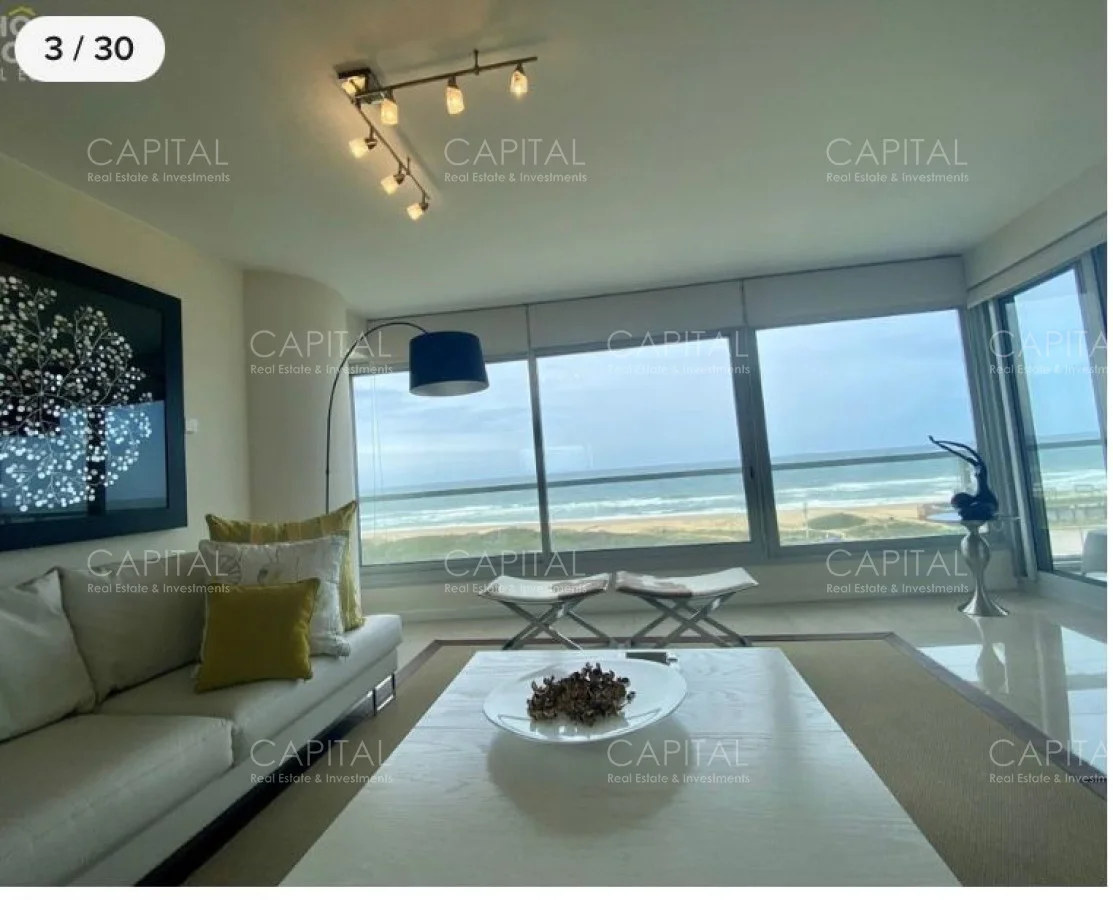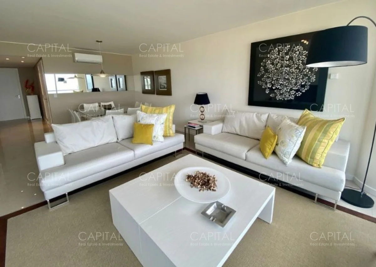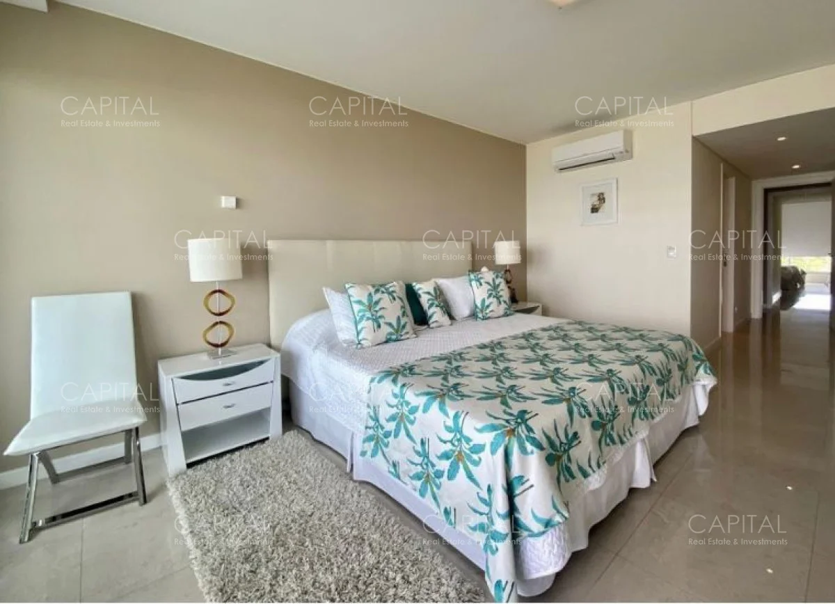 Al ingresar, recibe un techo con acabados refinados que dan paso a un amplio living comedor diseñado para la relajación y el entretenimiento. La elección cuidadosa de los materiales, como pisos de mármol y detalles en madera noble, refleja la alta calidad de los acabados en todo el espacio. Desde este ambiente, se accede a un elegante balcón terraza que se extiende a lo largo de la fachada del apartamento, permitiendo una vista panorámica inigualable del mar y el horizonte costero.