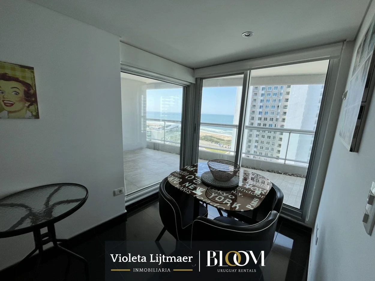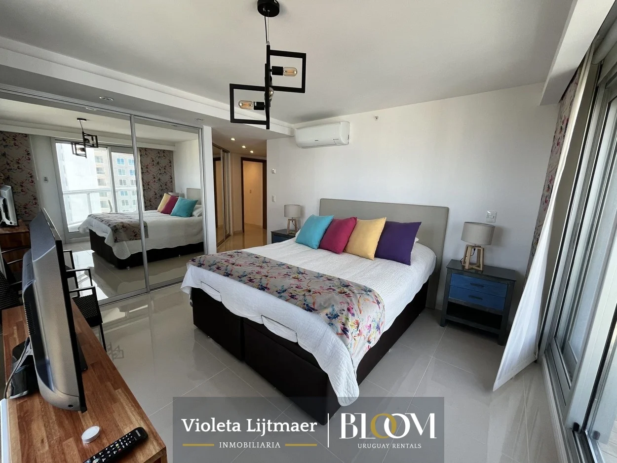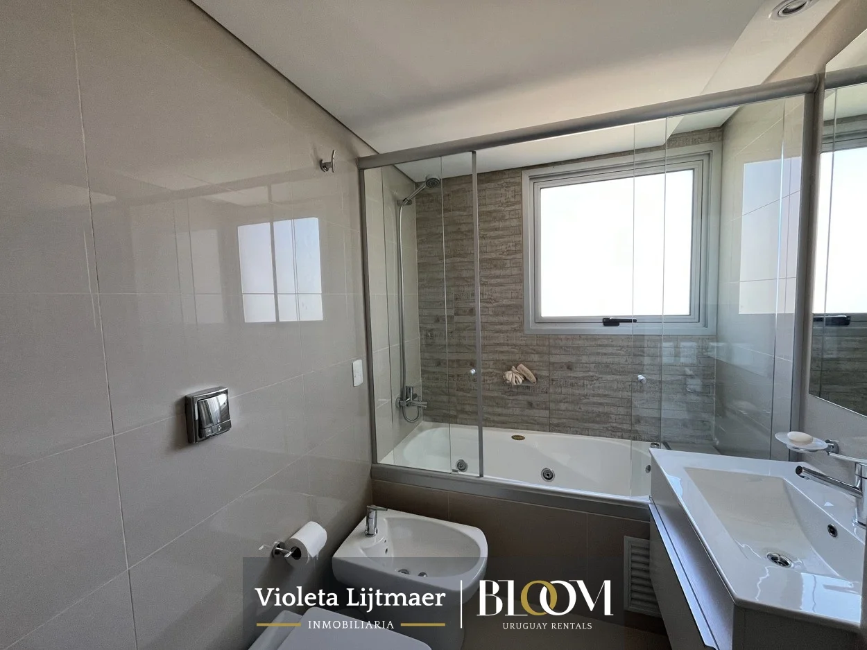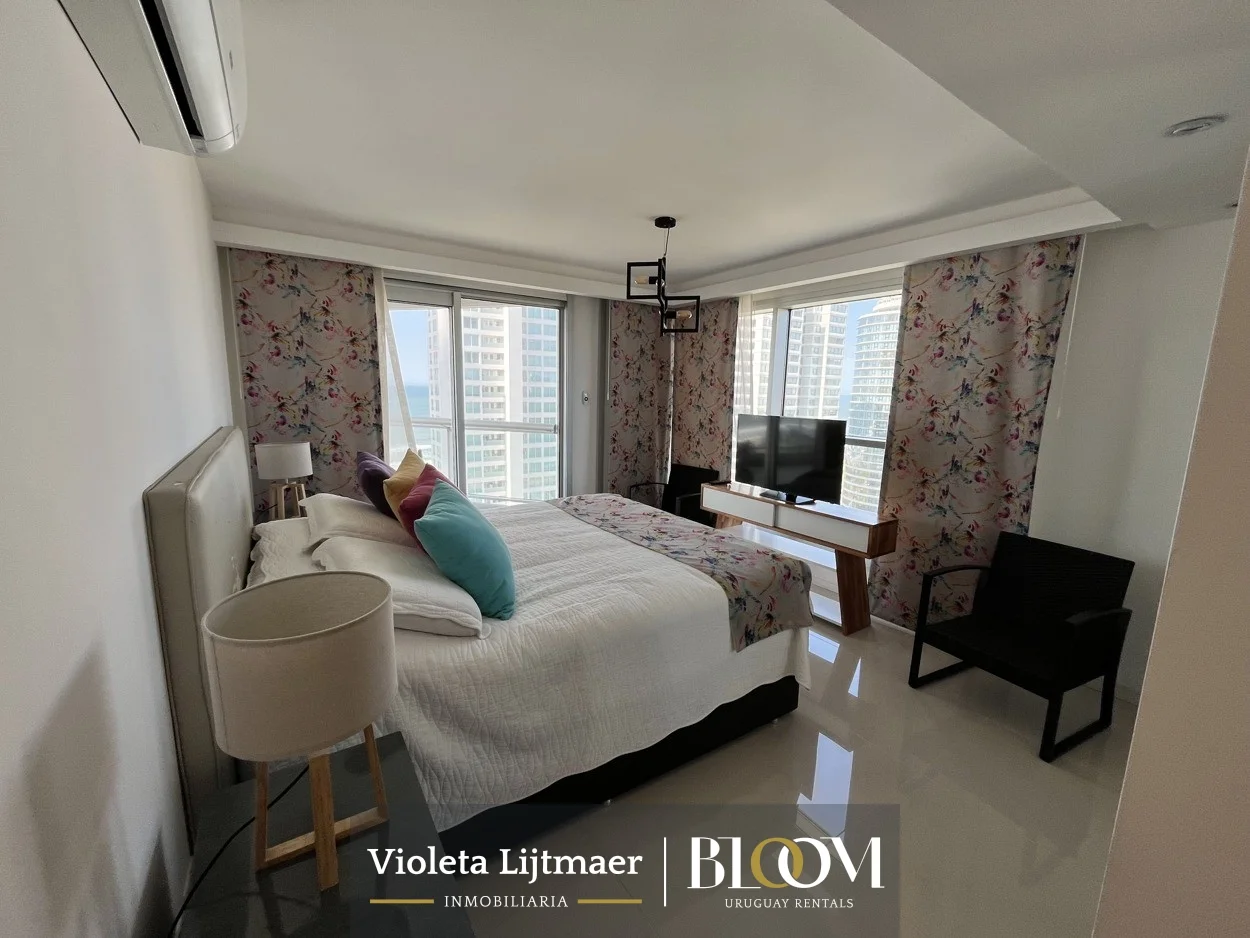 Hermoso apartamento esquinero en piso alto. 3 dormitorios y dependencia de servicio, una suite, dos baños, toilette. Suite principal con hidromasaje, espléndida vista al mar y salida a la terraza. Confortable living comedor. Gran terraza con parrillero y vista panorámica. Cocina definida con desayunador. Aire acondicionado en todos los ambientes.servicio de mucama. Cochera doble.