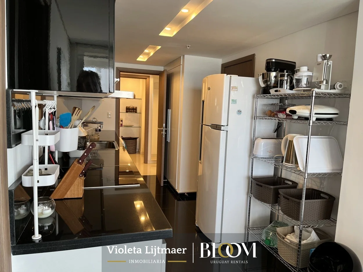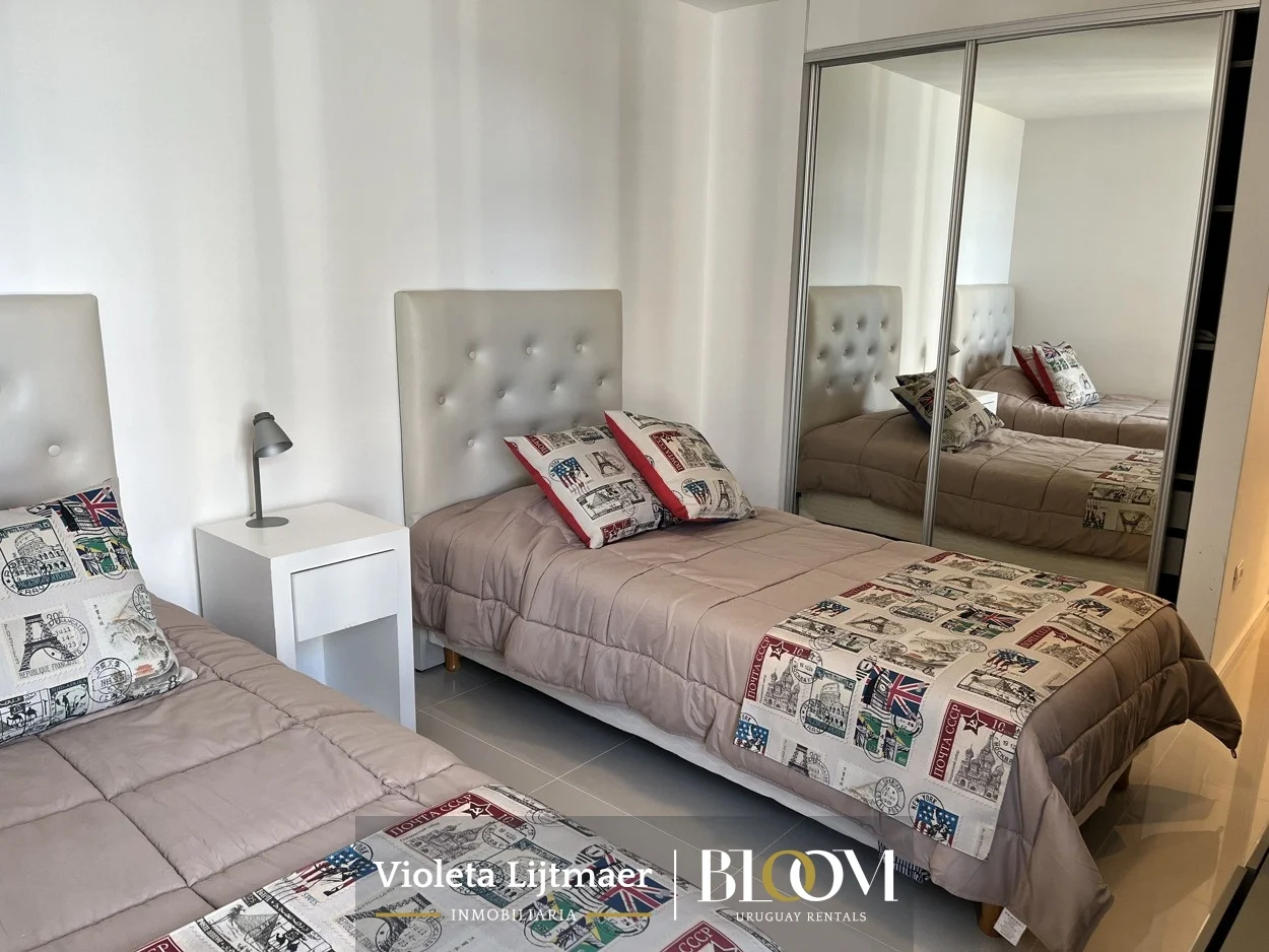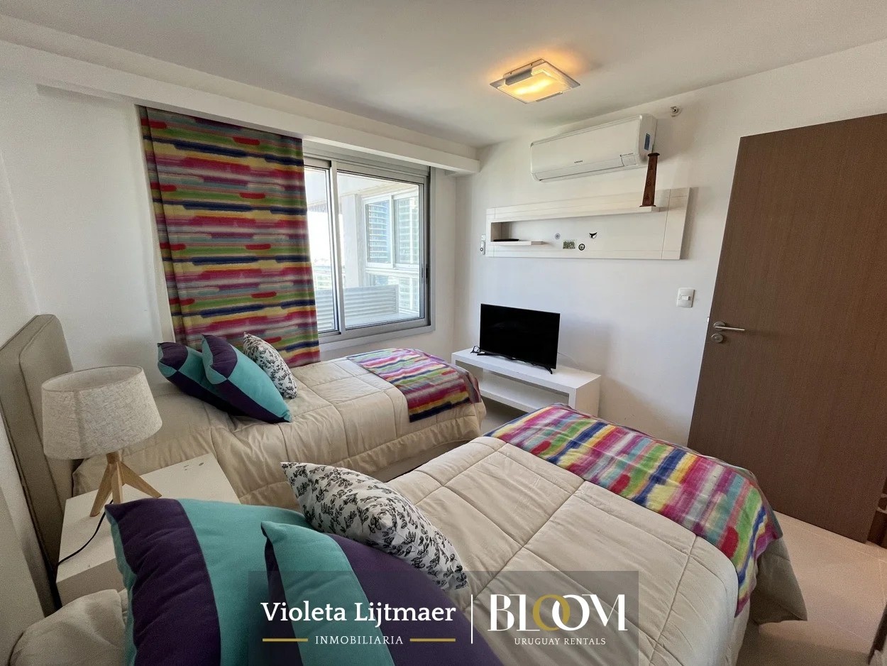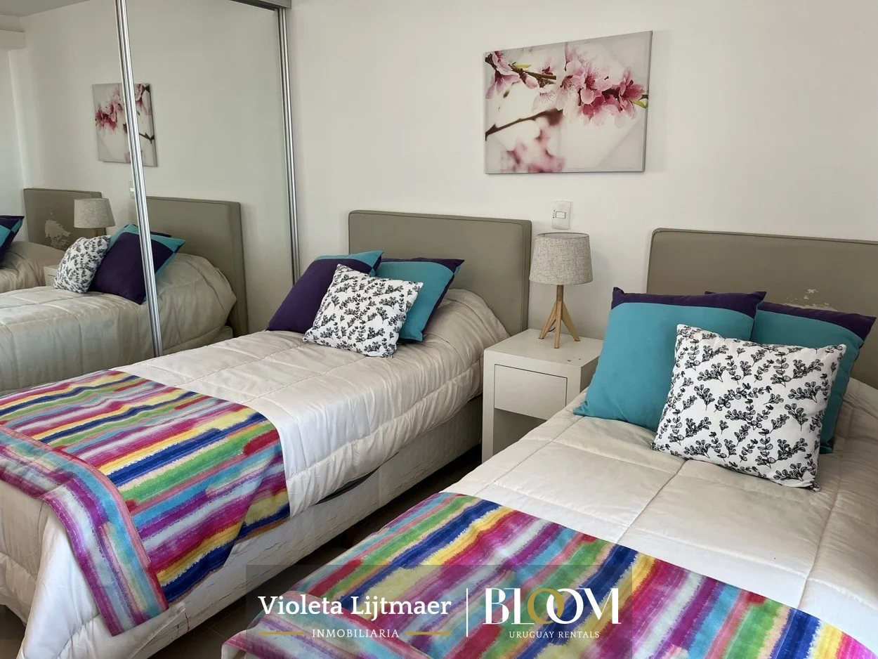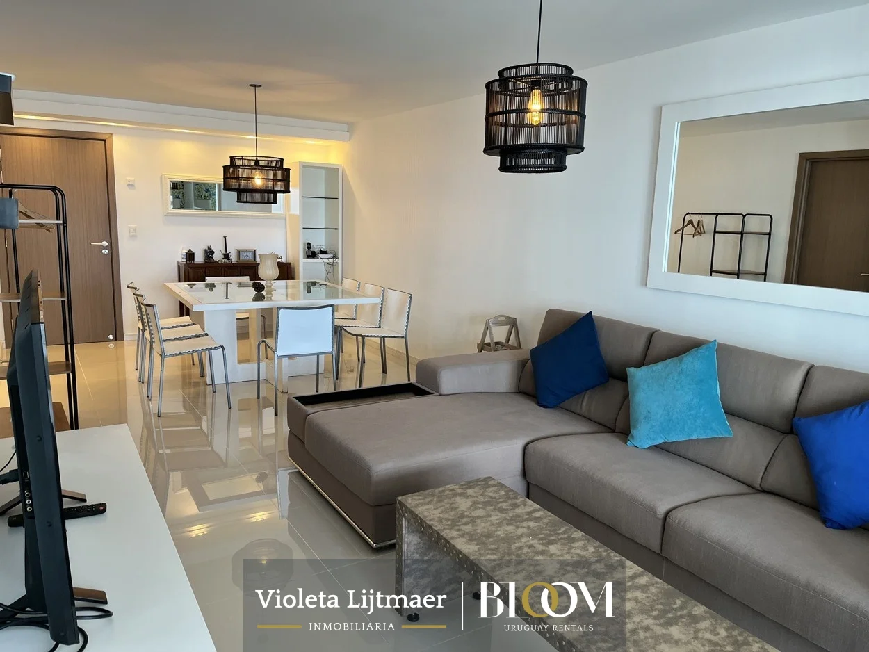 Hermoso apartamento esquinero en piso alto. 3 dormitorios y dependencia de servicio, una suite, dos baños, toilette. Suite principal con hidromasaje, espléndida vista al mar y salida a la terraza. Confortable living comedor. Gran terraza con parrillero y vista panorámica. Cocina definida con desayunador. Aire acondicionado en todos los ambientes.servicio de mucama. Cochera doble.