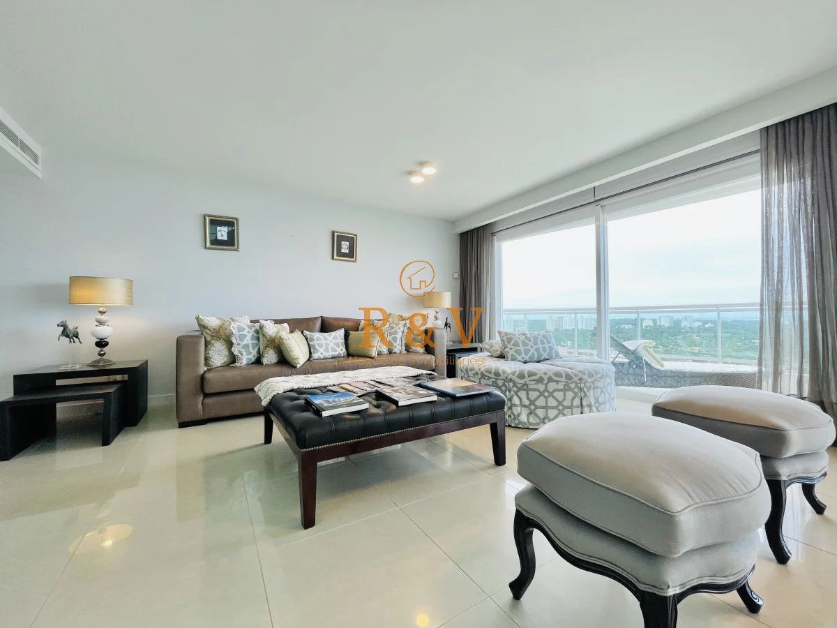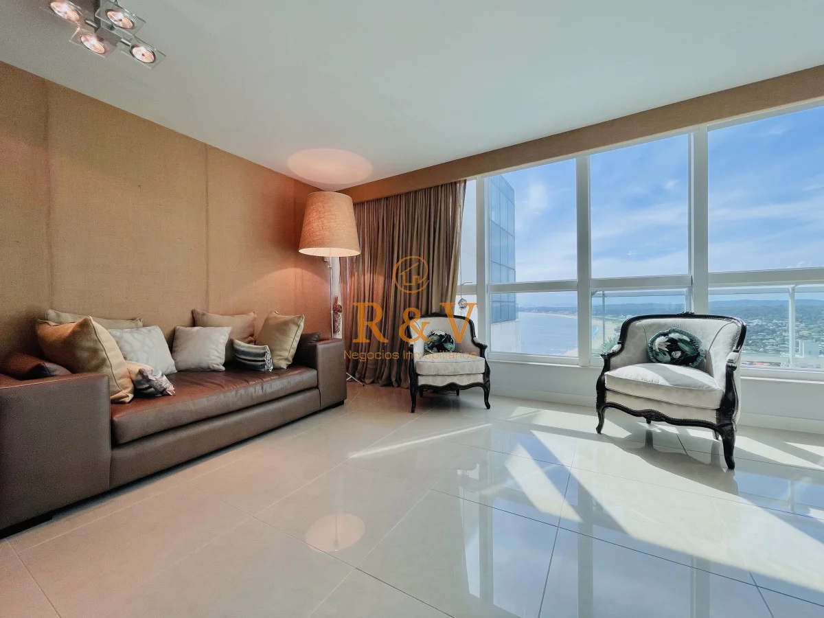 Amplio living comedor de doble altura con grandes ventanales que proporcionan una iluminación natural espectacular, con salida al balcón y vista al mar.