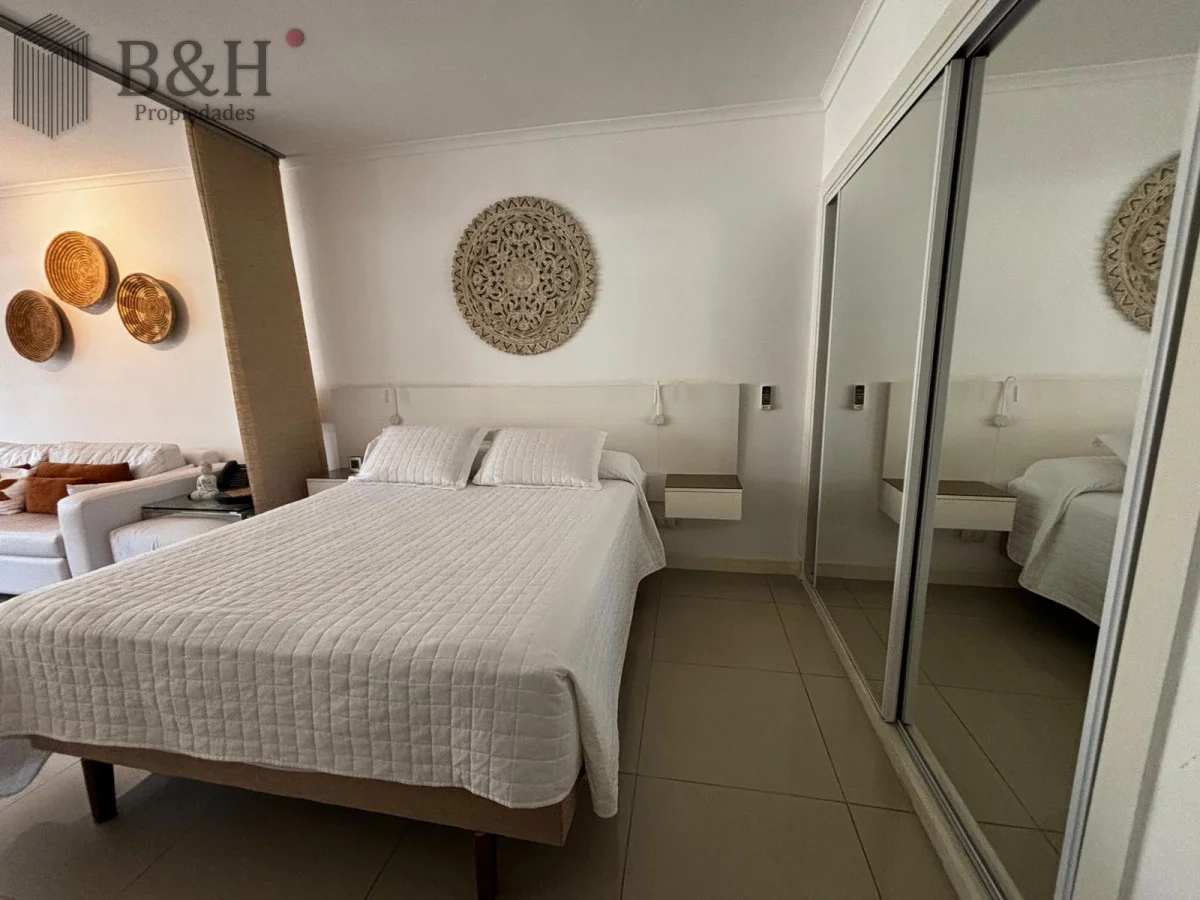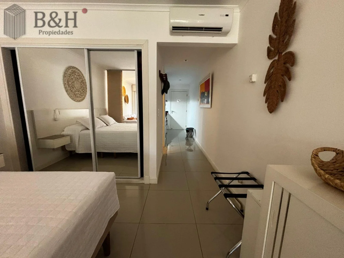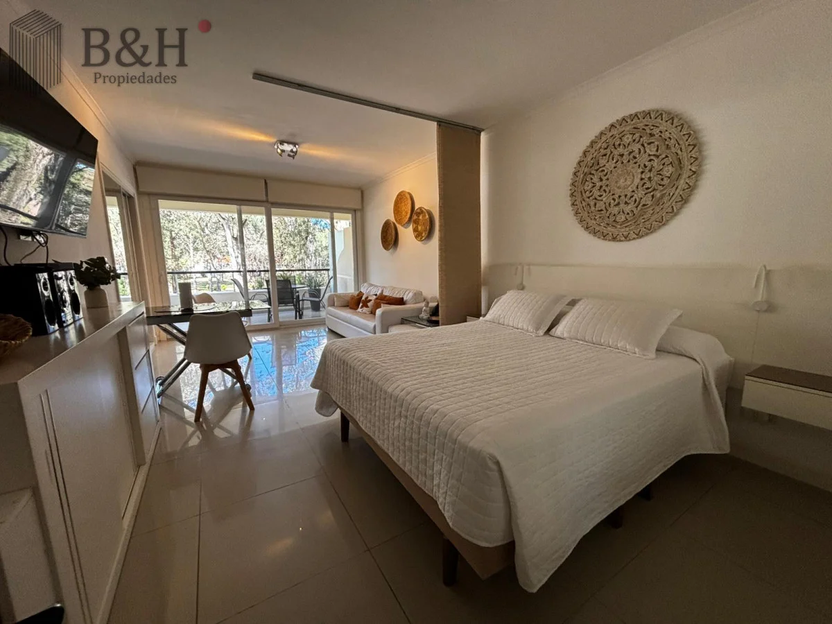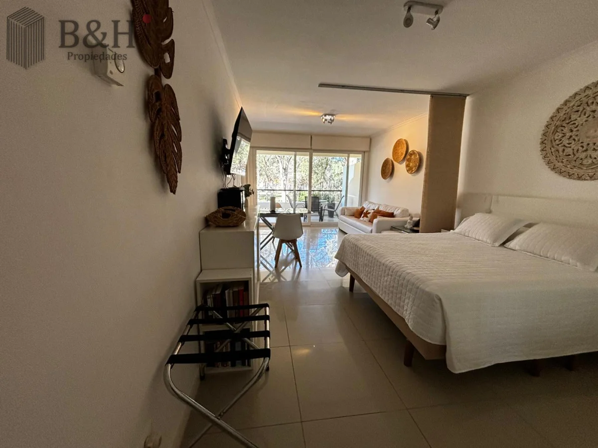 Monoambiente con ventanal al frente y balcón, rodeado de bosque y cerca del mar. El interior está separado en dos por una cortina japonesa. Cama Queen nueva y almohadas confortables. El baño tiene bañerajacuzzi. La cocina está bien equipada, dos anafes y horno eléctrico embutido. Ropa blanca y servicio de mucama todos los días, si quieres.
