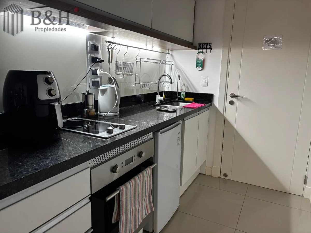 Al entrar encontrarás la cocina, que tiene un anafe vitrocerámico con dos discos, horno eléctrico, microondas, jarra eléctrica, licuadora, tostadora, juego de ollas y demás enseres necesarios. Allí hay un frigobar pequeño y, en el armario junto al ventanal que da a la terraza, una heladera con freezer.