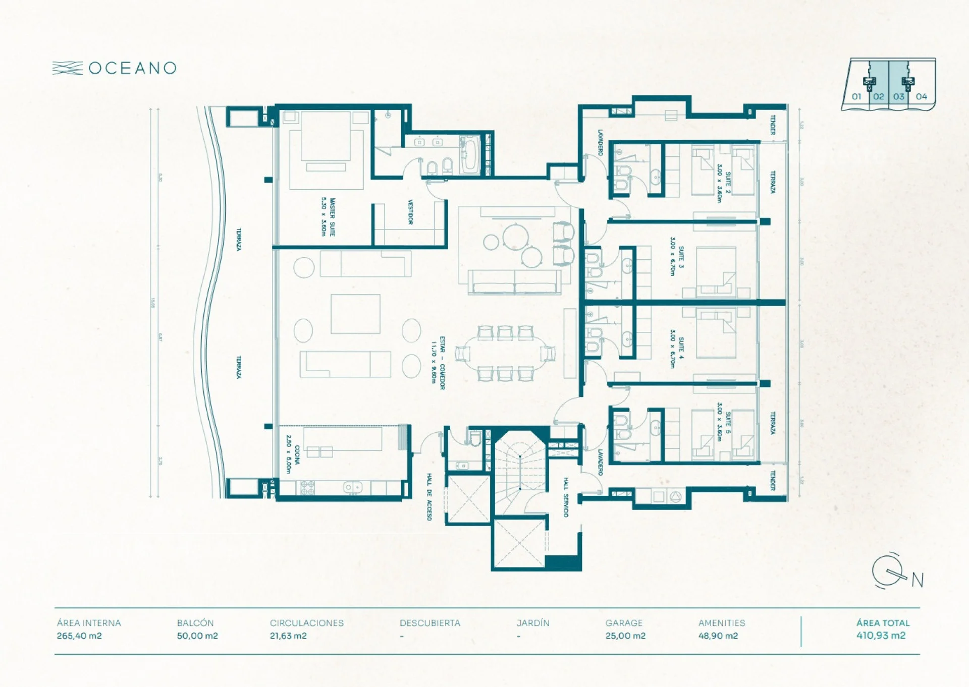 Departamento de 5 dormitorios en suite a estrenar primera linea en manantiales en un edificio nuevo que sin duda se transforma en uno de las mejores opciones . Se trata de un departamento unificado central con 410 m2 totales y 265 m2 internos de alfombra con 50 m2 de terrazas con parrillero . Listo para disfrutar.