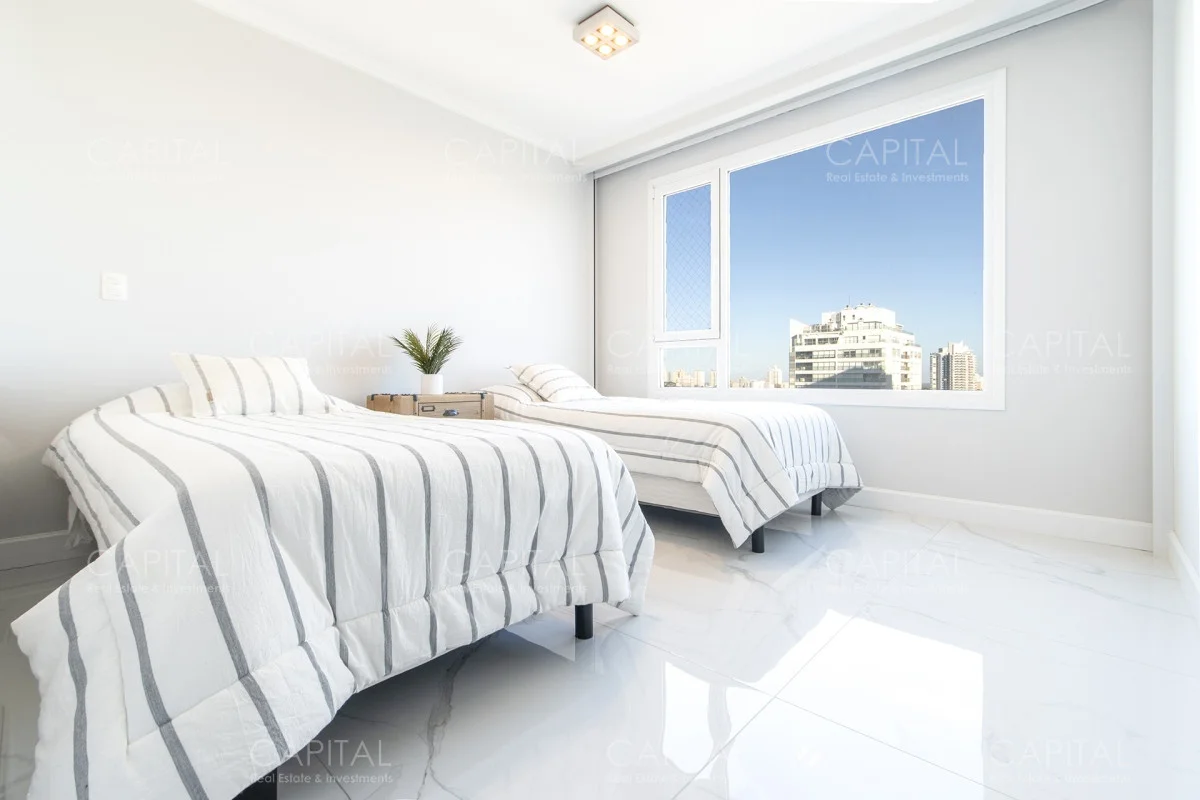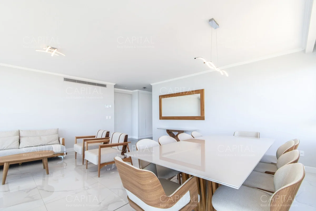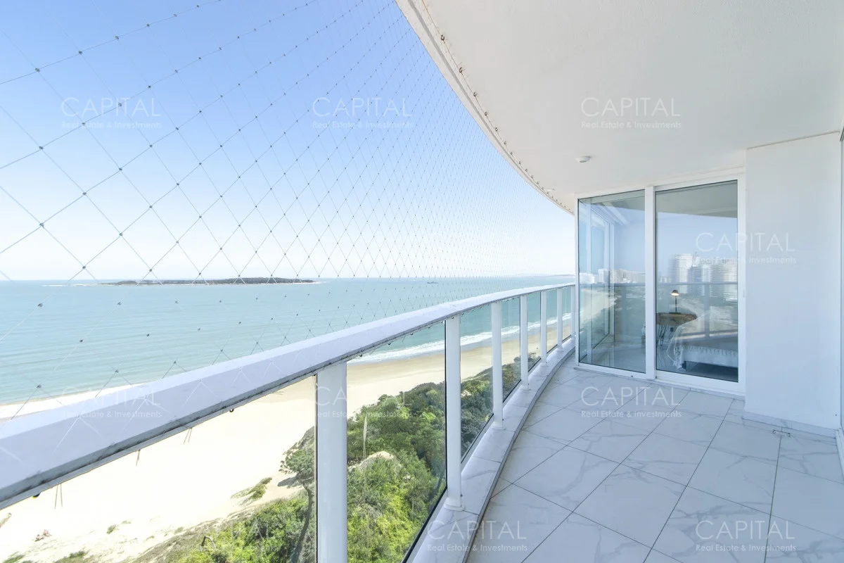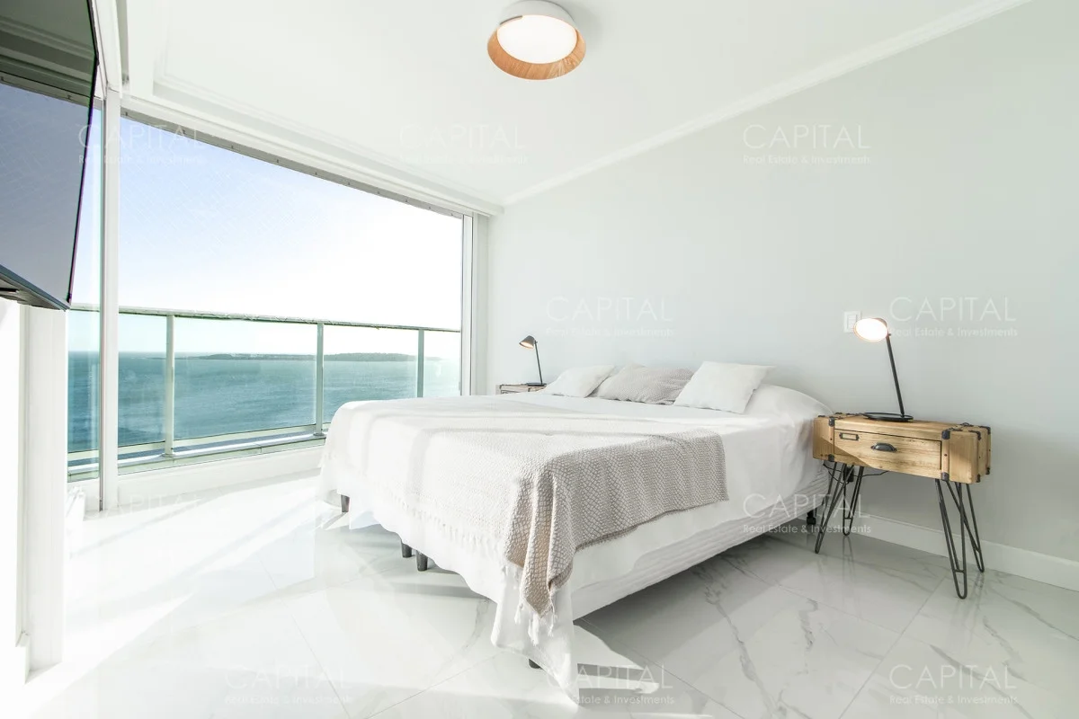 Apartamento de tres dormitorios en suite mas dependencia con baño y toilette social, palier privado con ocho ascensores de gran velocidad, la ubicación del edificio en primera linea frente al mar ofrece una vista totalmente panorámica de la Playa Mansa.