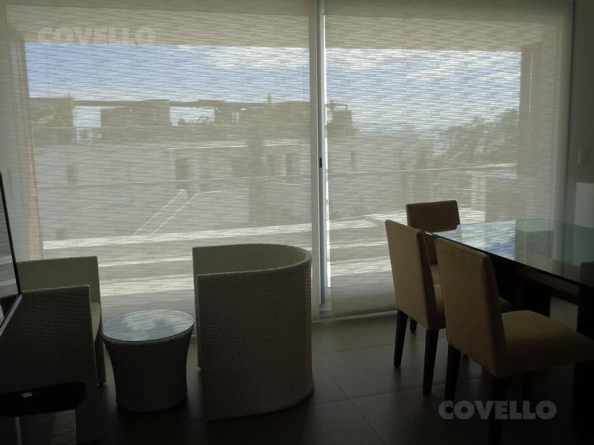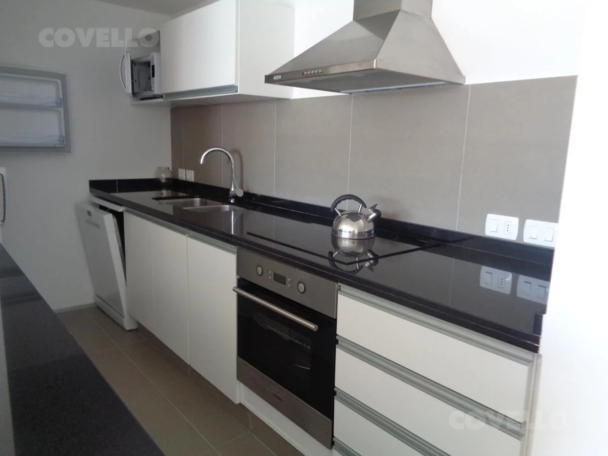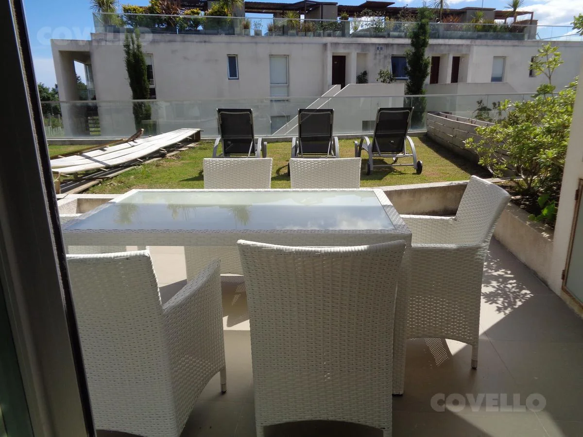 Living Comedor, cocina americana, dos dormitorios (1suite), 2 baños, terraza con parrillero y jardin, cochera. Aire acondicionado.