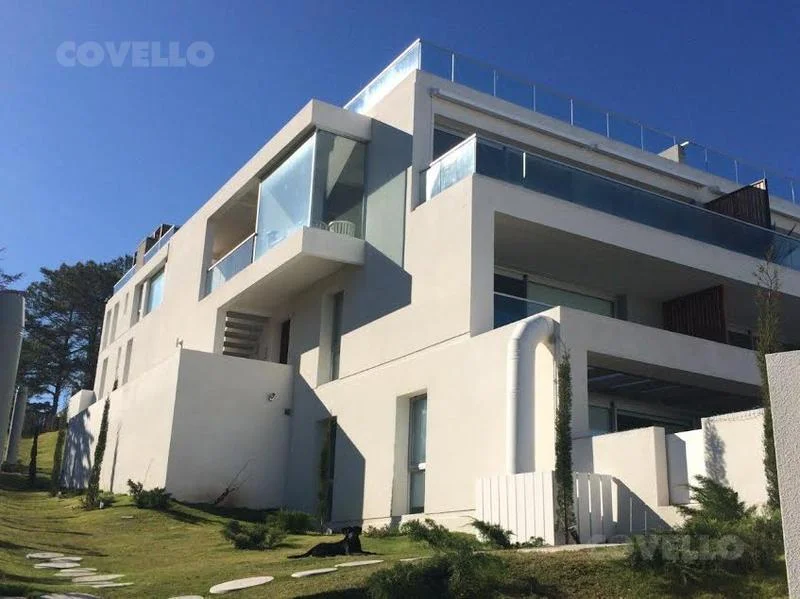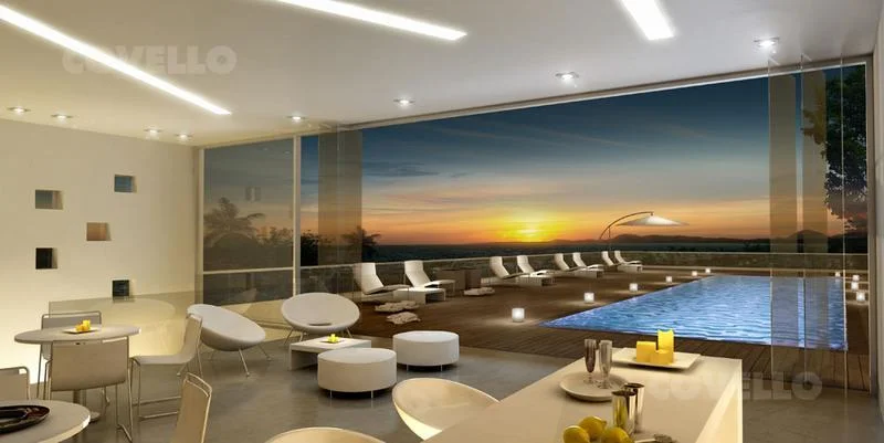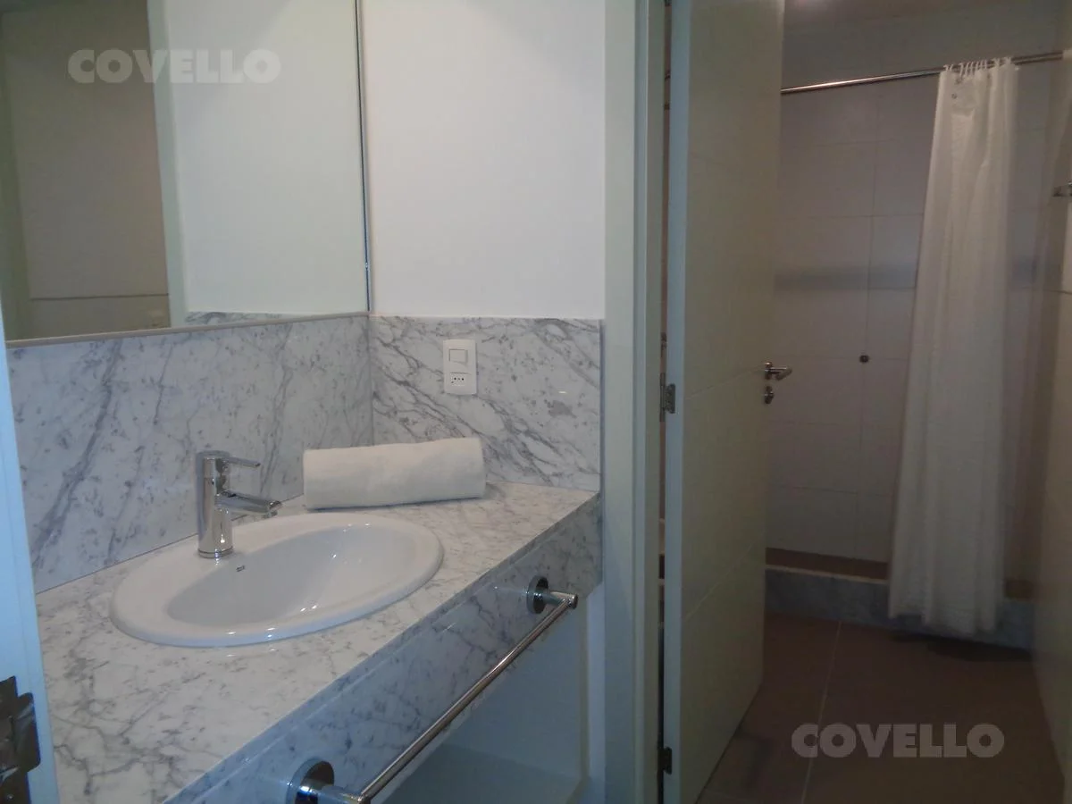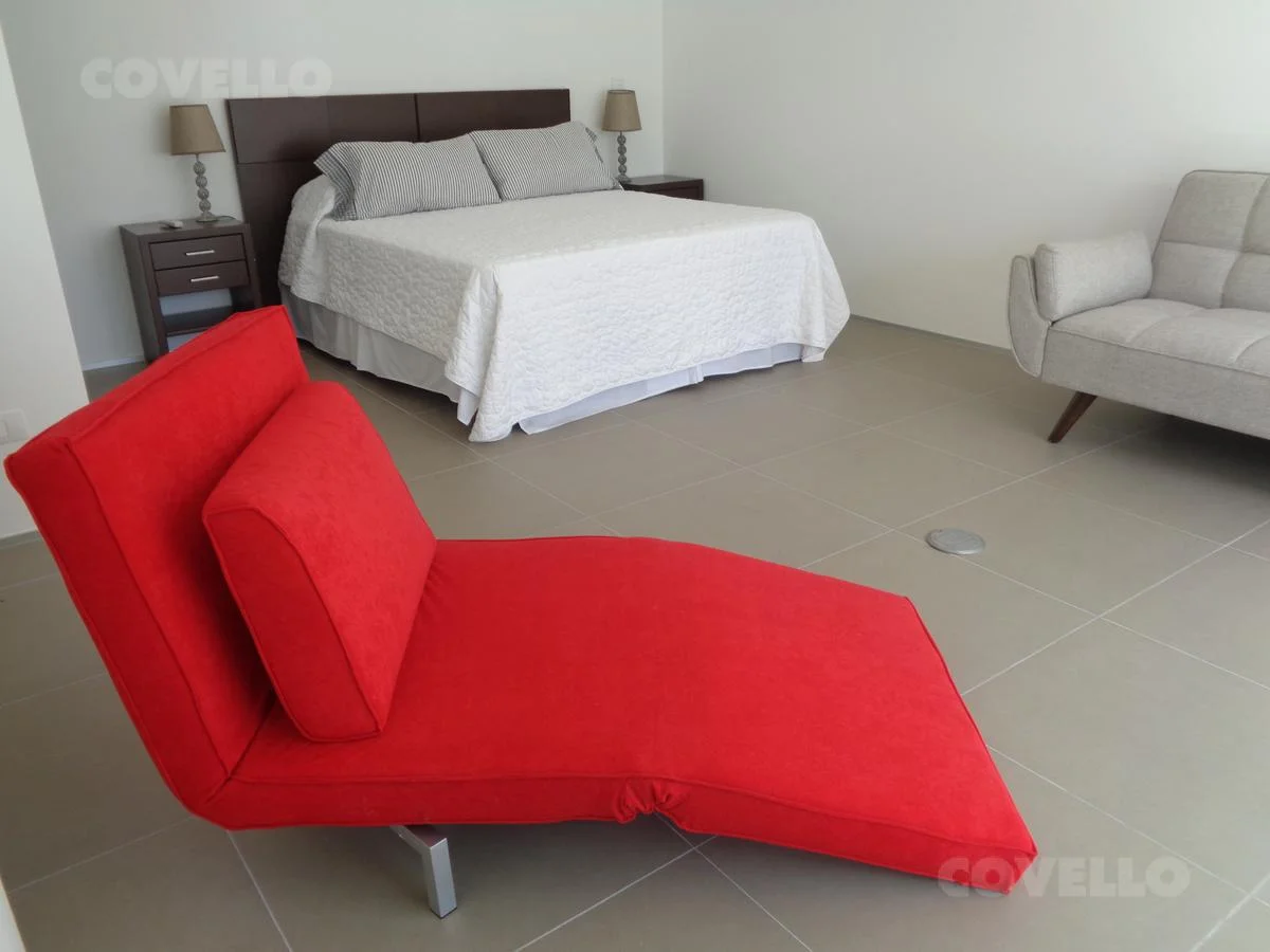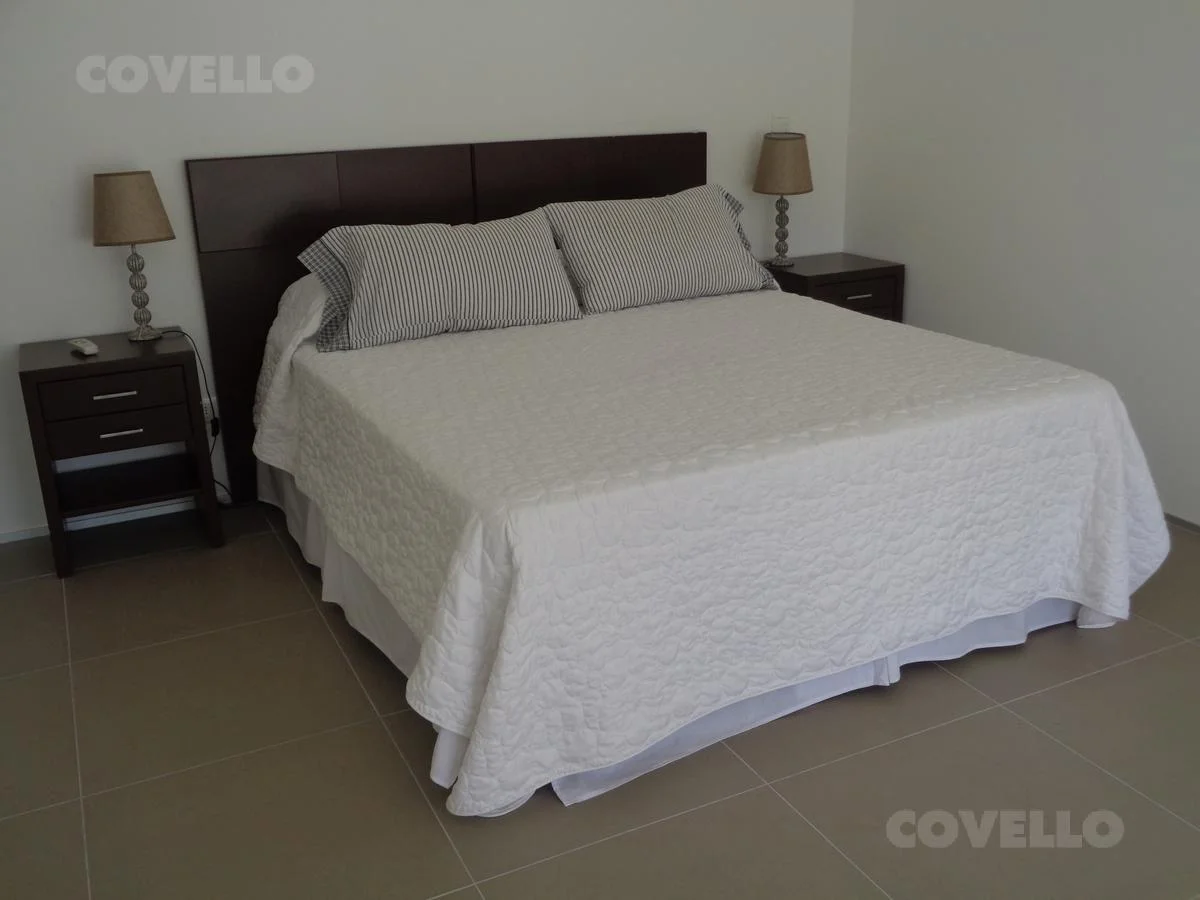 Living Comedor, cocina americana, dos dormitorios (1suite), 2 baños, terraza con parrillero y jardin, cochera. Aire acondicionado.