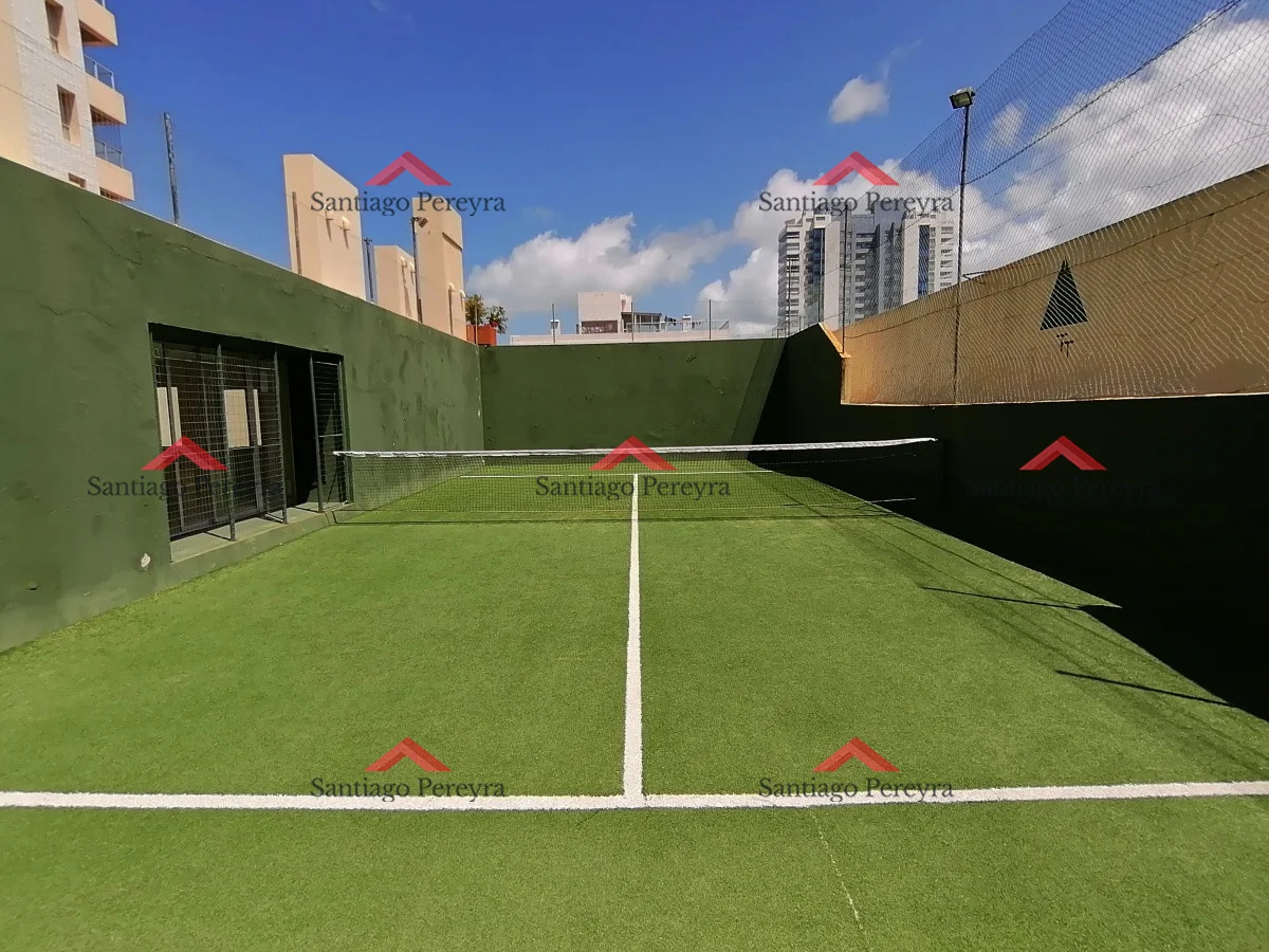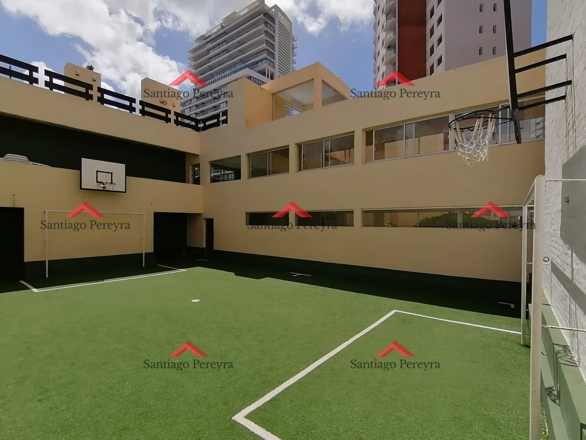 El edificio ofrece un conjunto de amenities, que incluyen piscinas interior y exterior, gimnasio, sauna, parrilleros, canchas multiuso, servicio de mucamas, recepción 24 horas y seguridad permanente.