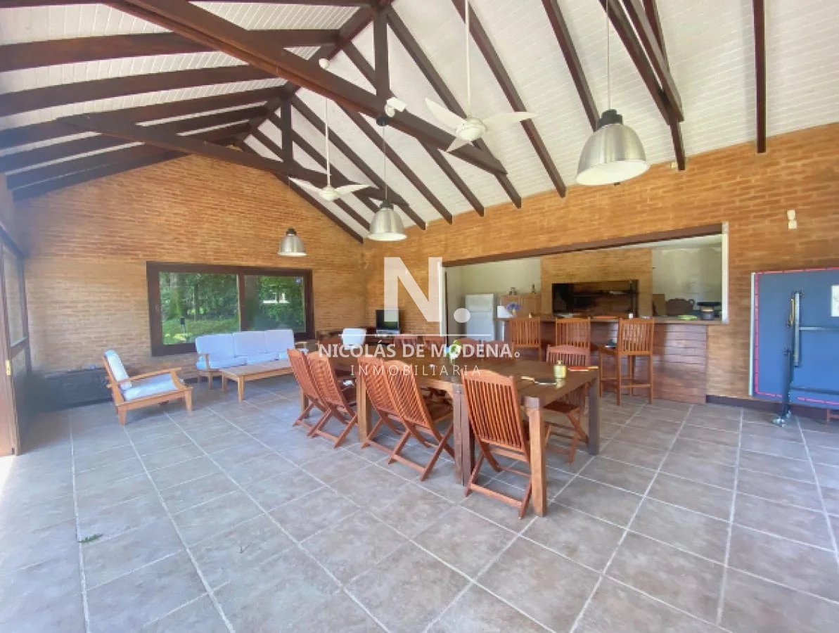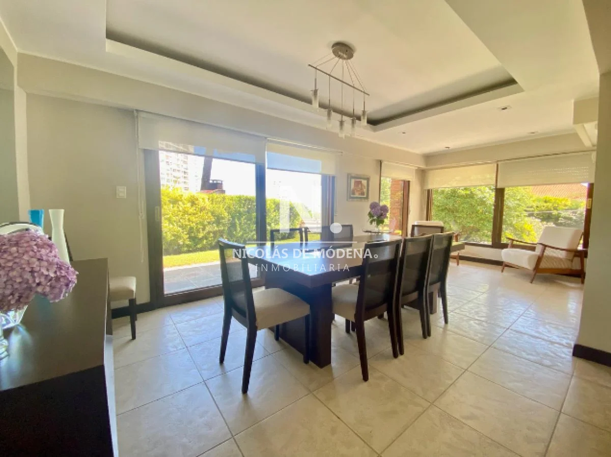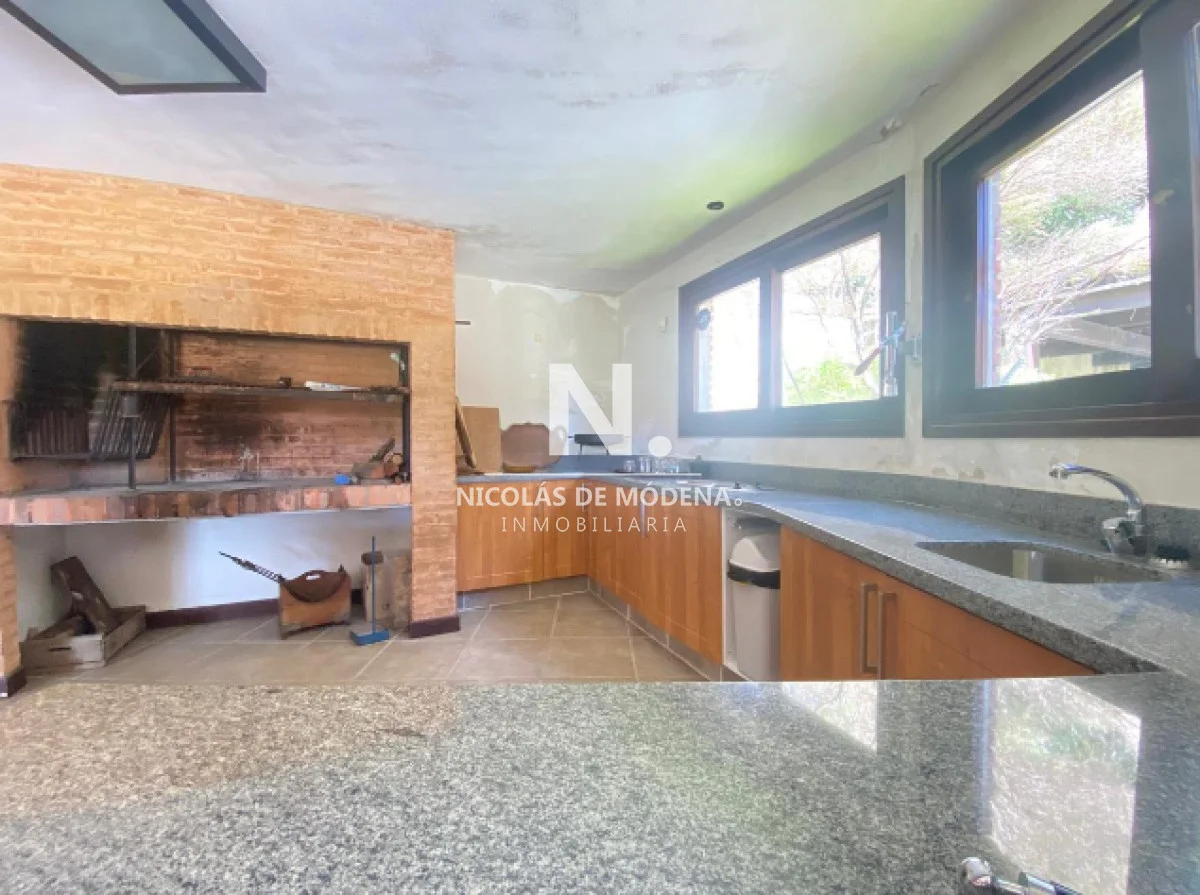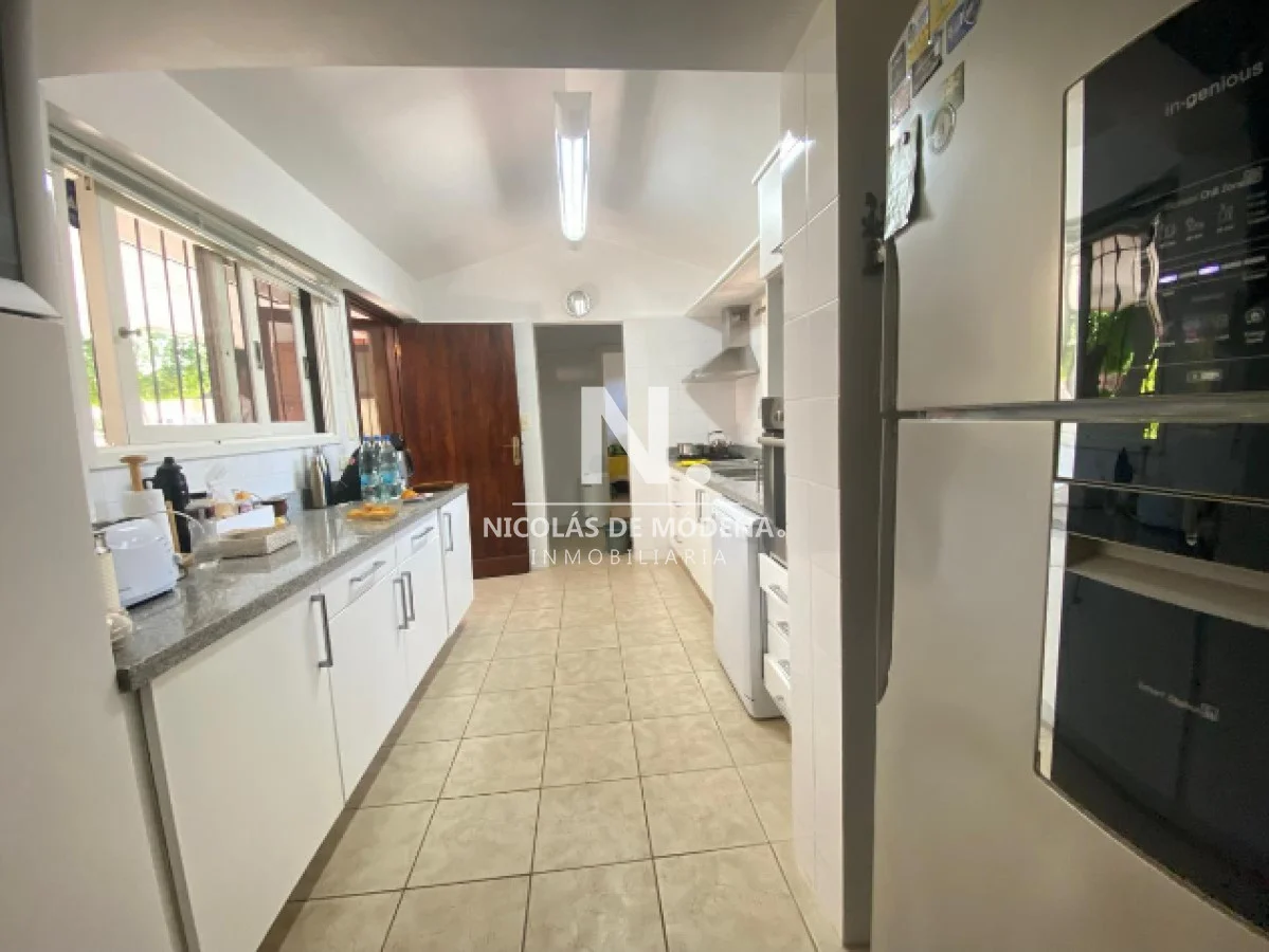 El diseño incluye cocheras techadas en la planta alta con capacidad para tres autos y una cochera adicional en el subsuelo, ofreciendo amplio espacio para el estacionamiento de vehículos. La casa está equipada con aire acondicionado, TV, placares en los dormitorios y la cocina, y se encuentra en un excelente estado de conservación, siendo una de las pocas en este nivel de mantenimiento en la zona.