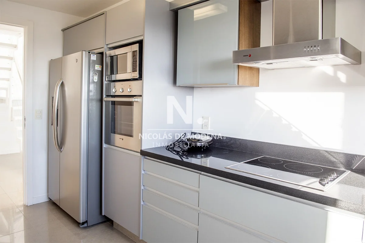 La cocina se presenta en un estilo americano equipada con anafe, heladera con freezer, horno y campana extractora. El área de estar comprende un amplio living comedor, proporcionando un espacio abierto y versátil para la convivencia y el entretenimiento.