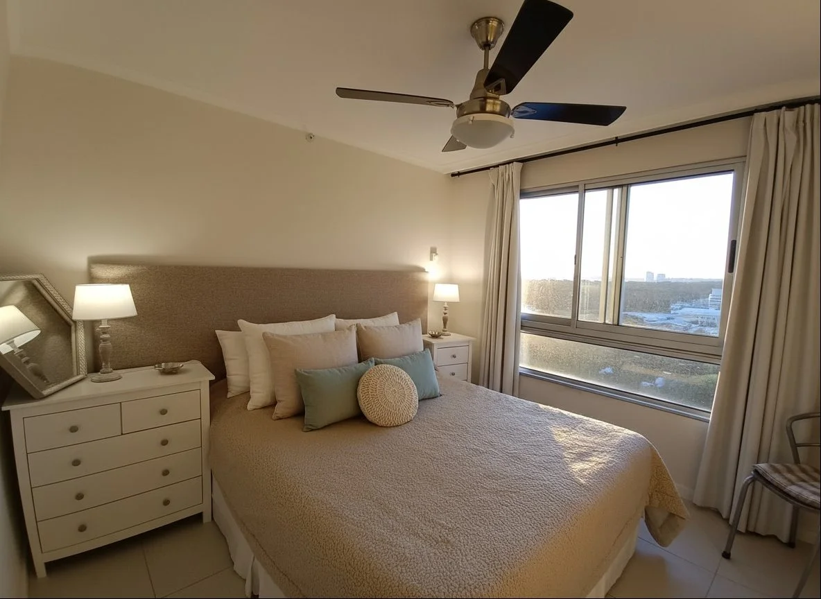 Cuarto principal con vestidor, cocina definida, lavadero, placard despojador enorme en el living, dormitorios llenos de sol todo el dia y un balcón grande con espacio cómodo para muebles por la que se ve la playa, ya que es un piso bien alto.