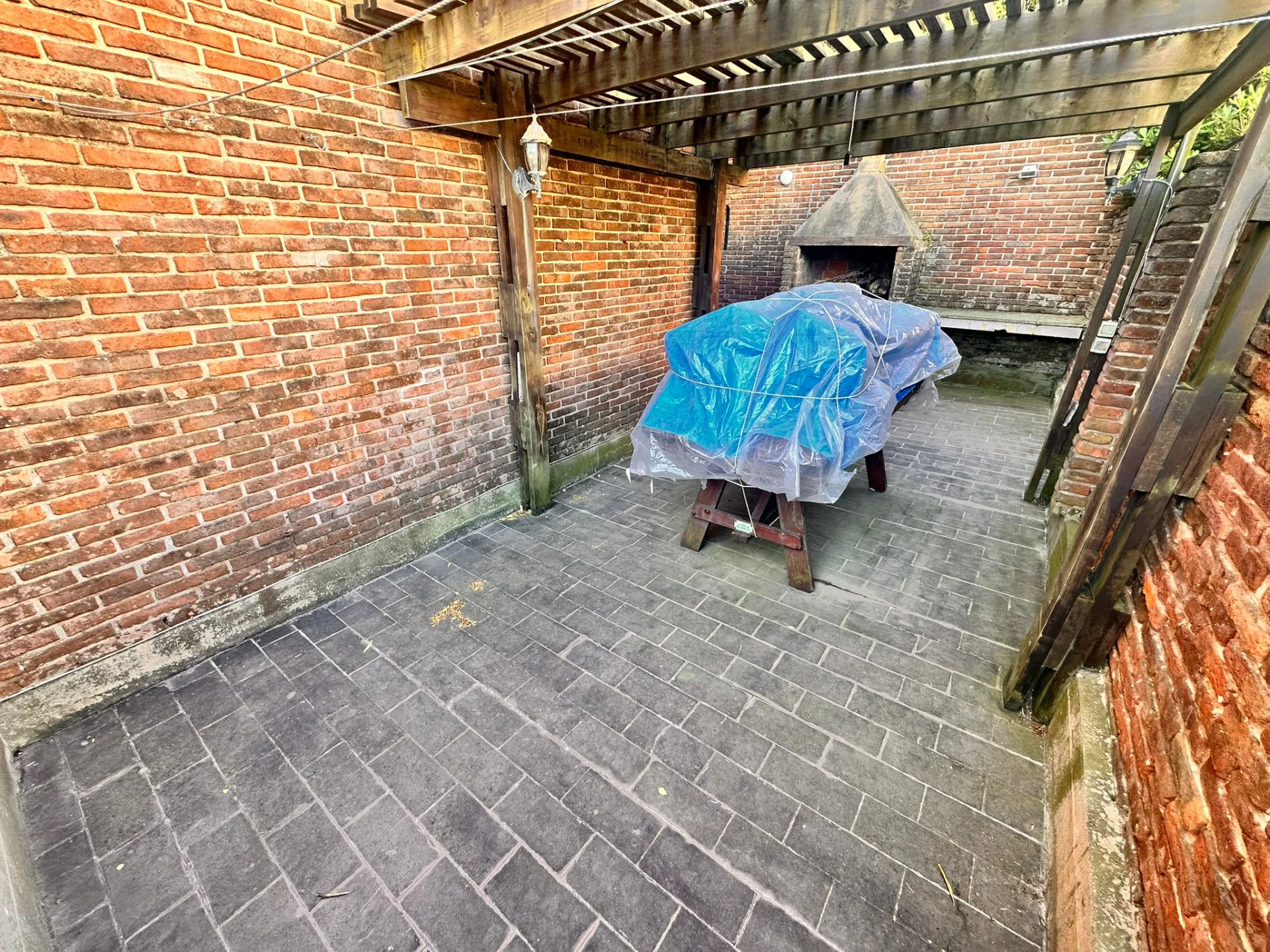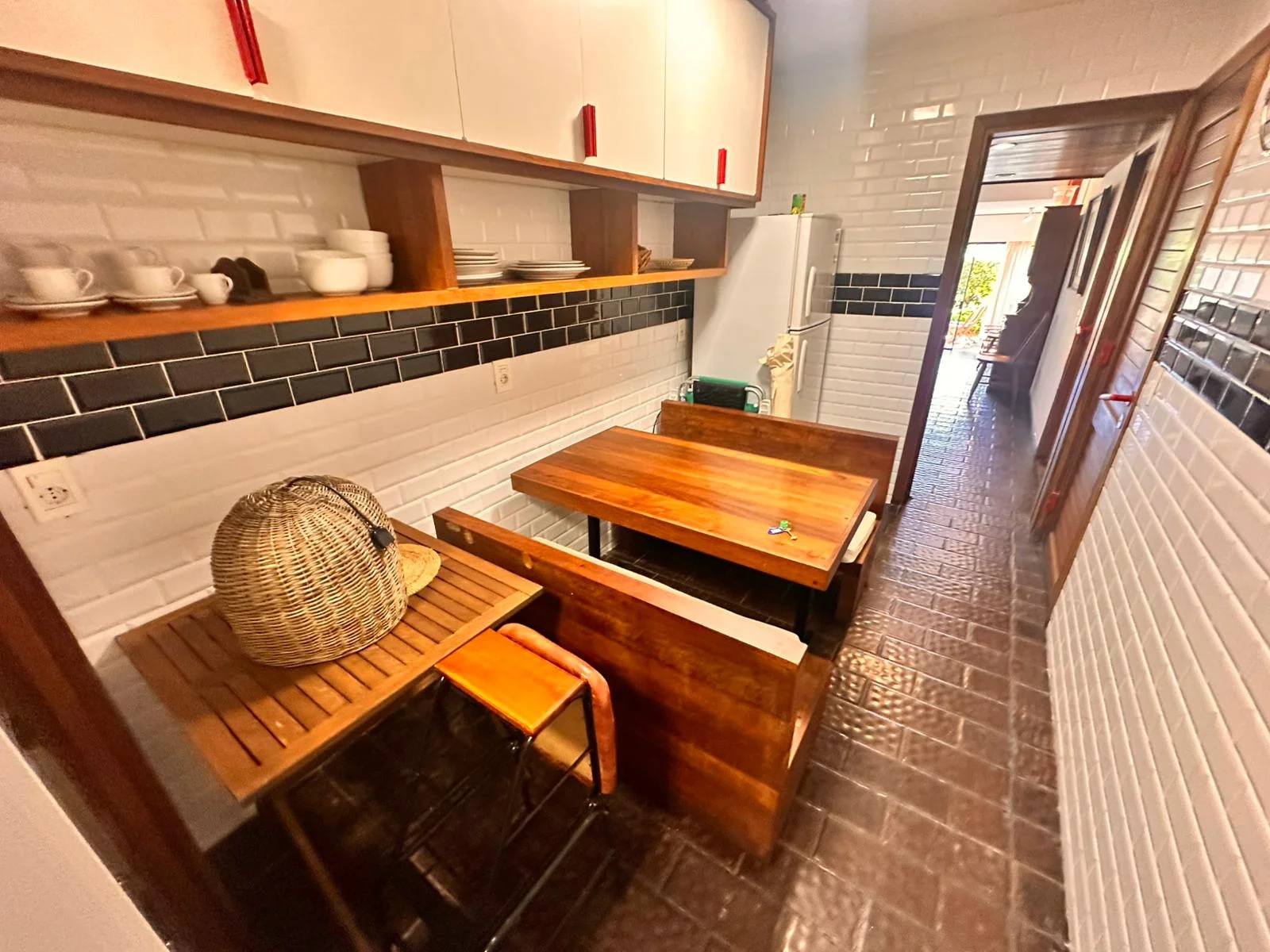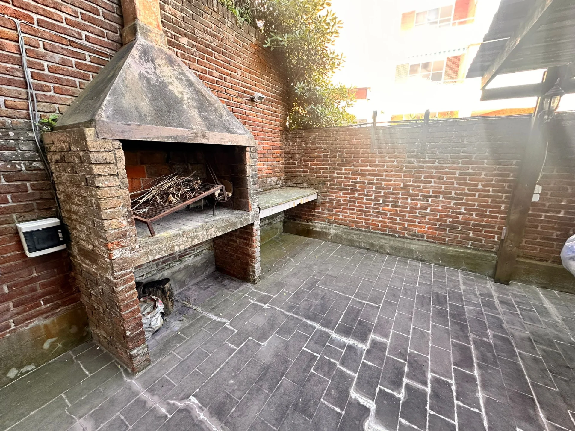 Salida posterior hacia un patio con parrillero, mesa y bancos de madera.