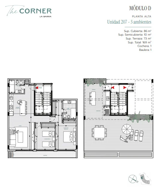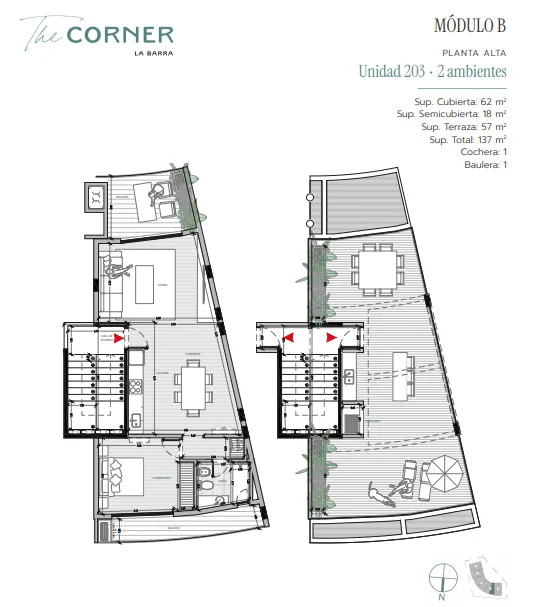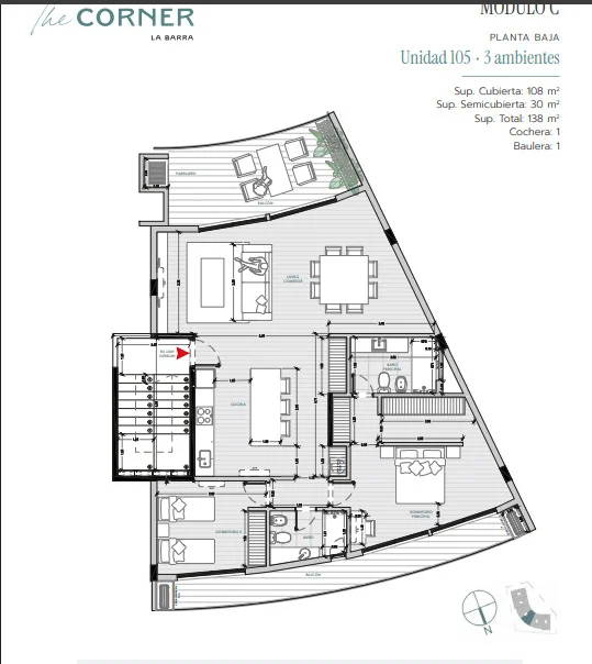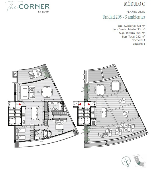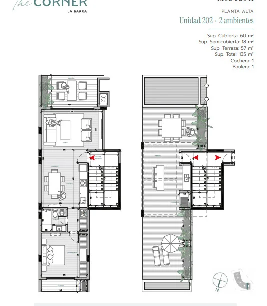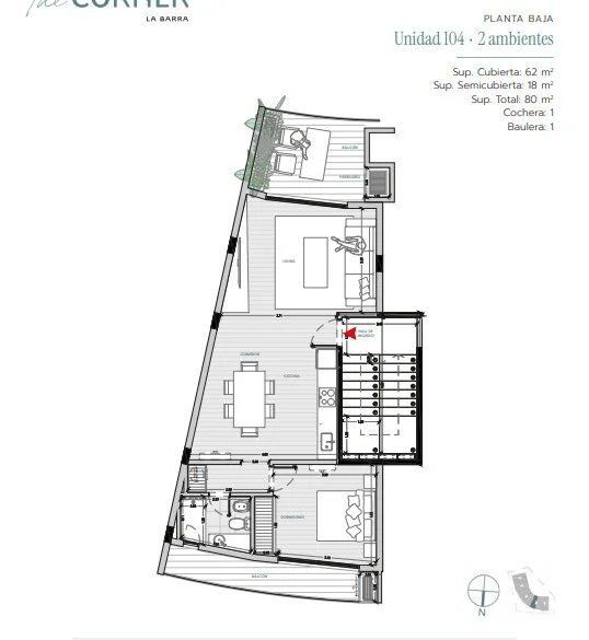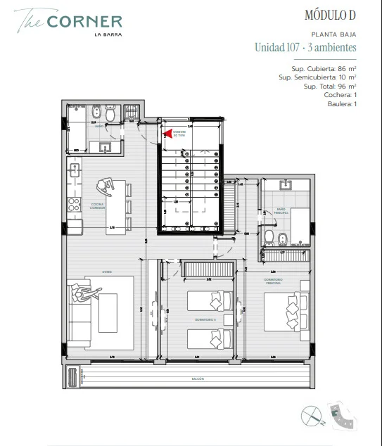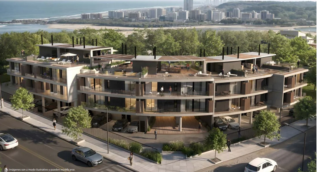 The Corner es un proyecto diseñado para quienes buscan espacios modernos, flexibles y funcionales. Se presentan 20 unidades distribuidas en 5 módulos y 2 niveles de diferentes tipologias. 1° piso: 10 unidades de unica planta alli encontramos departamentos monoambiente 1 y 2 dormitorios. 2° Piso: 10 unidades duplex con tipologías de monoambiente, 1 y 2 dormitorios. Estos departamentos tiene Rooftop de uso exclusivo para cada unidad. Todas las unidades vienen equipadas Cocina: placa vitrocerámica y horno eléctrico. Baños: acabados en porcelanato, grifería de primera línea. Aire acondicionado multisplit ya instalado Calentador de agua individual. Preinstalación para conexión a internet y TV por cable en sala de estar y dormitorios. Se incluye además el suministro y colocación de termotanques eléctricos y extractores electromecánicos en los baños. El complejo contará con: Servicio de recepción y vigilancia virtual las 24 horas, incluyendo un sistema de videovigilancia. Cámaras de videovigilancia en las entradas, el perímetro y las zonas comunes exteriores. Sistema de comunicación telefónica interna (zonas comunes, servicios y recepción). Wi-Fi: cobertura de internet inalámbrica en las zonas comunes del edificio (solarium, zonas de barbacoa, etc.). Amenities: -Piscina -Gym -Sum -Lobby -Parrillero -Servicio de Playa Los precios solamente se suministrarán a quienes estén interesados en el desarrollo. Honorarios inmobiliarios 3% + IVA