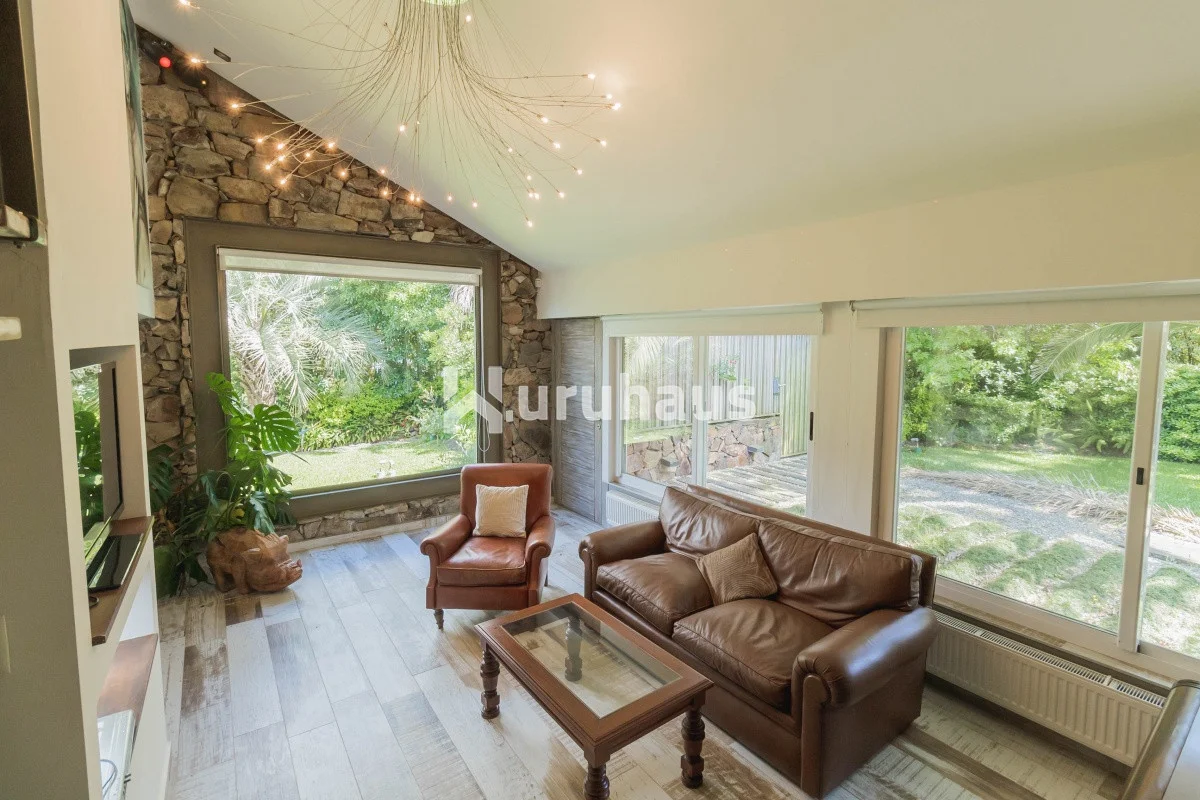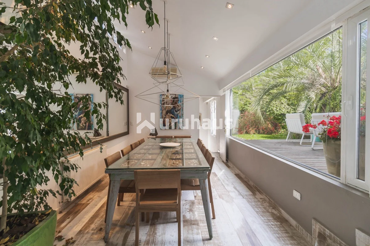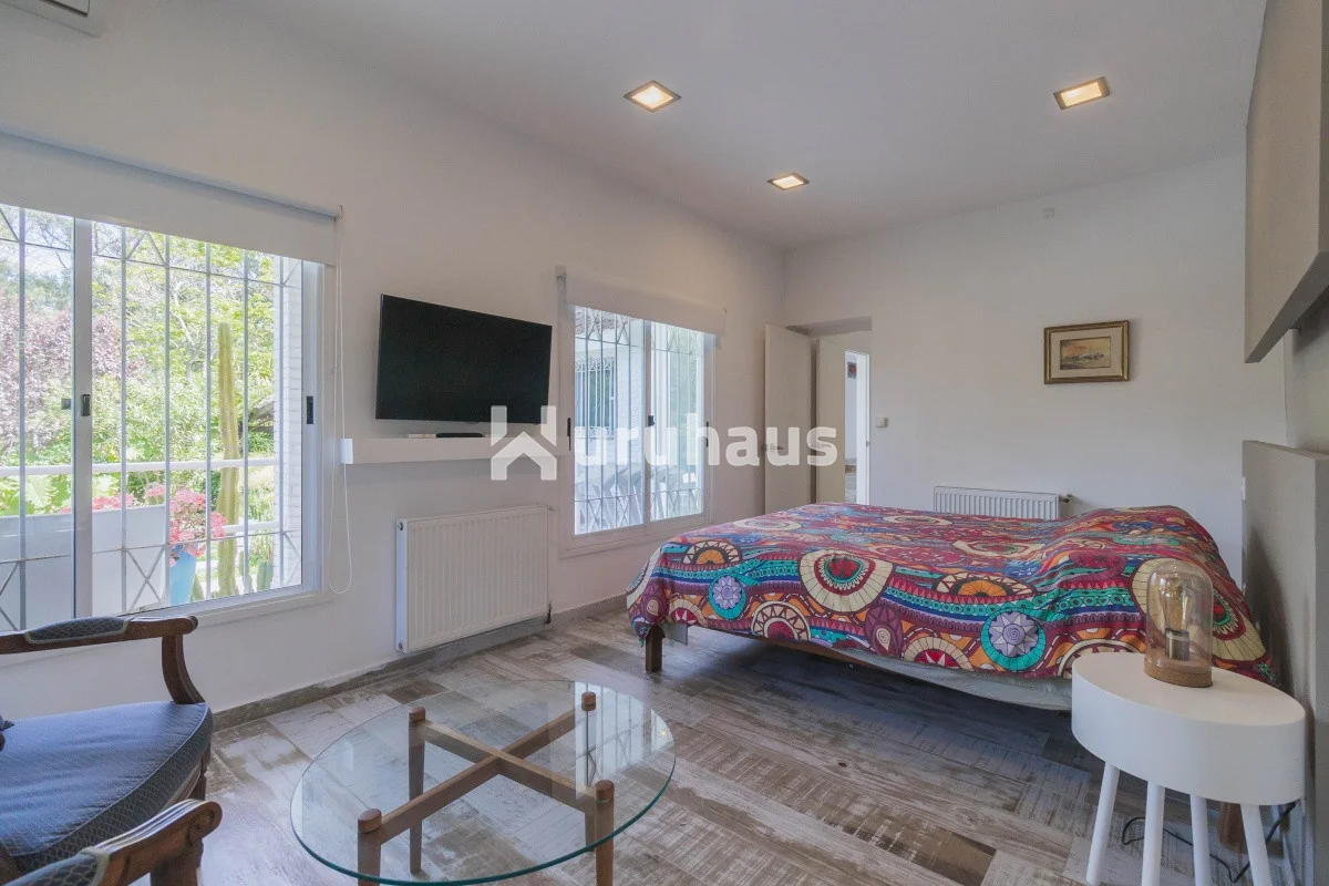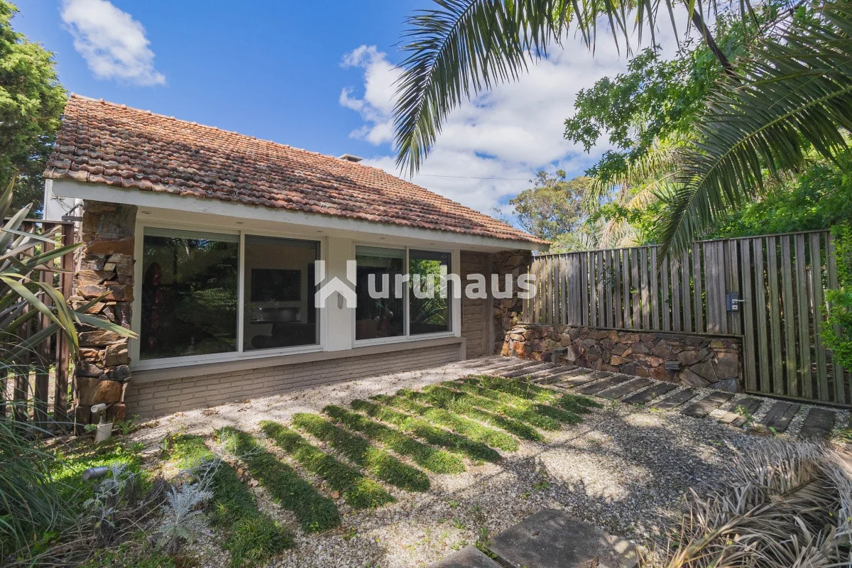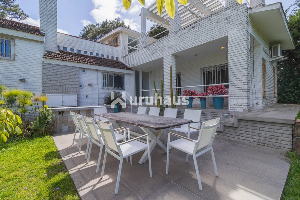 La casa está rodeada de un increíble jardín, con mucho verde y naturaleza donde podemos encontrar un parrillero externo junto a un fogonero. Espacio privado para dos autos.