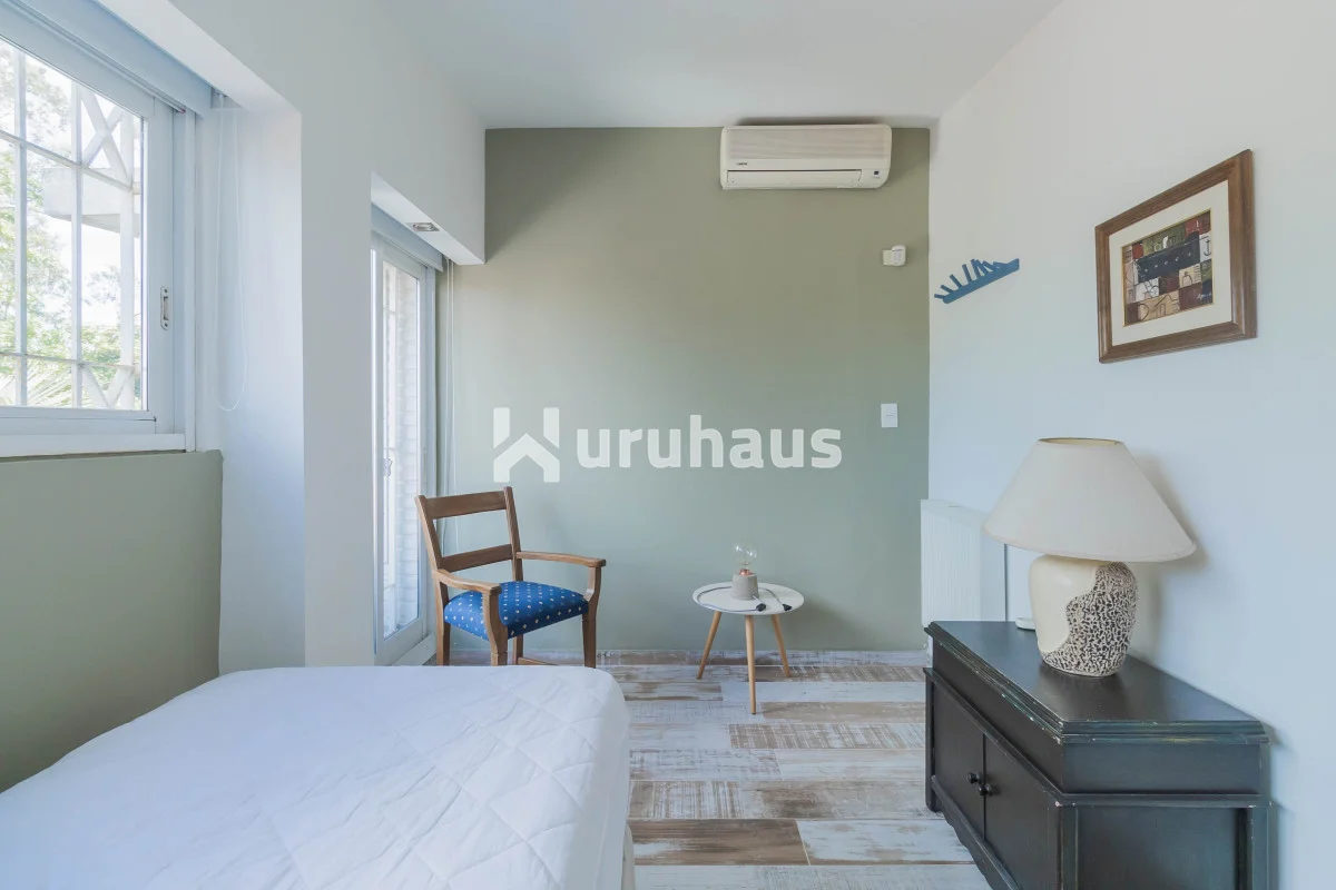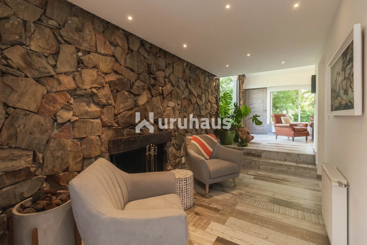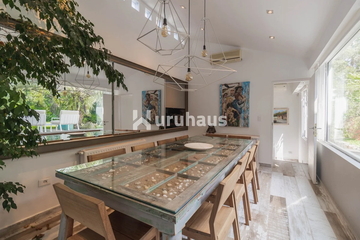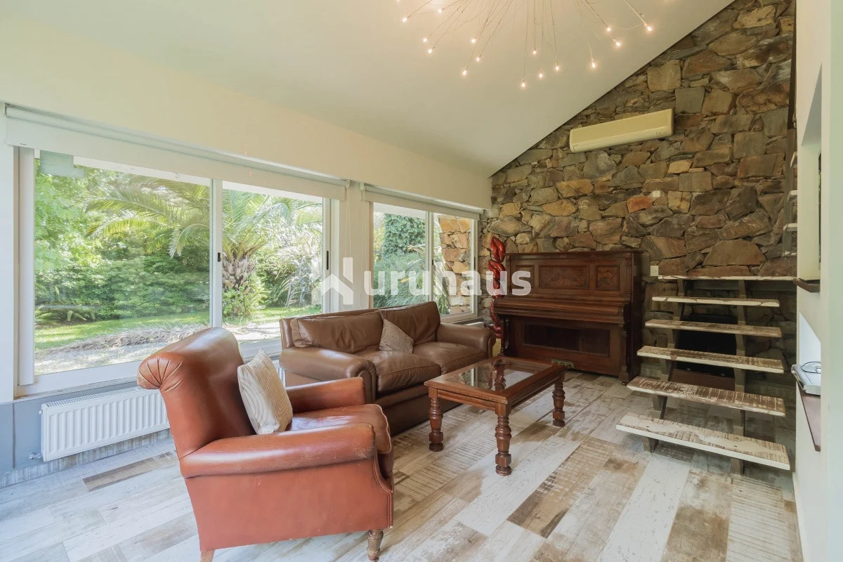 La casa está rodeada de un increíble jardín, con mucho verde y naturaleza donde podemos encontrar un parrillero externo junto a un fogonero. Espacio privado para dos autos.