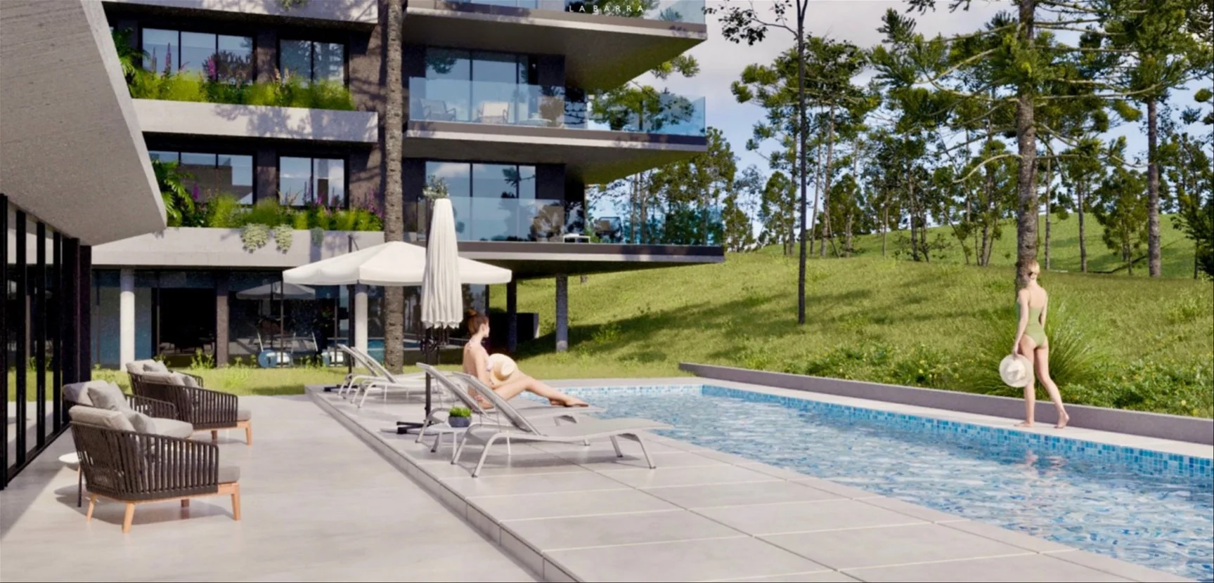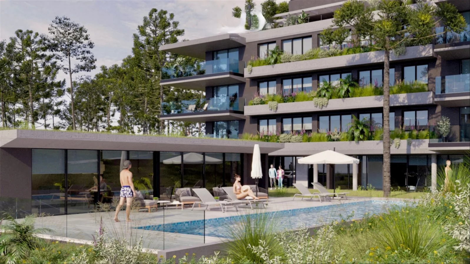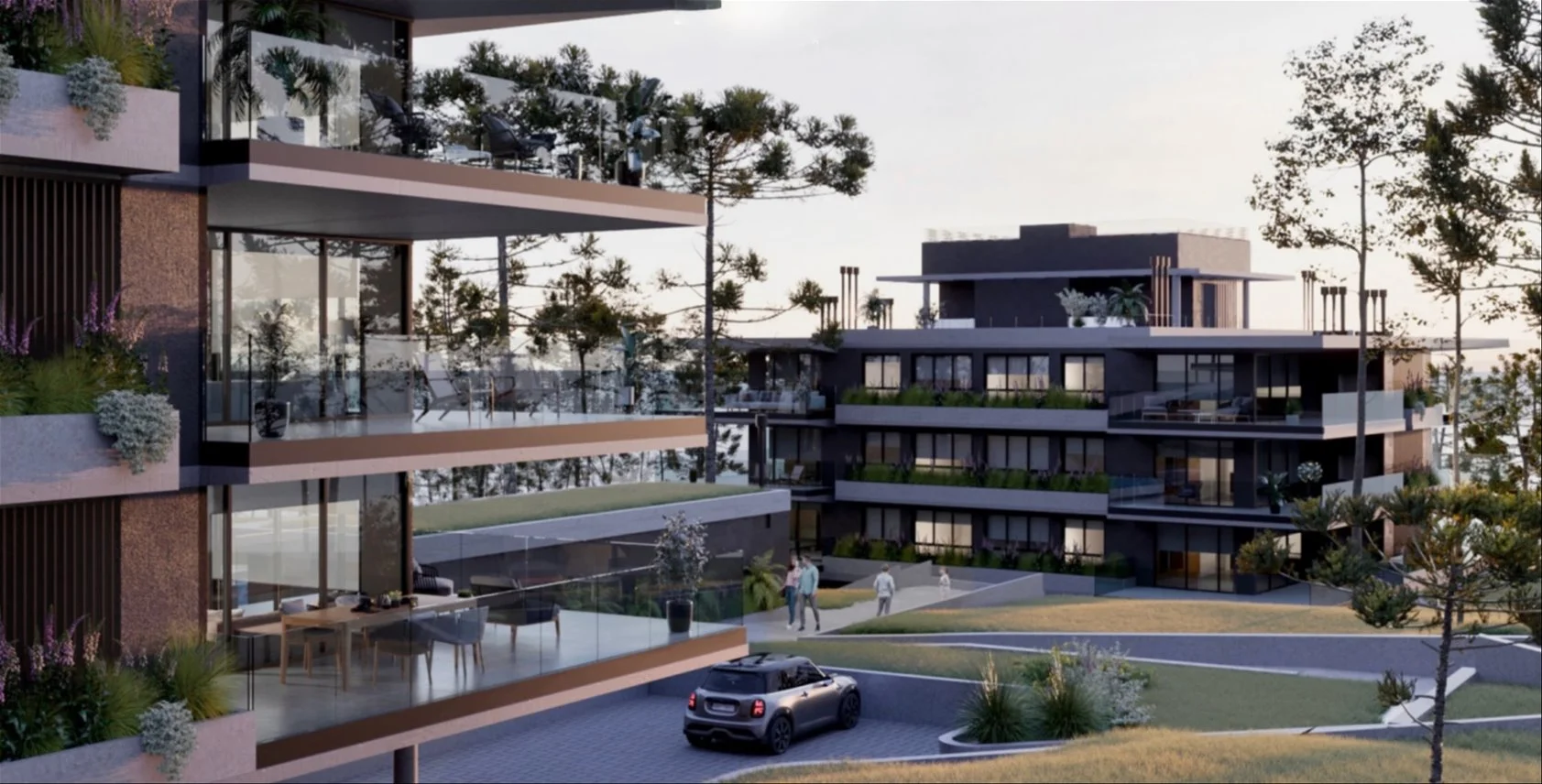 Este nuevo proyecto, se desarrolla en dos bloques de tres pisos que respetan la topografía y ensamblan en perfecta armonía el entorno del bosque y cercanía con el mar.