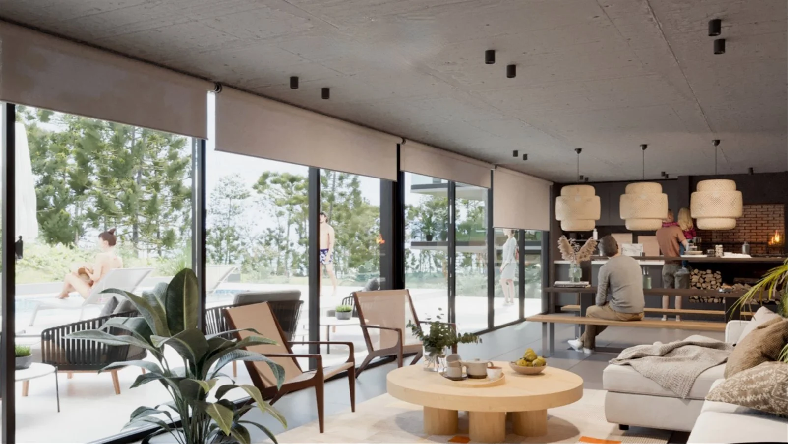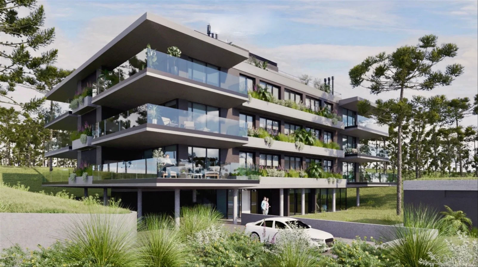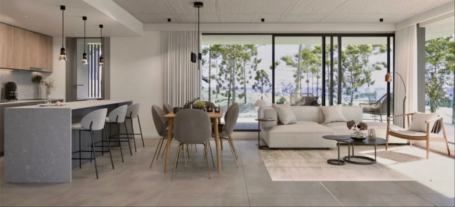 Este nuevo proyecto, se desarrolla en dos bloques de tres pisos que respetan la topografía y ensamblan en perfecta armonía el entorno del bosque y cercanía con el mar.