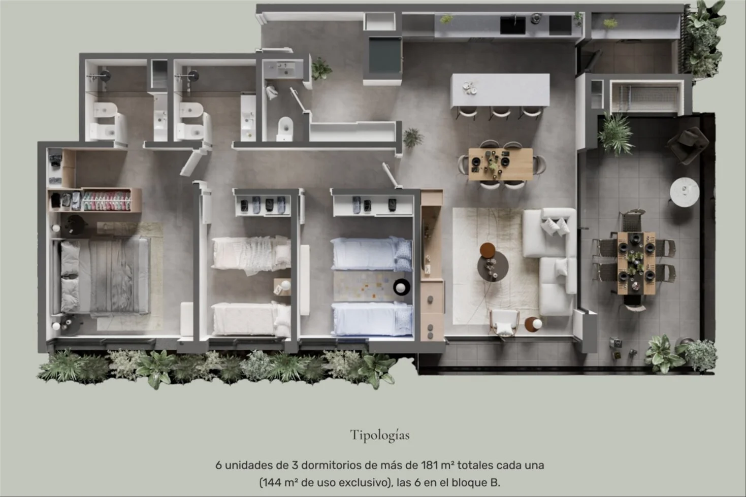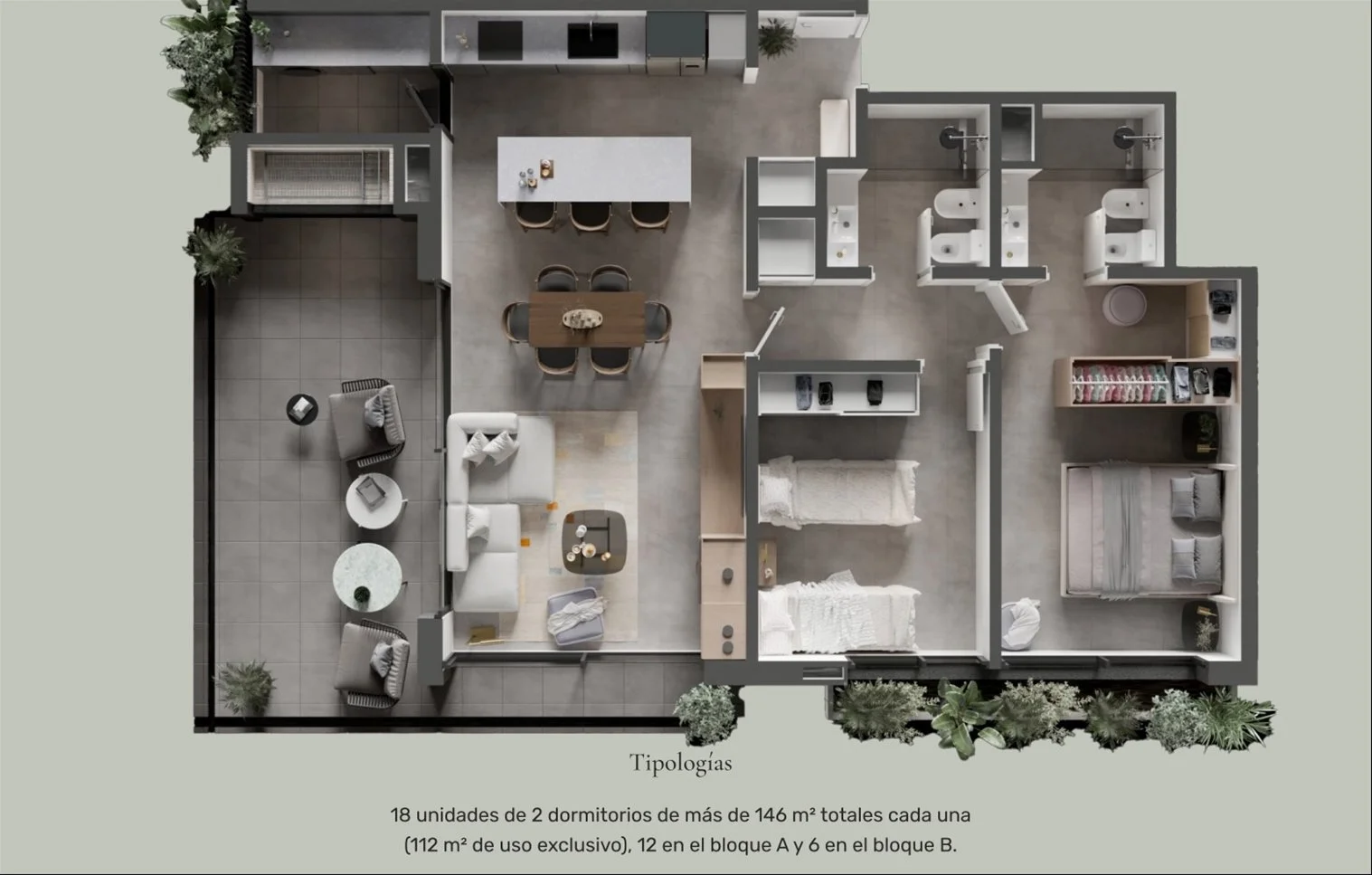Cuenta con 24 unidades, 18 de dos dormitorios y 6 de tres dormitorios, con acondicionamiento térmico para vivir todo el año (losa radiante, aire acondicionado inverter en todos los ambientes, estufa de alto rendimiento), equipamiento (horno, anafe, campana y extractores), amenities y dos cocheras por unidad. El programa arquitectónico contará con certificación ambiental Edge e incluirá estaciones de carga para autos eléctricos, piscina, gimnasio, salón de usos múltiples y seguridad.