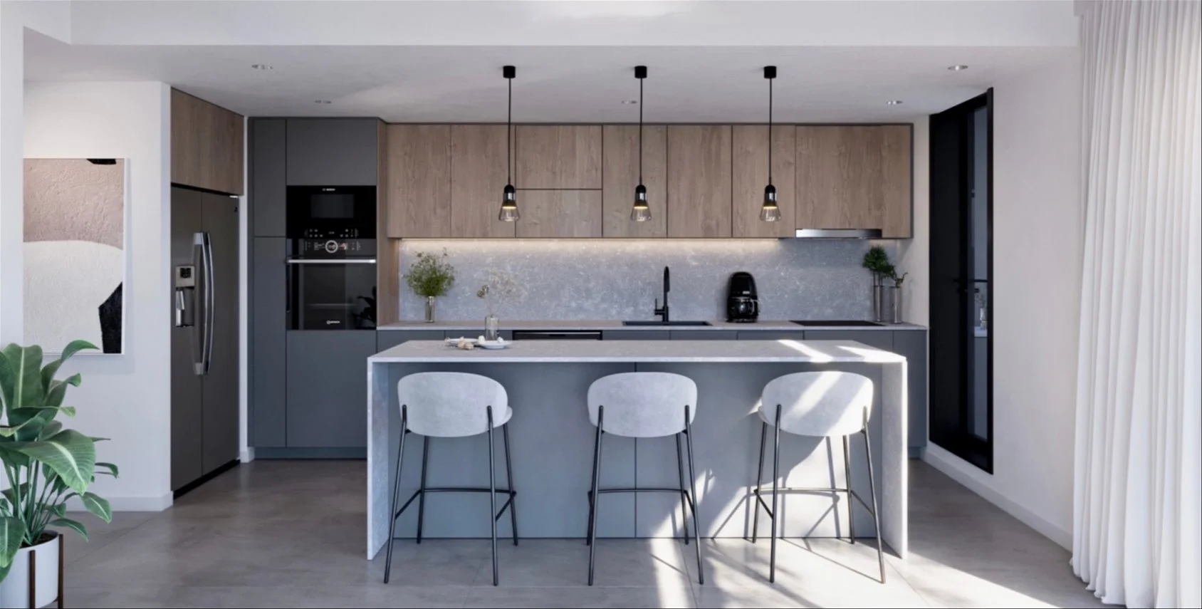 Cocinas integradas con amplias mesadas e islas, equipadas con horno, anafe y campana.