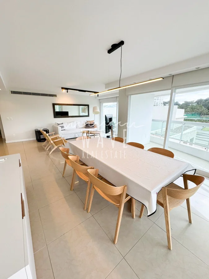 Al ingresar, te recibe un amplio y luminoso living comedor rodeado de ventanales de piso a techo que bañan el espacio con luz natural durante la mañana. El balcón envolvente amplía aún más los ambientes. Los interiores están decorados con detalles de alta calidad y tonos neutros, creando un ambiente cálido y sofisticado.