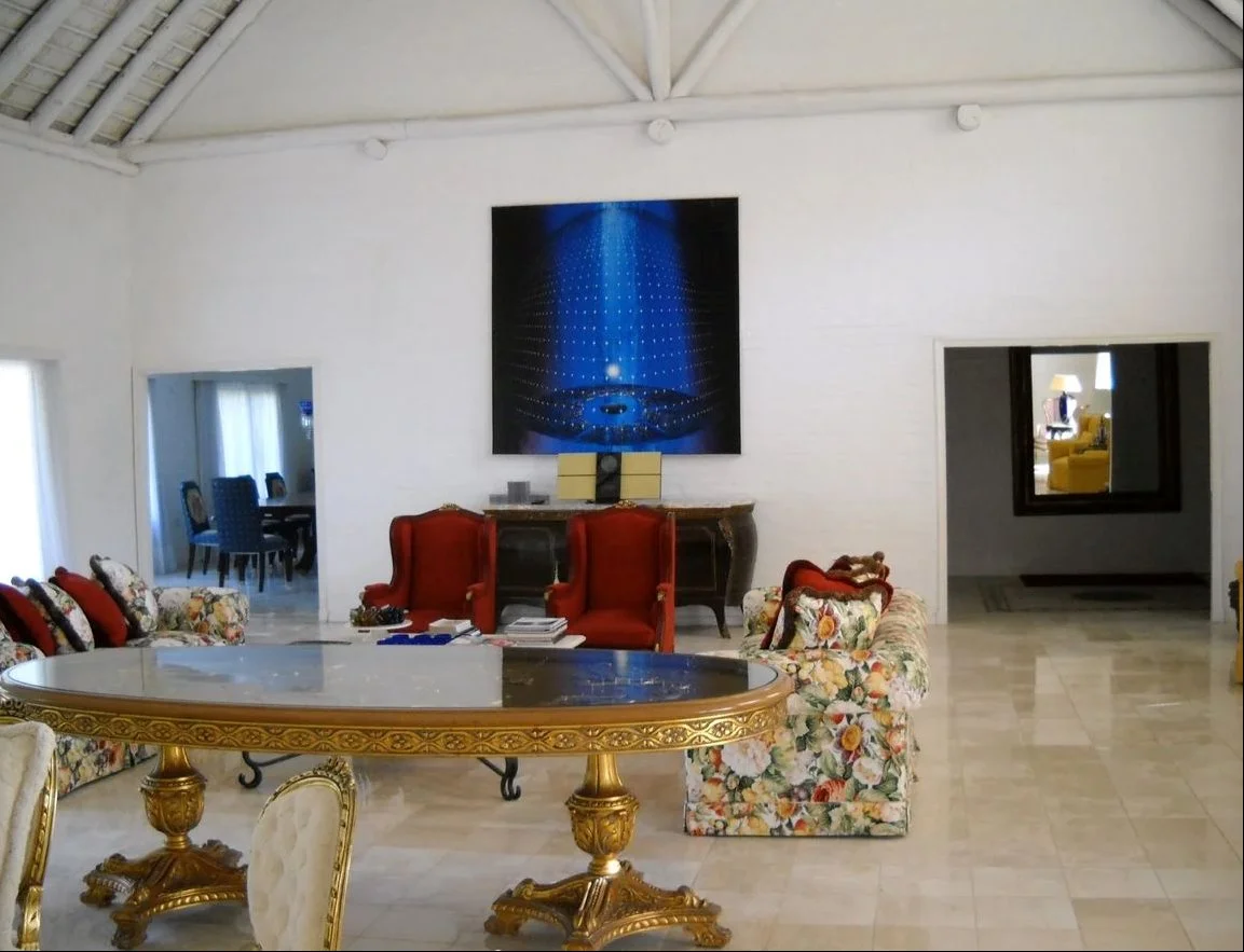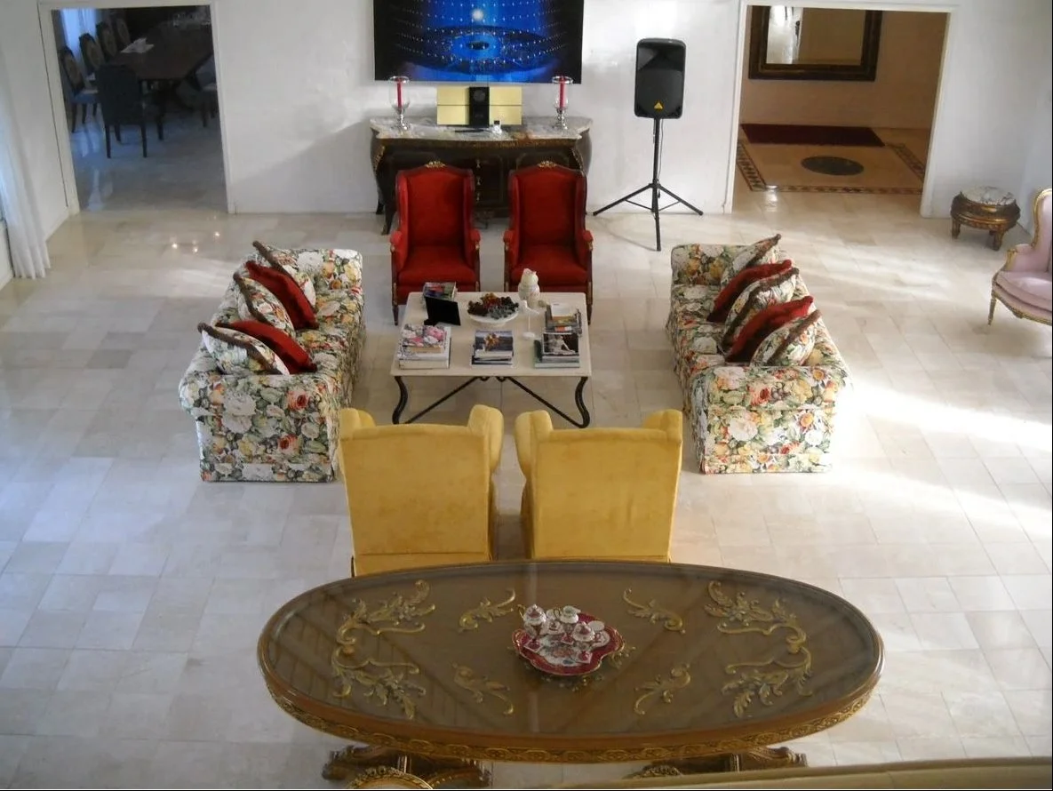 • Amplio living principal de 100 m² con ventanales y mobiliario de estilo francés.