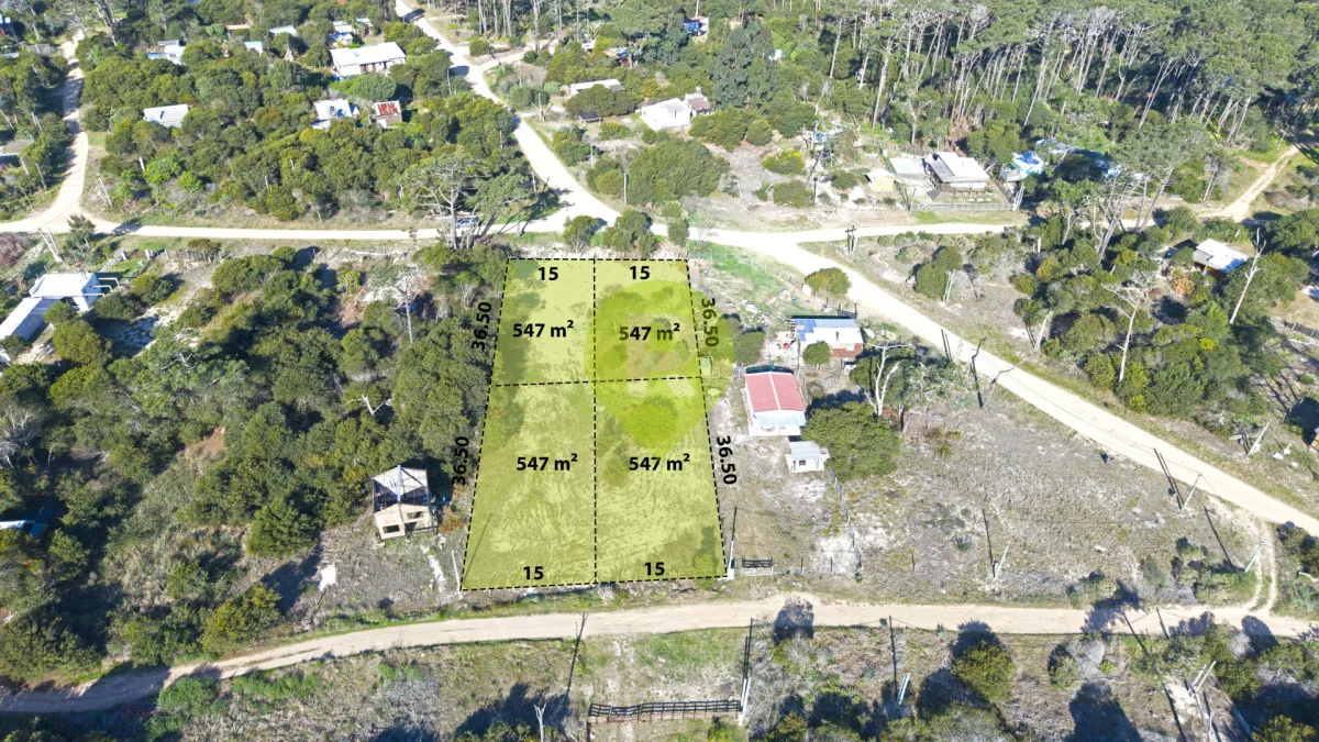 Se venden cuatro lotes linderos ubicados en Playa Serena, La Paloma. Cada lote cuenta con una superficie de 547 m², con 15 metros de frente por 36,50 metros de fondo.