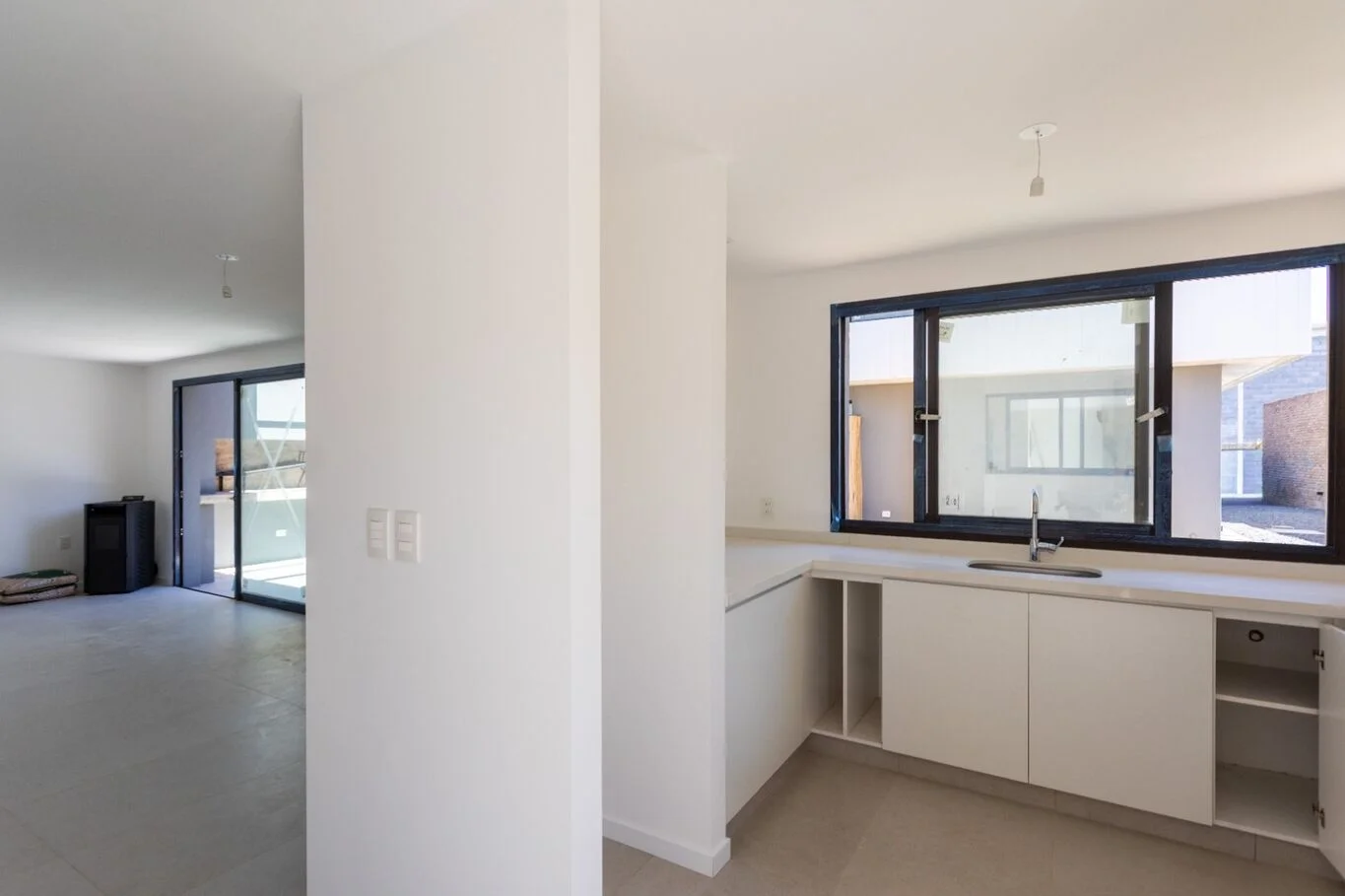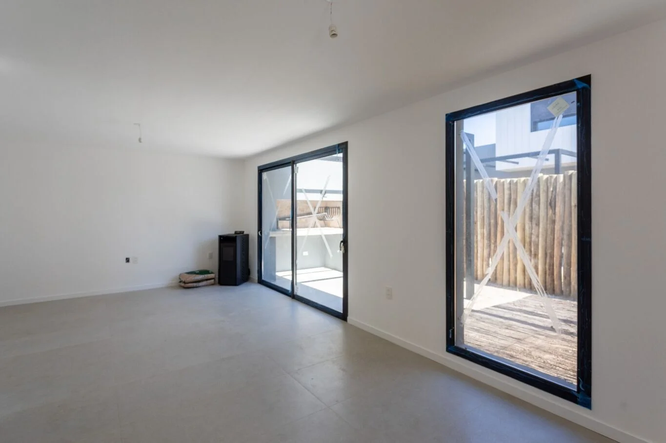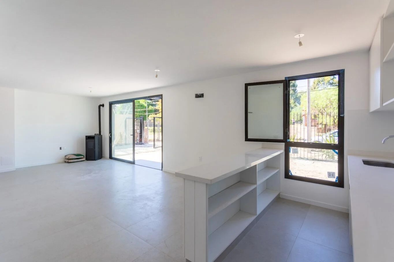 Living comedor con estufa de alto rendimiento, cocina integrada y salida a jardín con pérgola y parrillero, a pocos metros de Sodimac y Gianatassio.