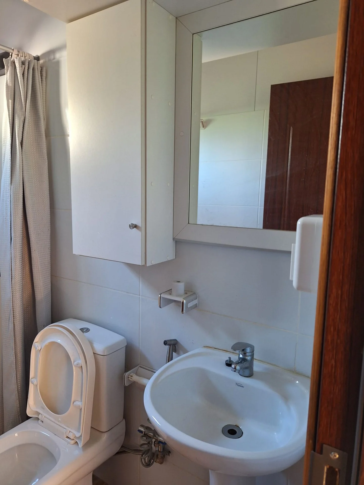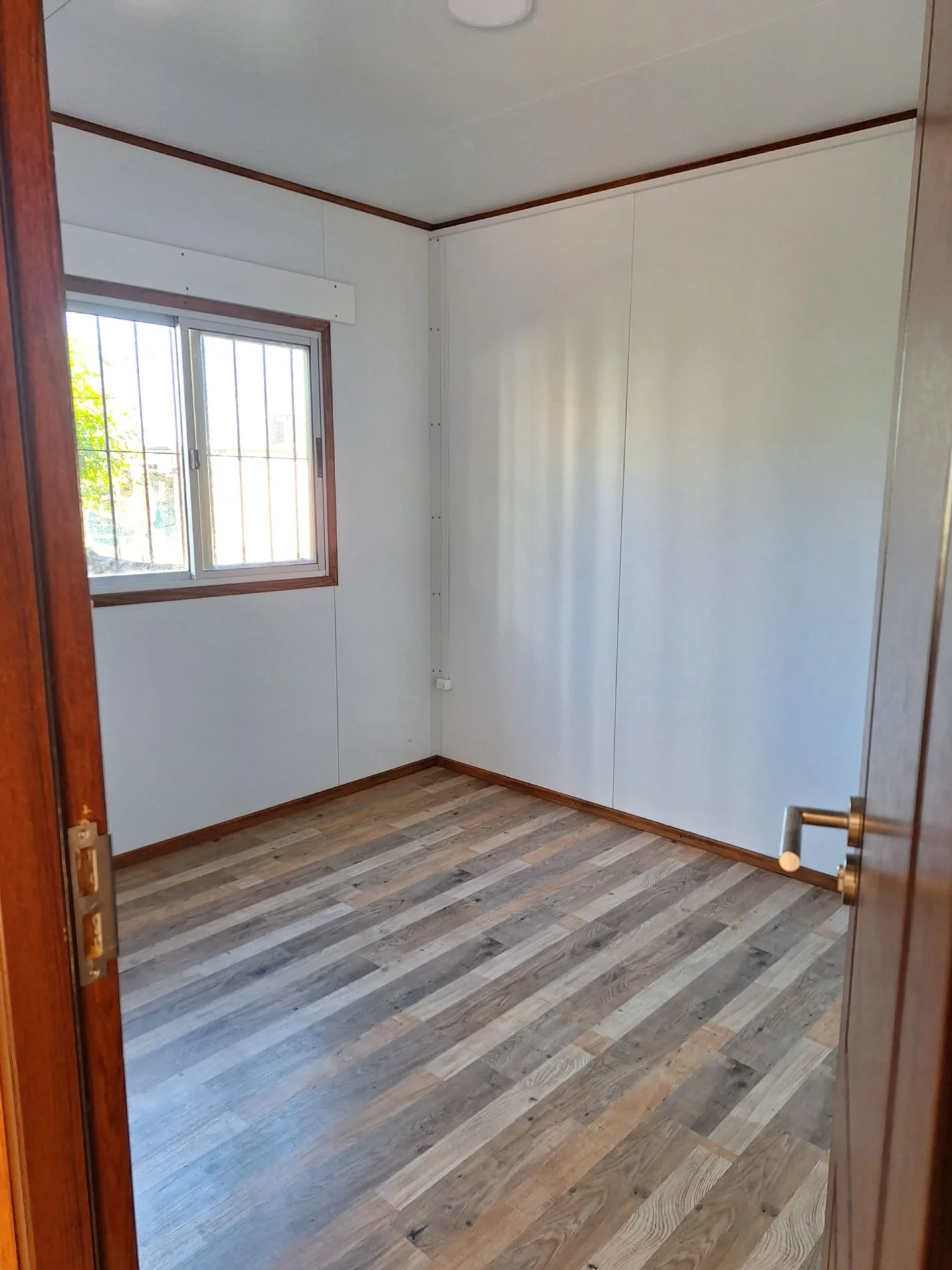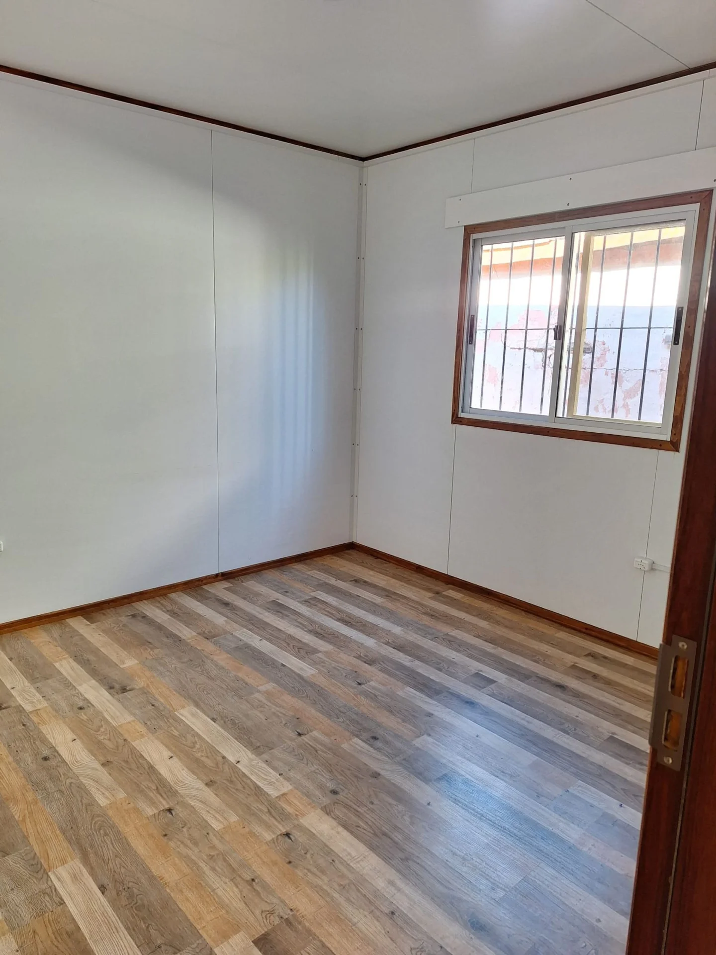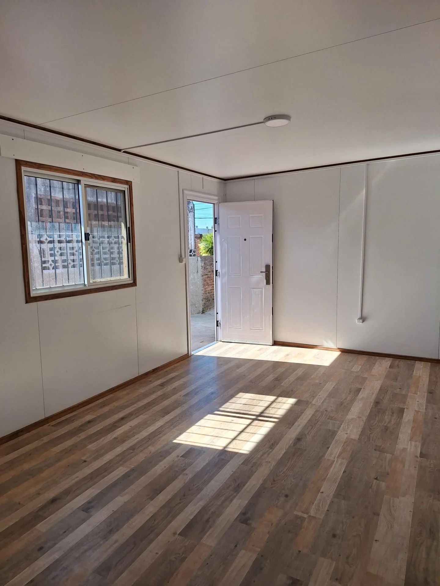 La puerta principal y las interiores son de madera y las ventanas de aluminio con mosquitero y rejas.