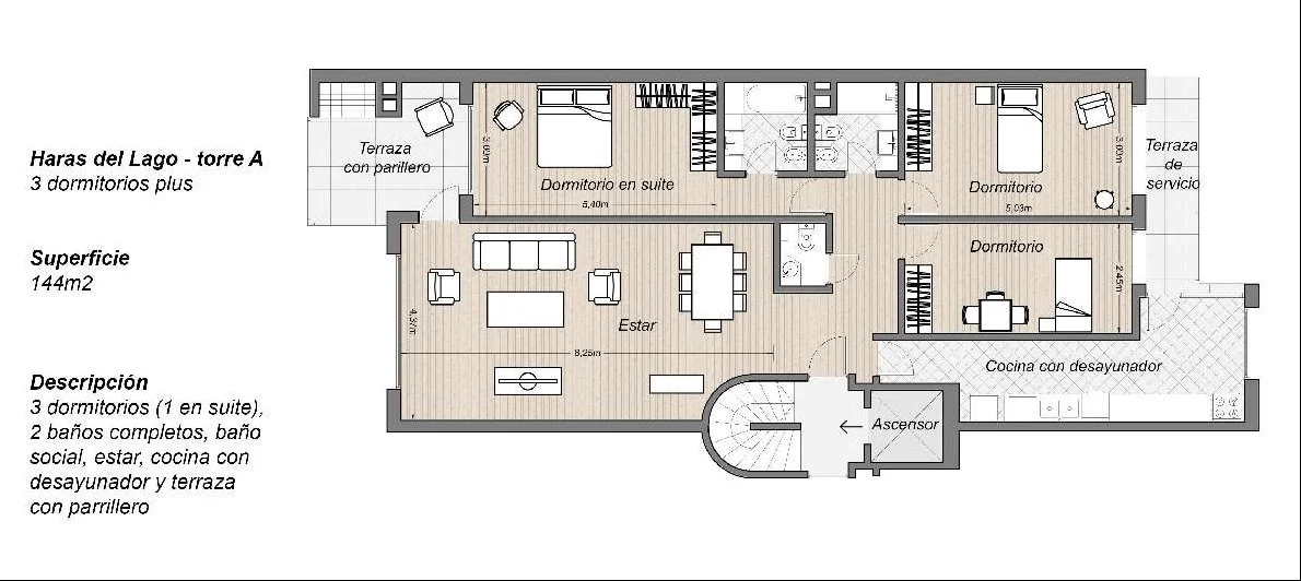 Dormitorio principal en suite, con buenos placares y salida a terraza. Dos dormitorios secundarios con placares comparten un segundo baño completo.