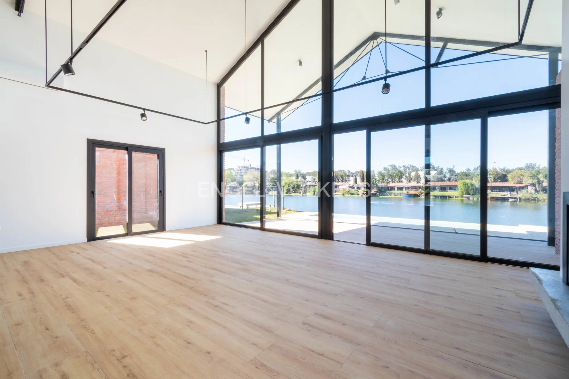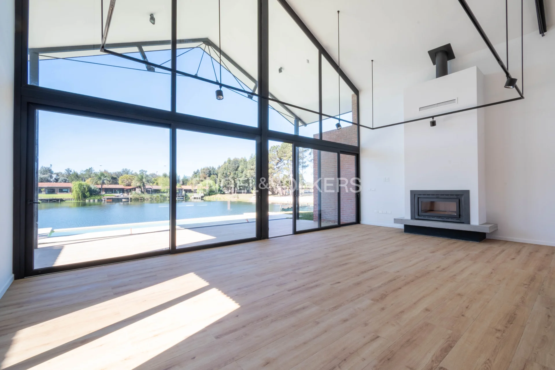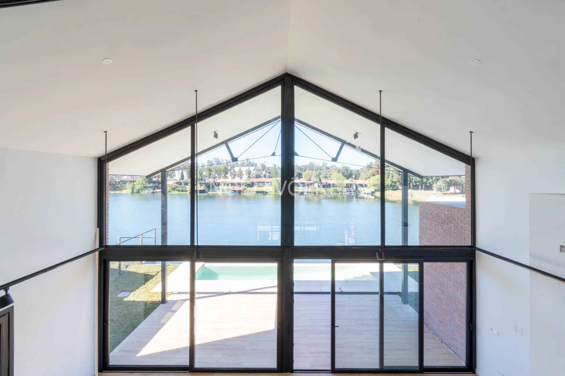 El area social esta comprendida por una gran espacio de living comedor con doble altura y techo a dos aguas con un gigantesco ventanal apaisado orientado al Este con vista al lago. El mismo techo se proyecta al exterior dando cubierta a una amplia galeria en contacto con el jardín y la piscina que cierra casi todo el flanco entre el terreno y el lago y otorga una continuidad visual entre el agua de la piscina y la del lago cuya superficie está 2 metros por debajo del nivel de piso de la casa, lo que hace del entorno algo muy panorámico y seguro. El living comedor cuenta con una estufa de alto rendimiento, y con una estructura de iluminación muy decorativa montada suspendida del techo. Hacia el lado del acceso tiene en la pared un porton corredizo con espejos, que permite flexibizar el contacto de los ambientes, visto que permite tener todo vinculado colocado al centro, o hacia un extremo aislar el hall de acceso del área social, o hacie el extremo opuesto aislar la cocina del área social.