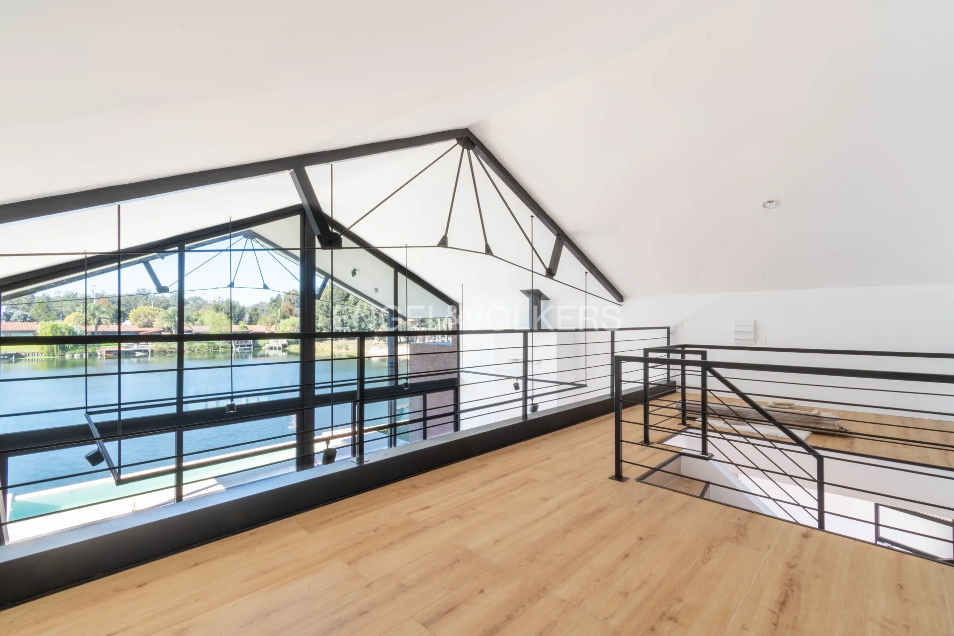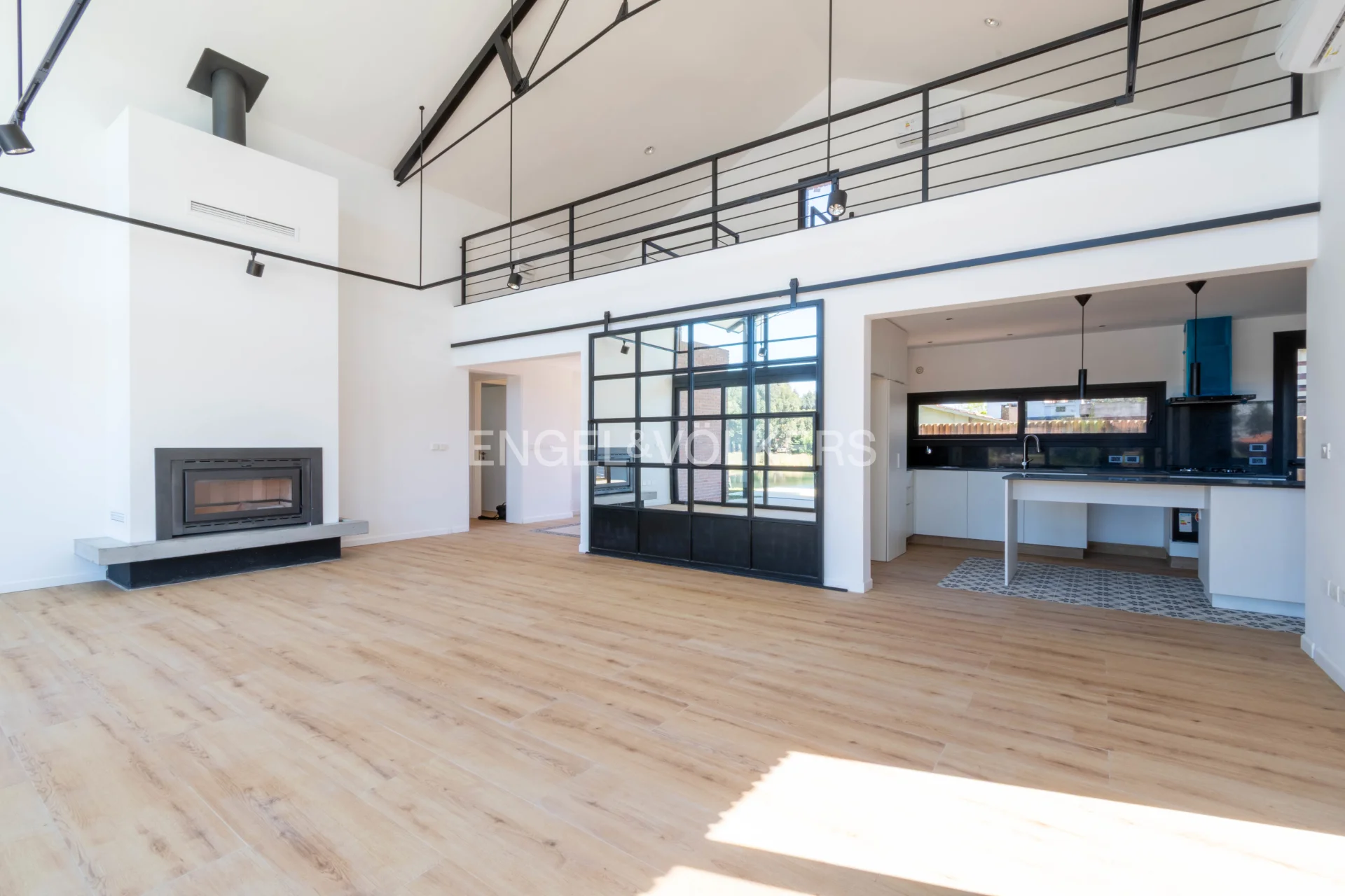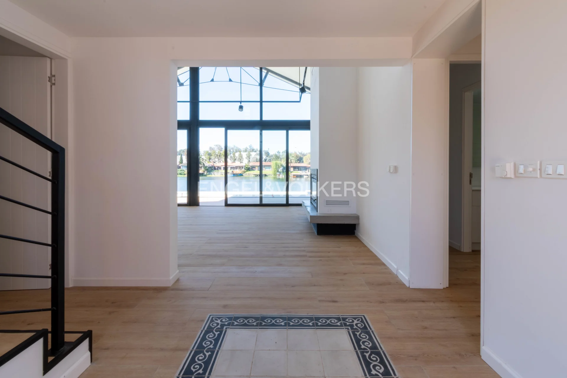 El area social esta comprendida por una gran espacio de living comedor con doble altura y techo a dos aguas con un gigantesco ventanal apaisado orientado al Este con vista al lago. El mismo techo se proyecta al exterior dando cubierta a una amplia galeria en contacto con el jardín y la piscina que cierra casi todo el flanco entre el terreno y el lago y otorga una continuidad visual entre el agua de la piscina y la del lago cuya superficie está 2 metros por debajo del nivel de piso de la casa, lo que hace del entorno algo muy panorámico y seguro. El living comedor cuenta con una estufa de alto rendimiento, y con una estructura de iluminación muy decorativa montada suspendida del techo. Hacia el lado del acceso tiene en la pared un porton corredizo con espejos, que permite flexibizar el contacto de los ambientes, visto que permite tener todo vinculado colocado al centro, o hacia un extremo aislar el hall de acceso del área social, o hacie el extremo opuesto aislar la cocina del área social.