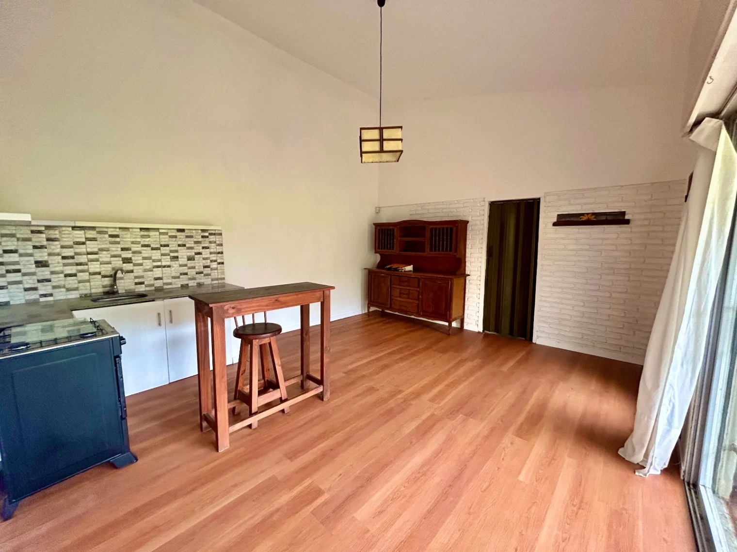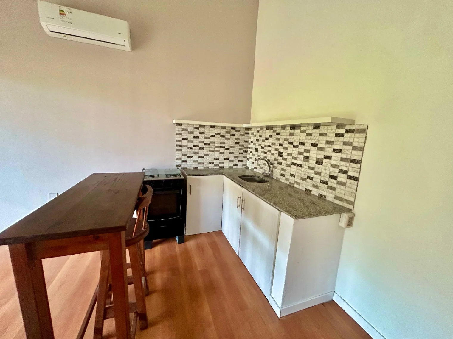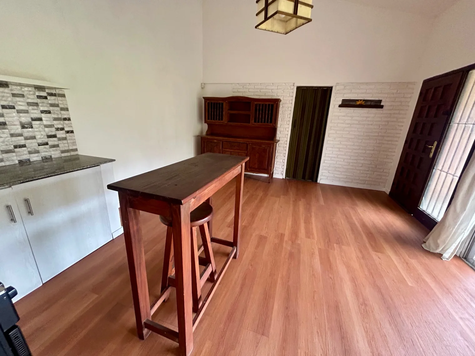 El inmueble cuenta con un ambiente principal que incluye un dormitorio equipado con estufa de hierro y placard empotrado. Cuenta con un baño completo. La cocina integrada, que se complementa con un desayunador, se integra perfectamente con el living comedor, creando un área social ideal para disfrutar de momentos en familia. Además, la orientación sur permite una excelente iluminación natural a lo largo del día.
