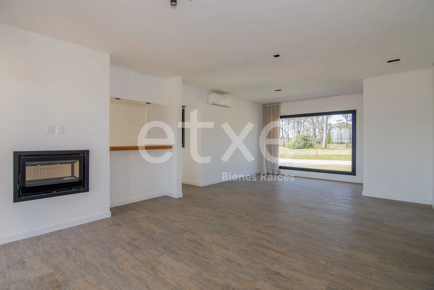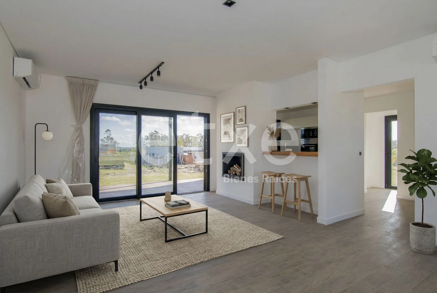 Living comedor con estufa a leña, cocina semi integrada y baños social.