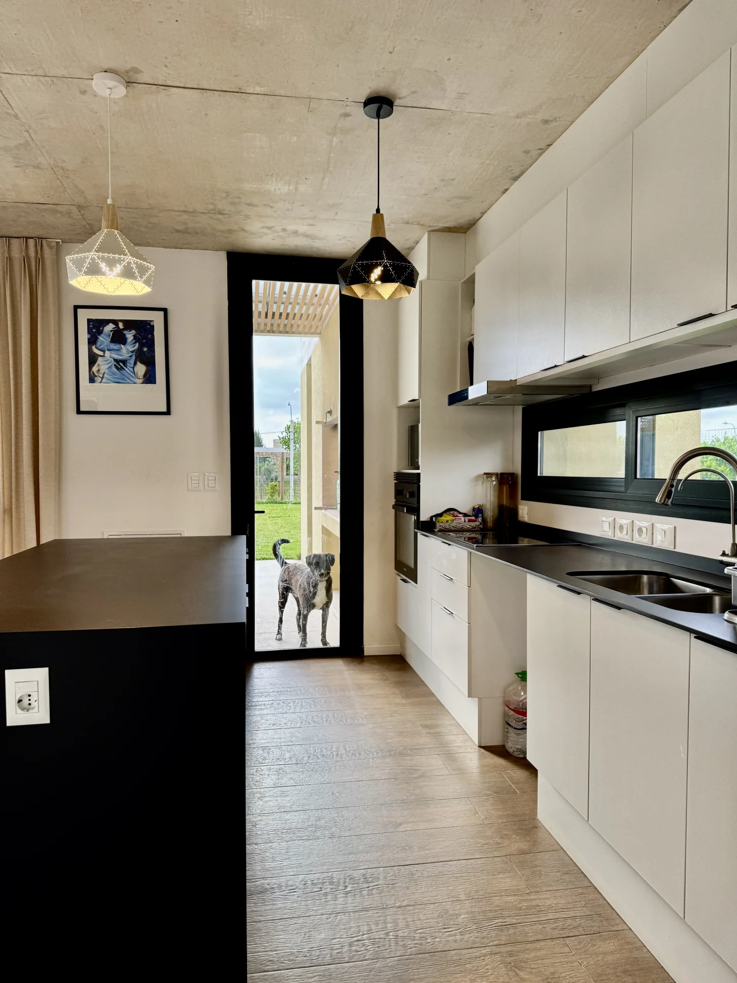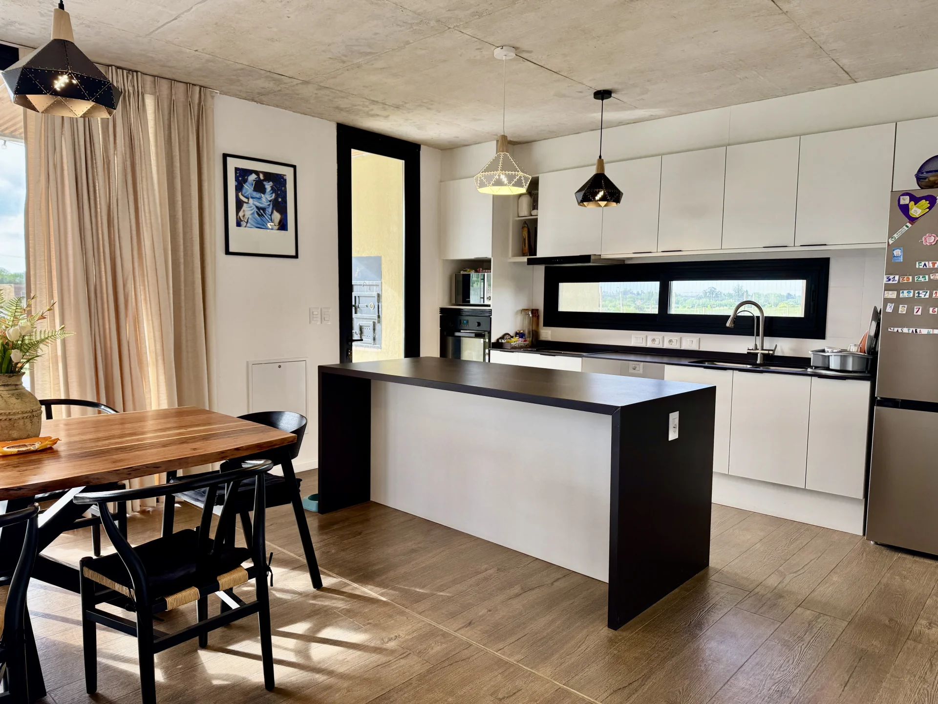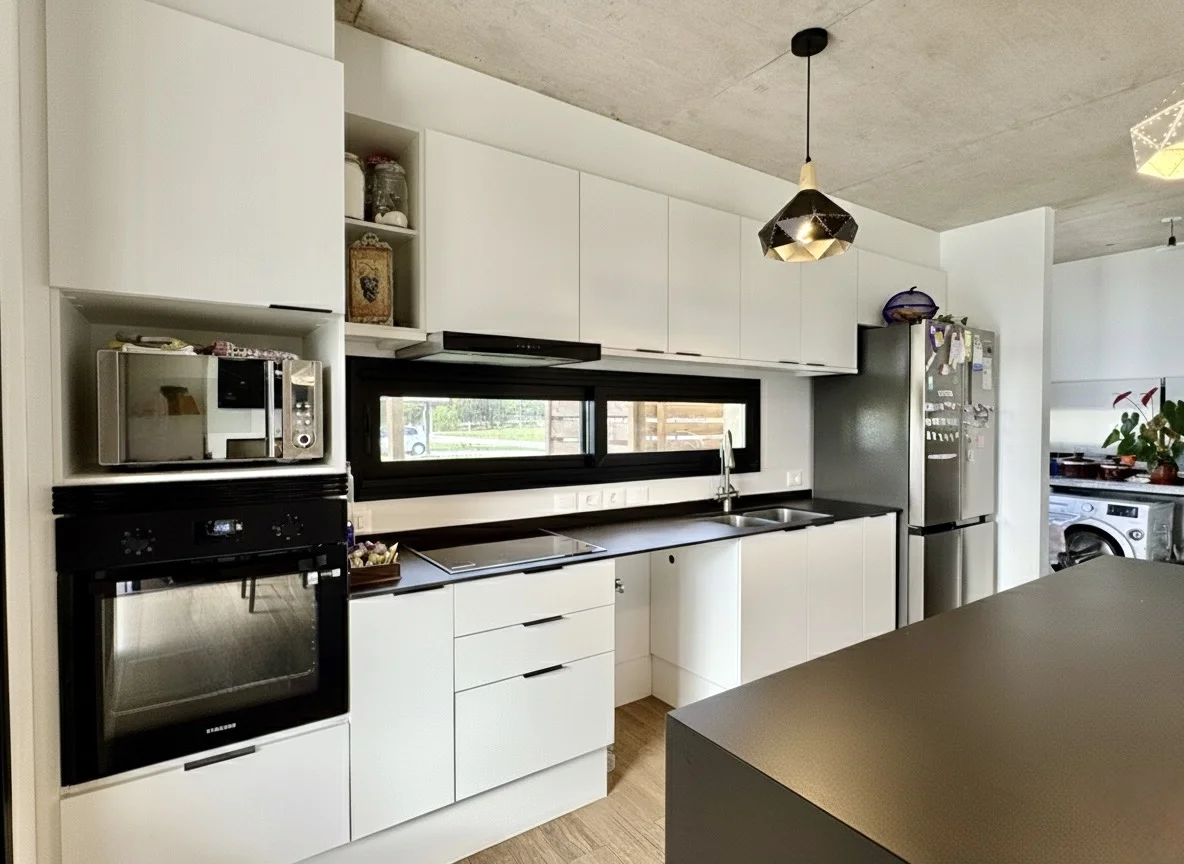 Cocina integrada con barra, equipada con horno, anafe y campana.