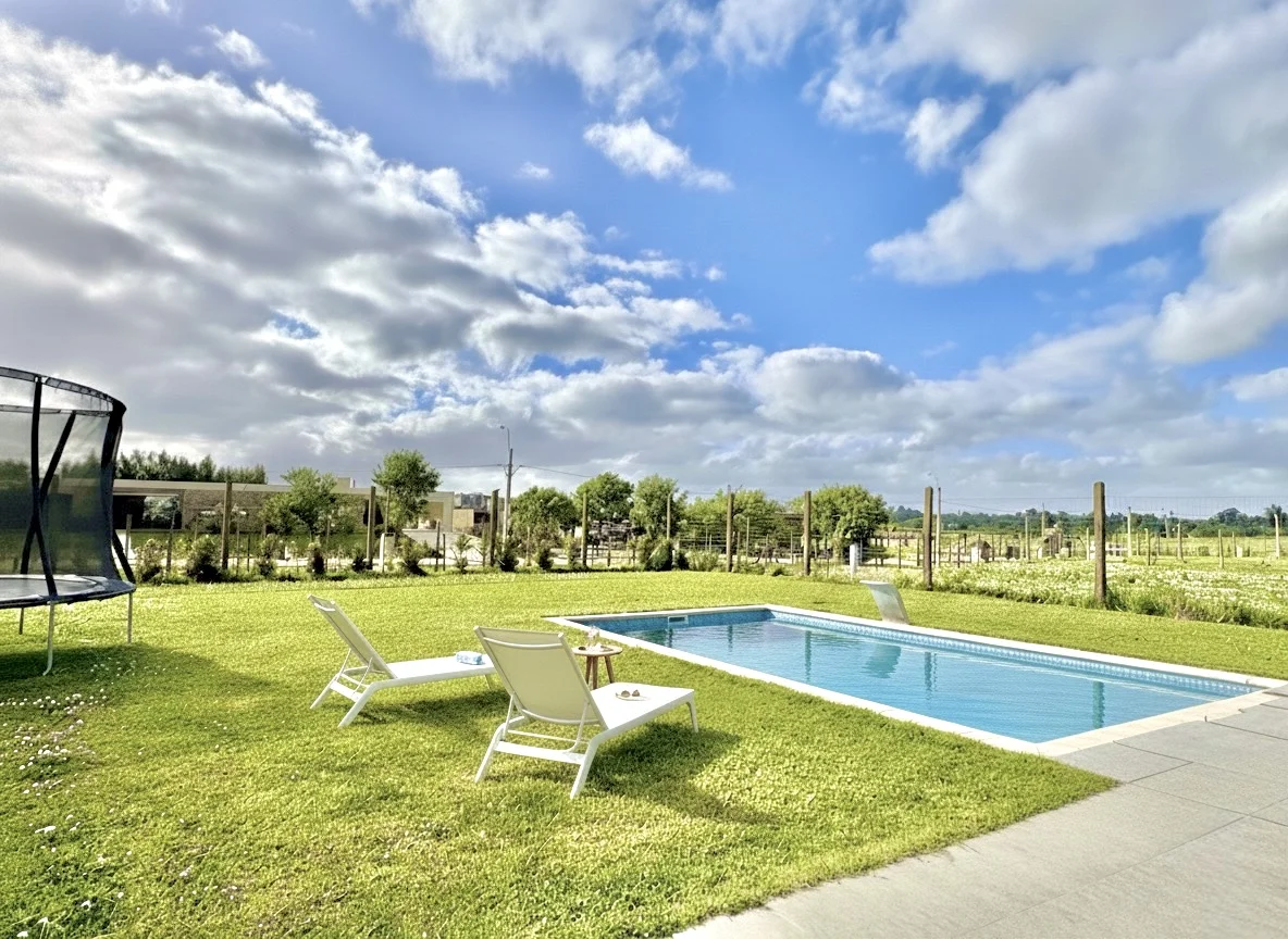 Fondo verde con piscina climatizada, parrillero techado y horno a leña.
