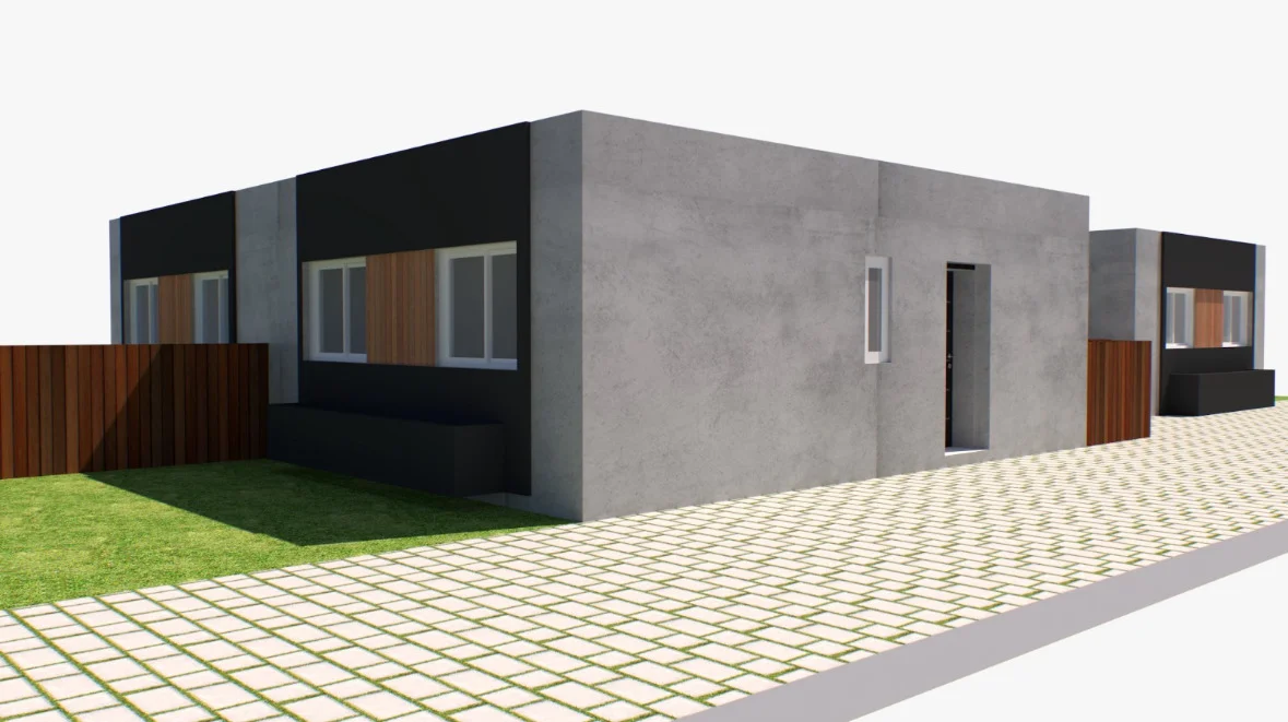 Complejo de tres unidades iguales en formato PH, con dos unidades al frente y una unidad al fondo independiente.