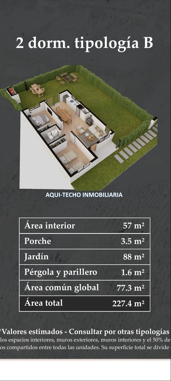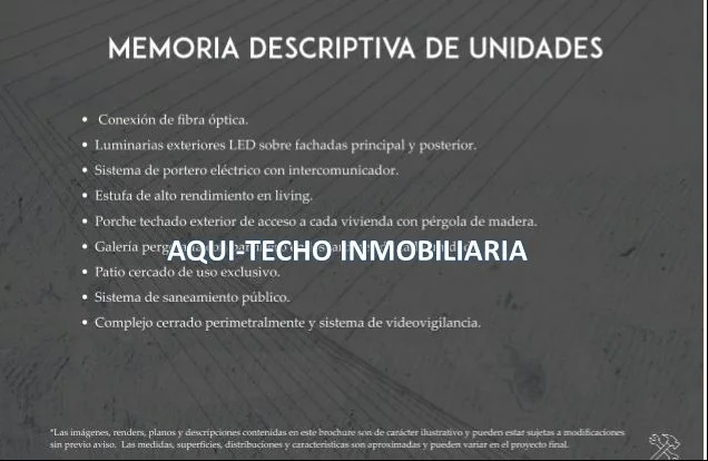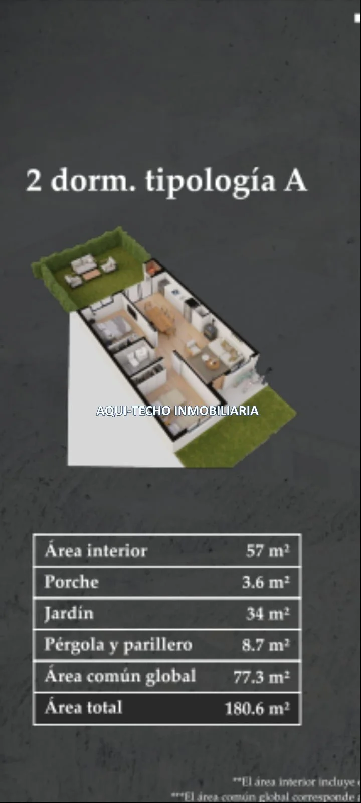 Cocina integrada.con placares superiores e inferiores, mesada de granito. Gran ventanal con salida al fondo de 34 mts, con parrillero y pérgola. Dos Dormitorios amplios con placares y persianas. Entrada con porch de 3,6 mts. Cochera. Área total 180,6 mts. Precio desde usd 135.000. Gastos de conexión 2%. Comisión Inm