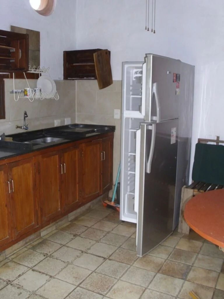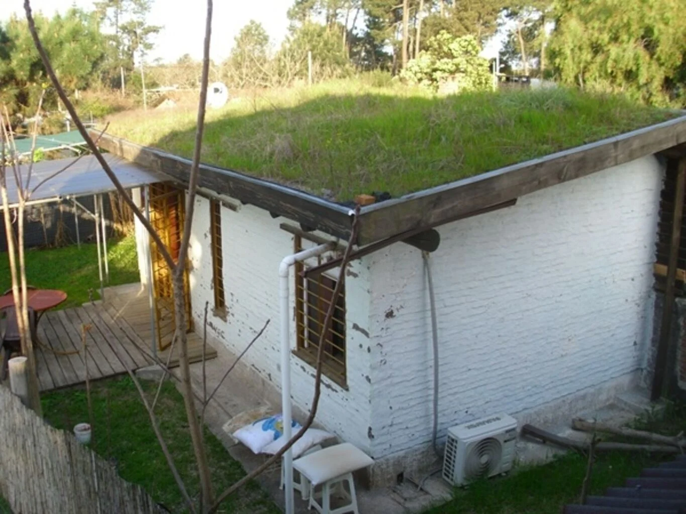 Al fondo, por un lado esta el apartamento de un dormitorio con aire acondicionado, living-comedor con cocina integrada y placares, baño completo. El apartamento es de 28m2, cuenta con un pequeño porche, paredes de ladrillos y el techo verde o ecológico.