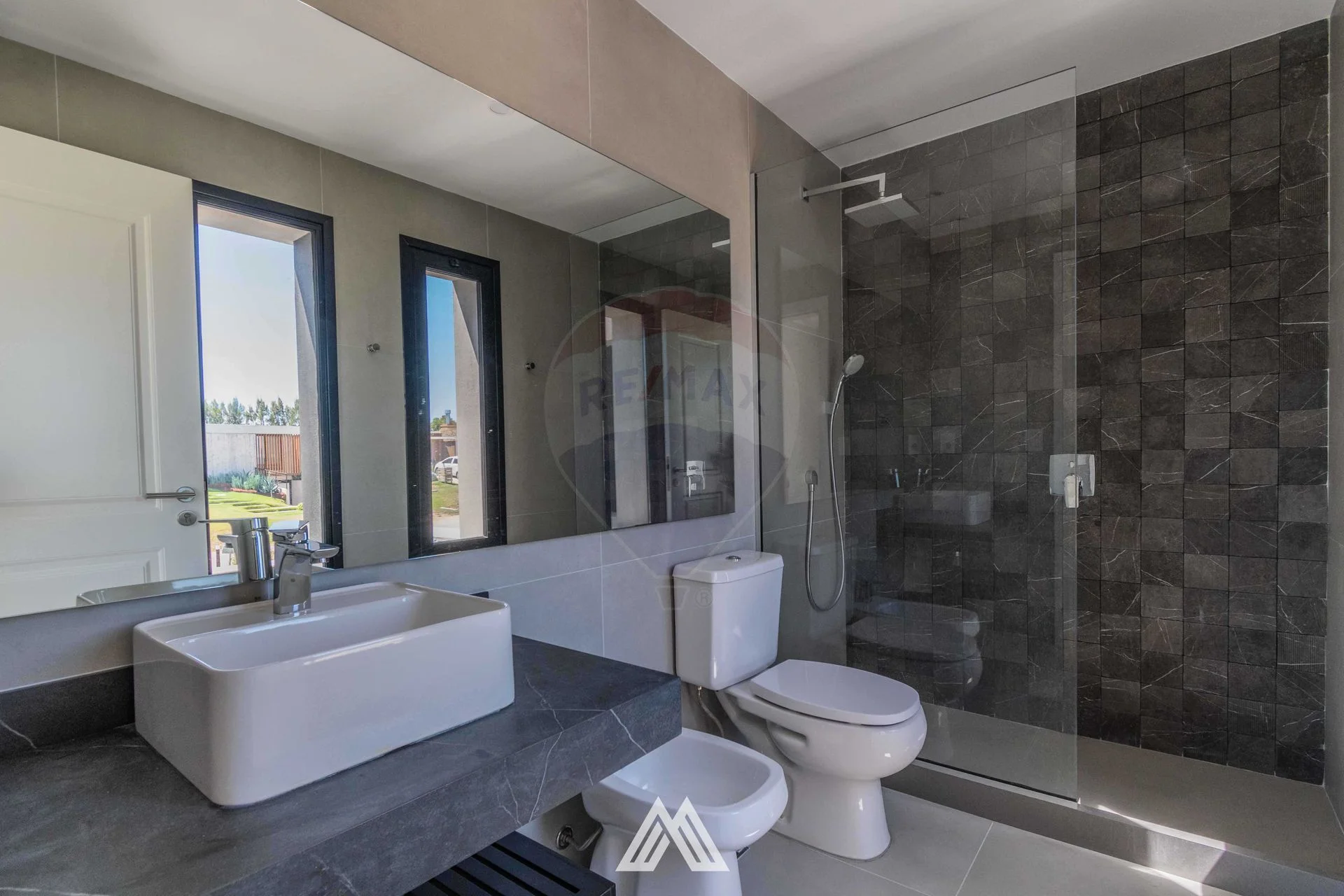 Baño completo con mampara de vidrio.