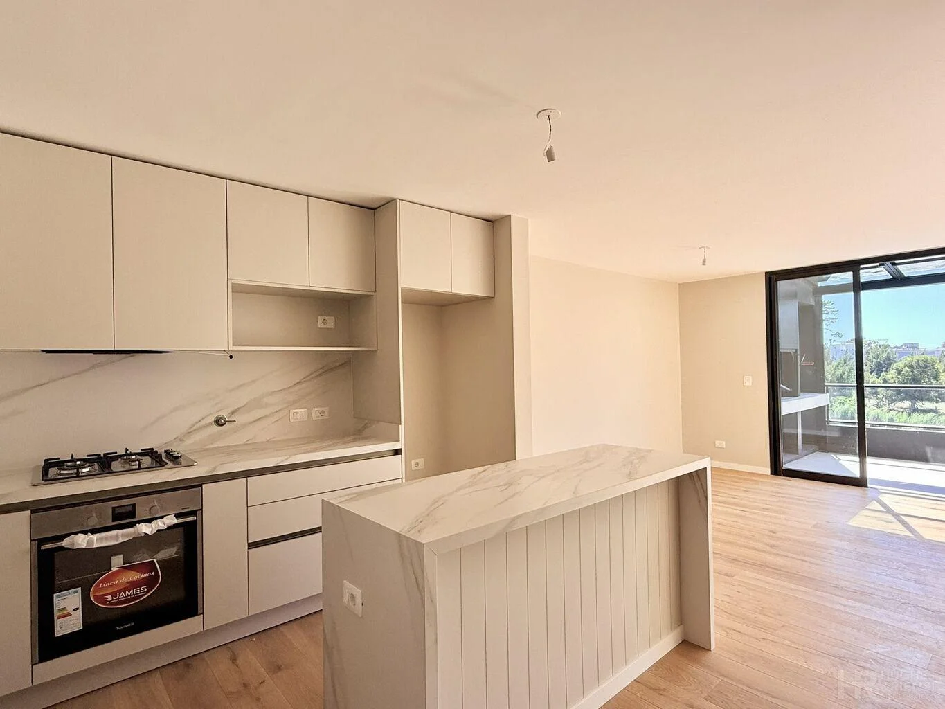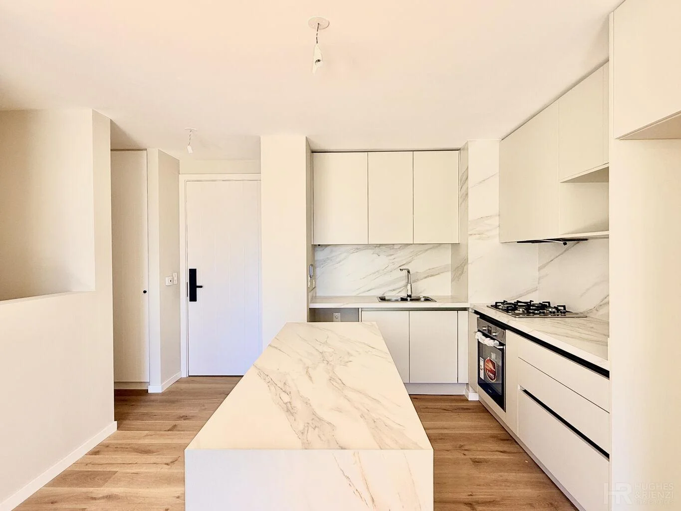 Living comedor con cocina integrada y salida a terraza con parrillero.