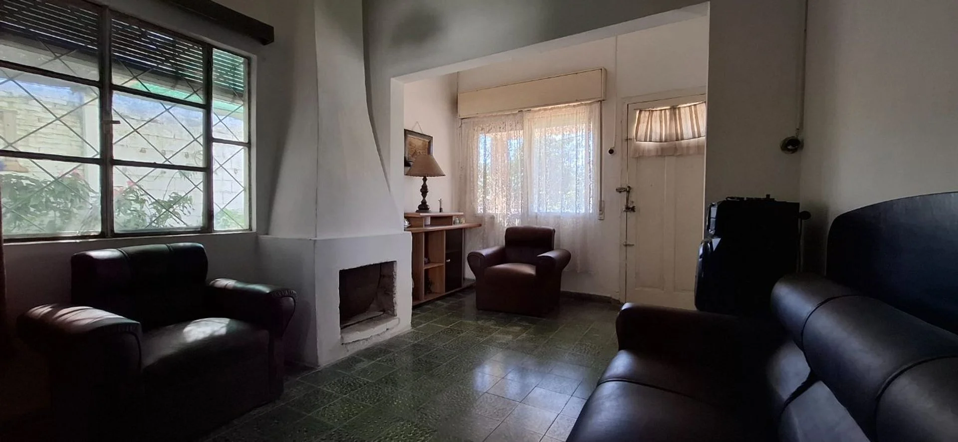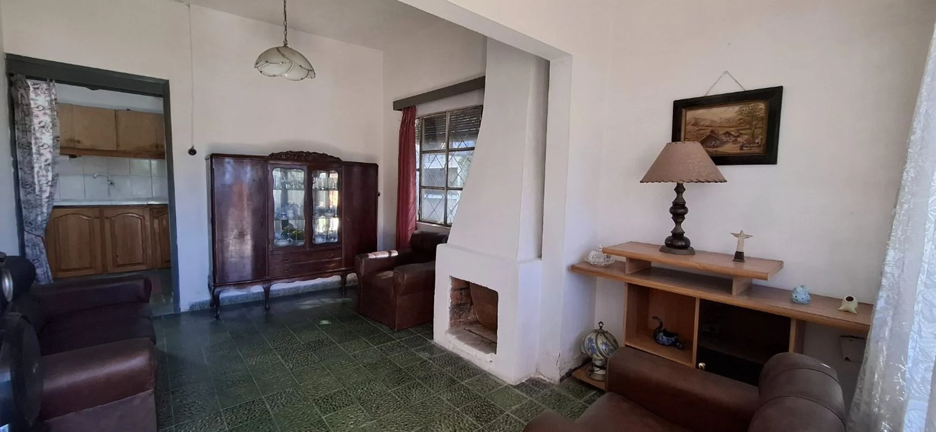 - Living con estufa a leña, ventanas al frente y lateral, rejas y persiana.
