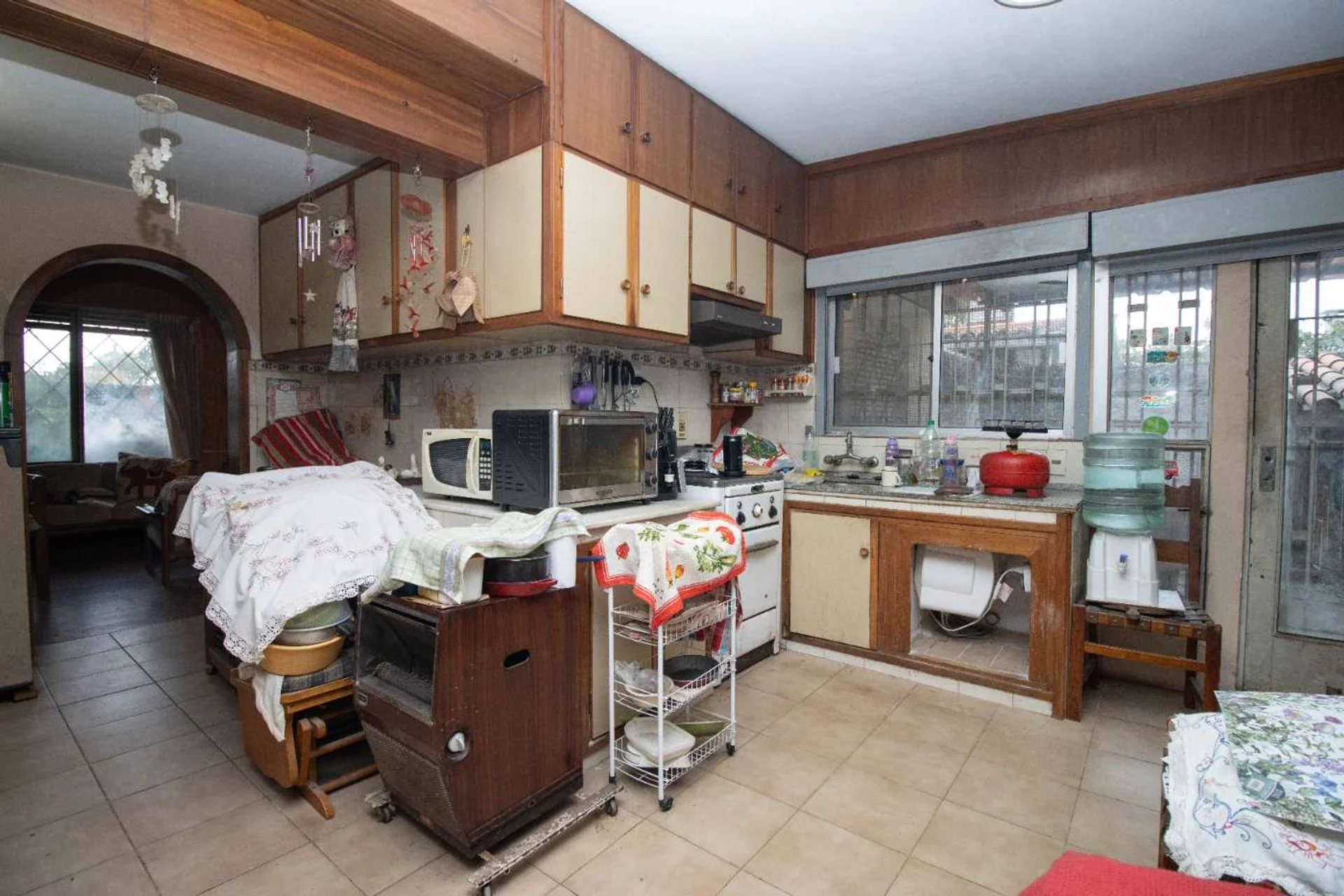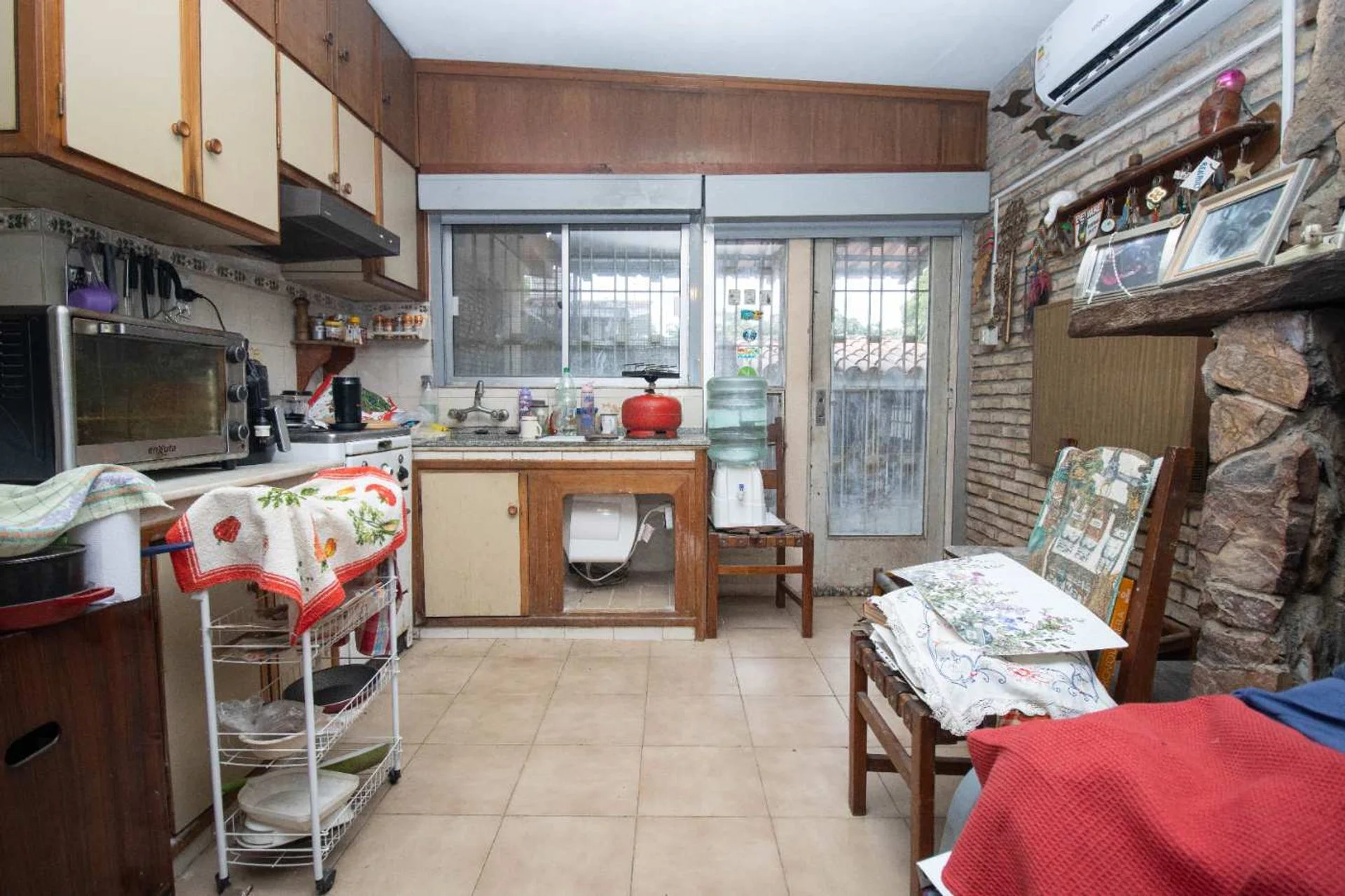Nos vamos hacia su cocina que posee una muy buena capacidad de guardado, que también tiene estufa a leña y que da paso al fondo de la casa.